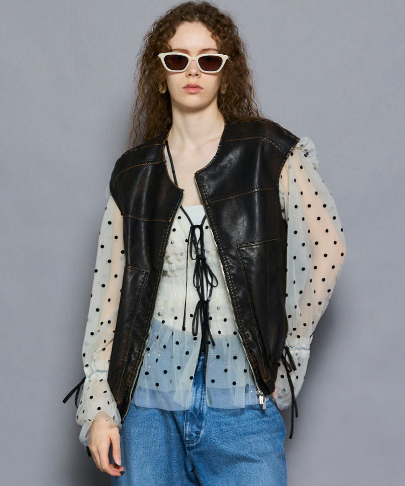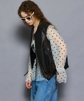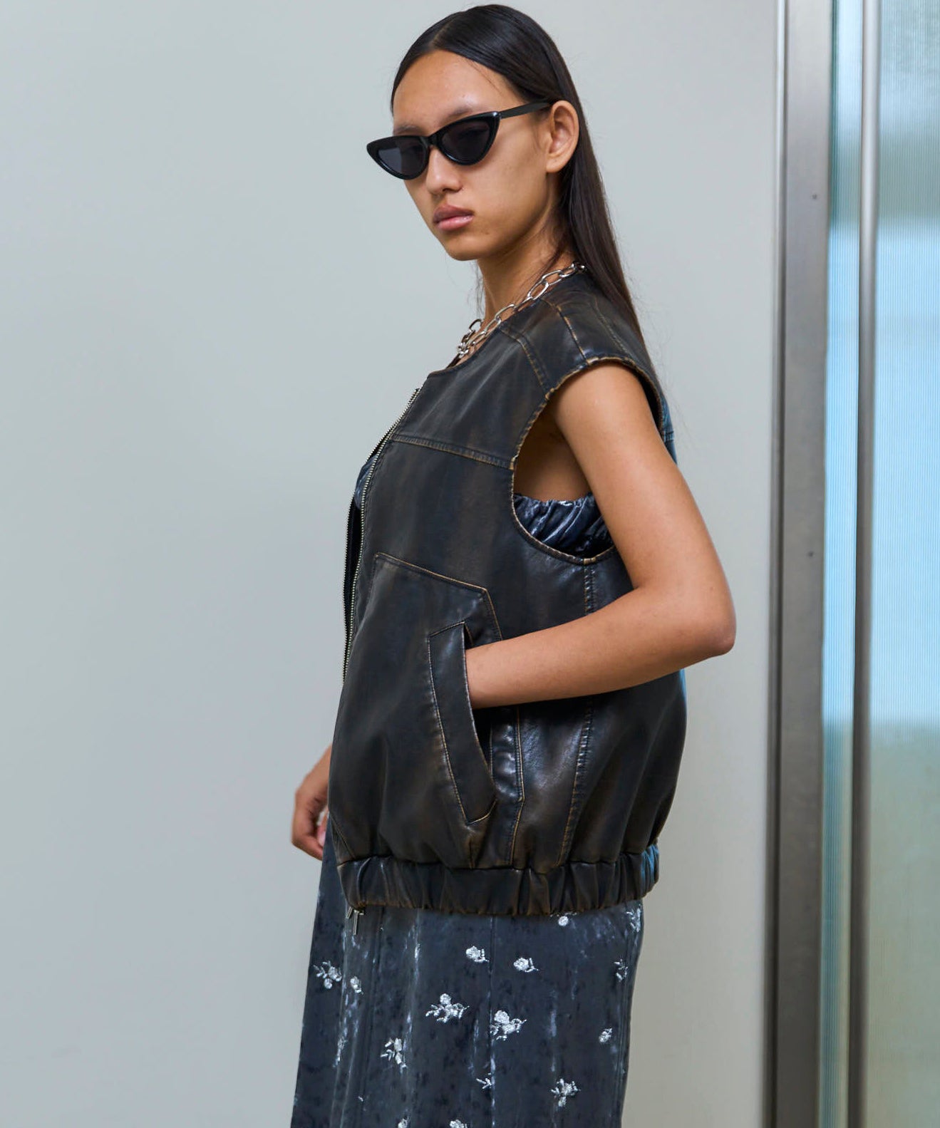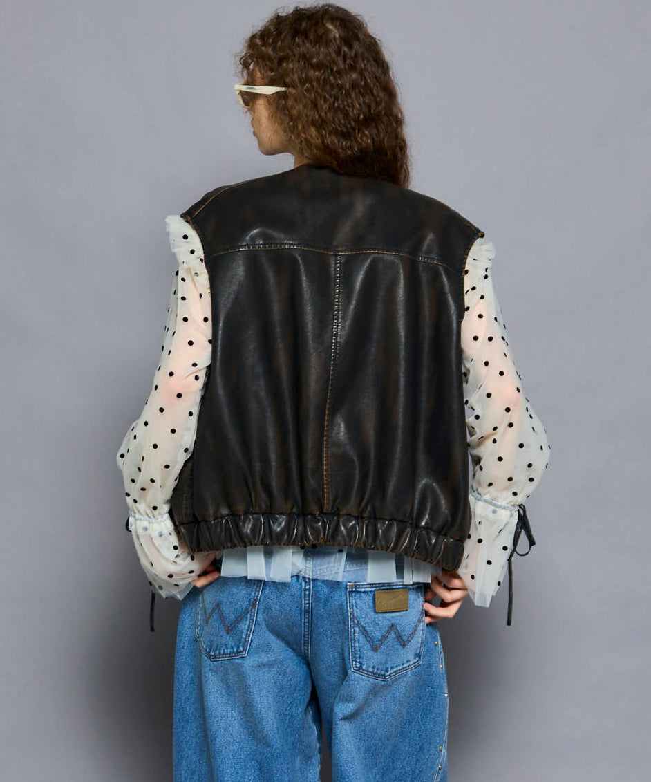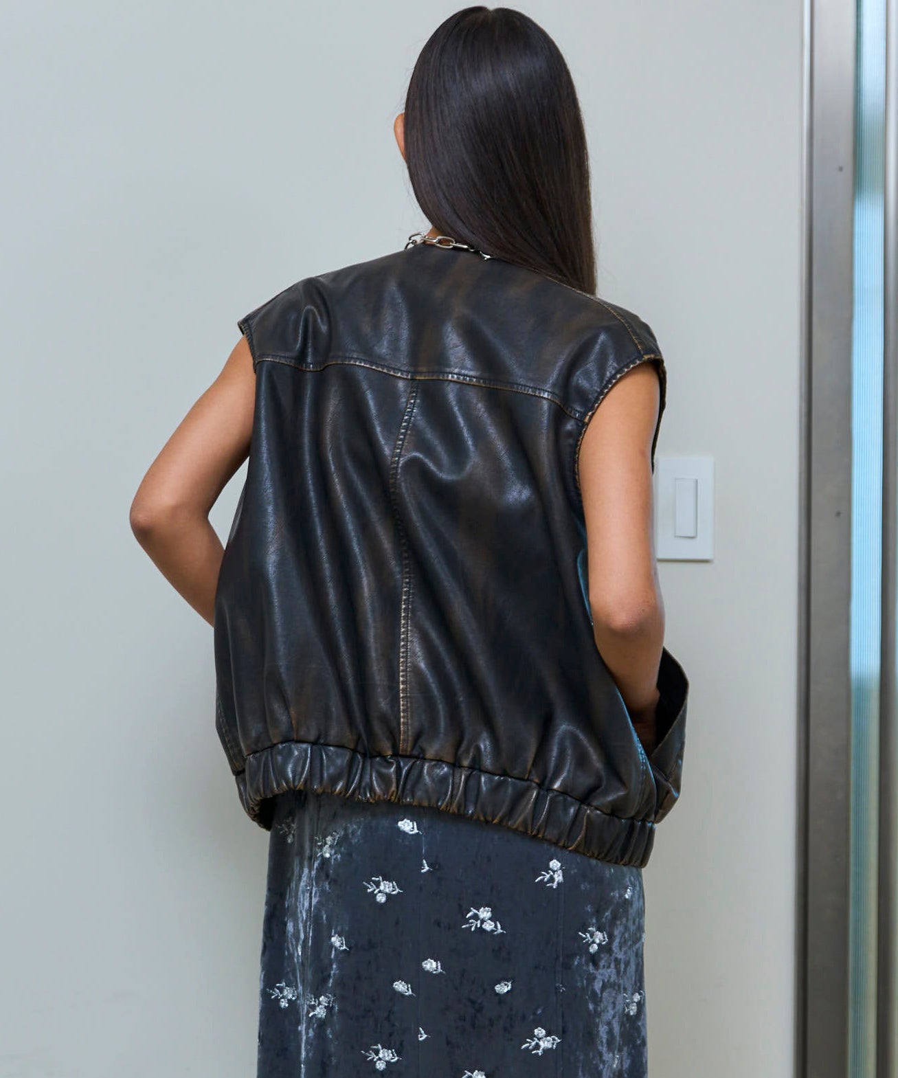 ・裾にギャザーを寄せることで、ふんわりと丸みのあるシルエットに仕上げた、甘さとエッジの絶妙なバランスがポイントのレザーベスト。