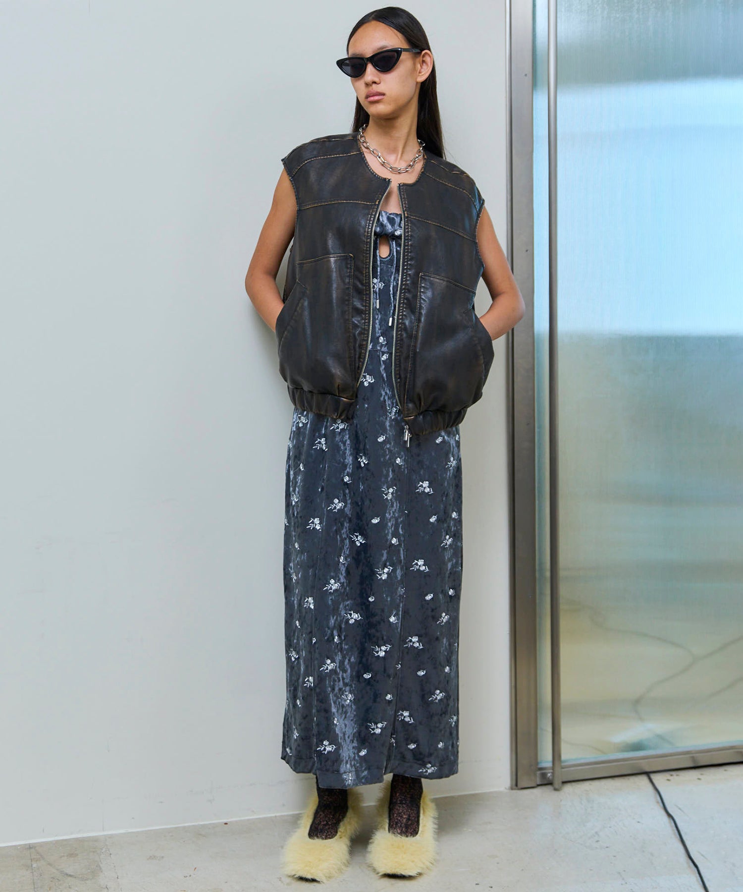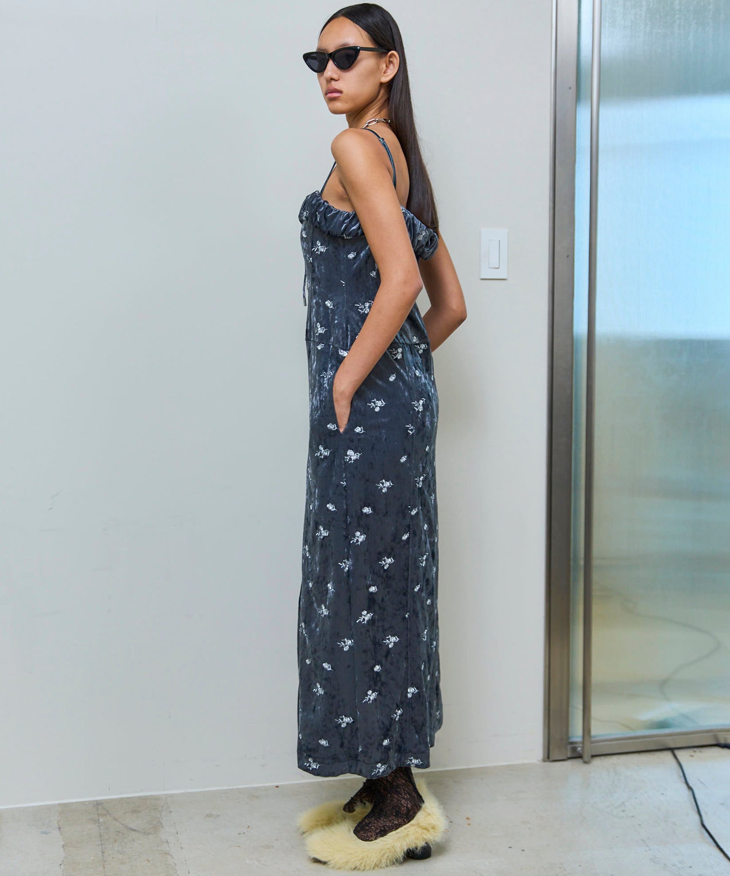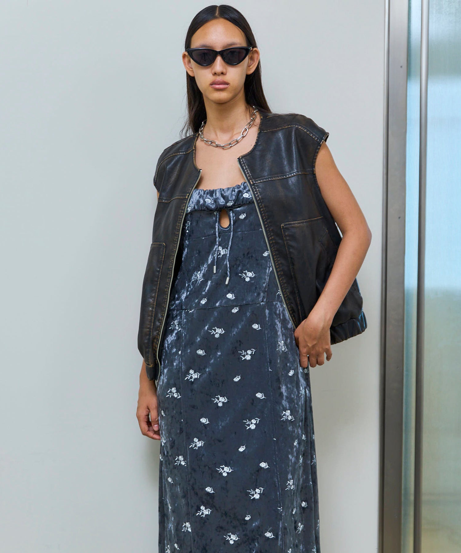 シルバーの刺繍でエッジを効かせることで、フェミニンになりすぎないように仕上げています。