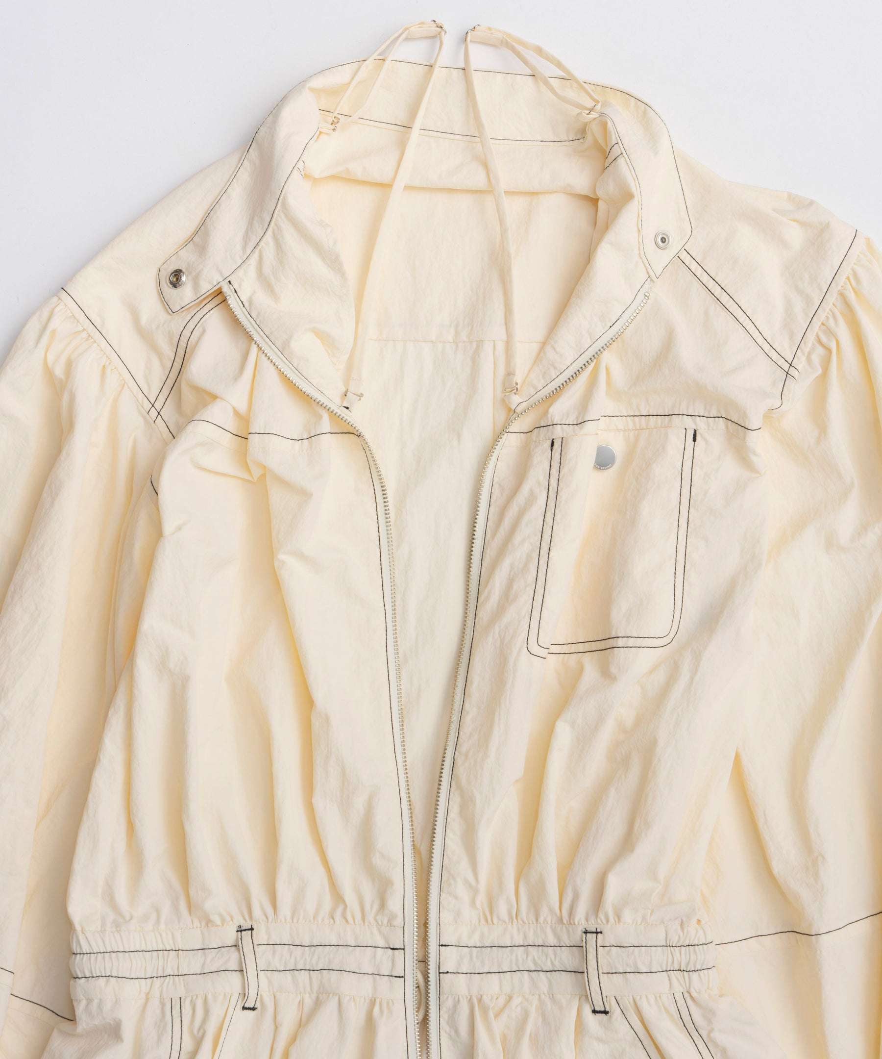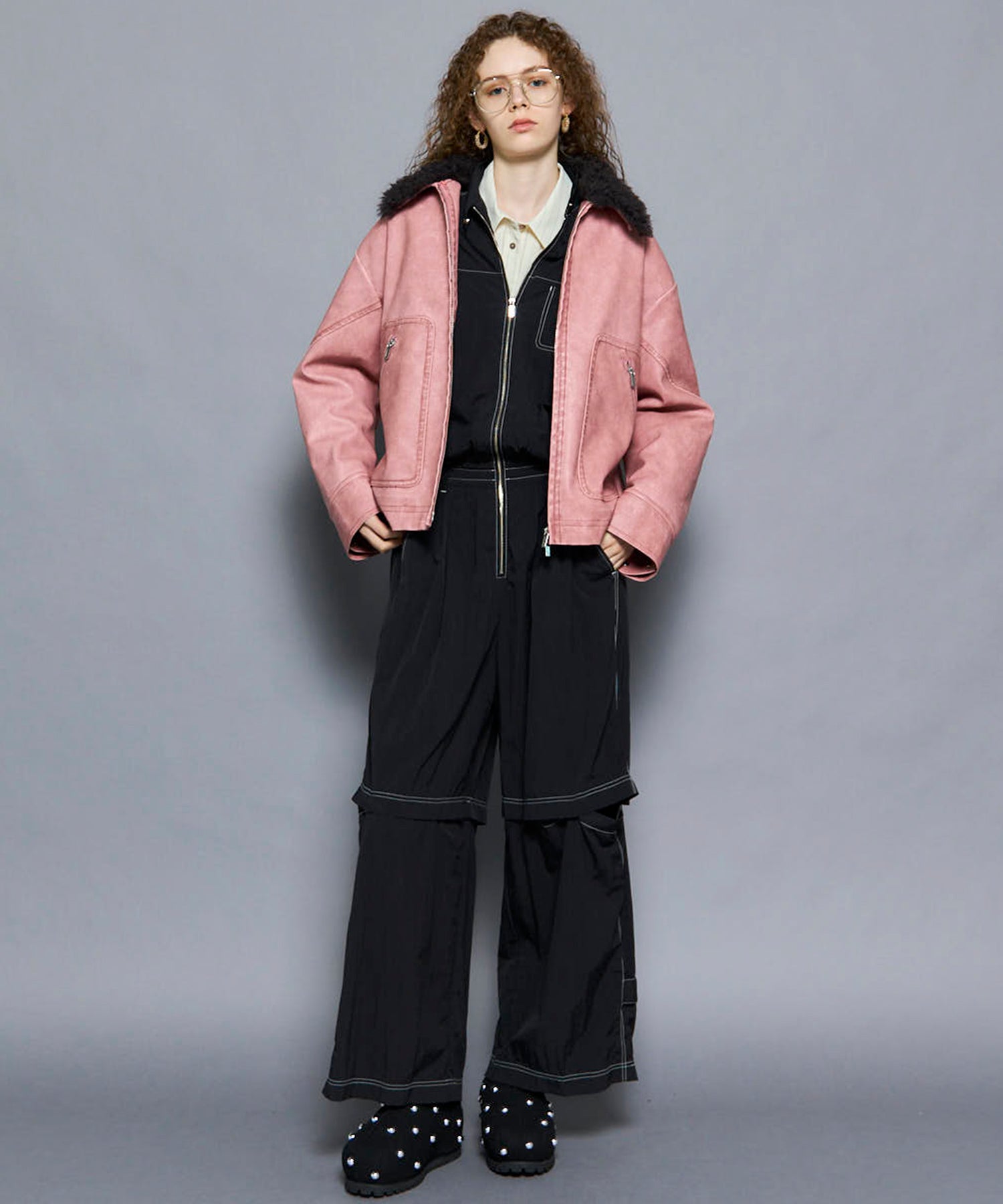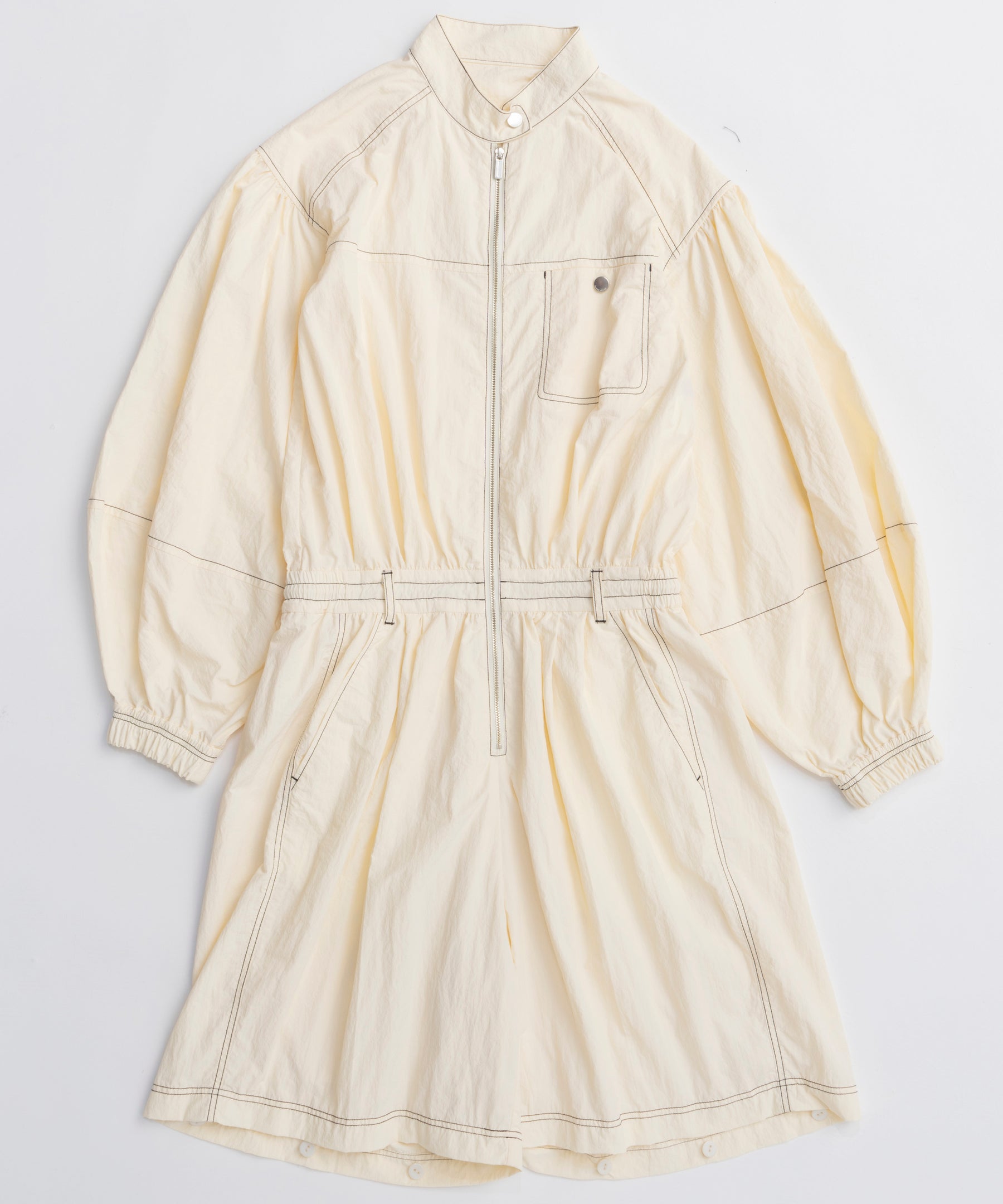・フロントのジップや胸元のポケットがカジュアルなアクセントになりつつ、首元のスタンドカラーが全体をすっきりと見せてくれます。