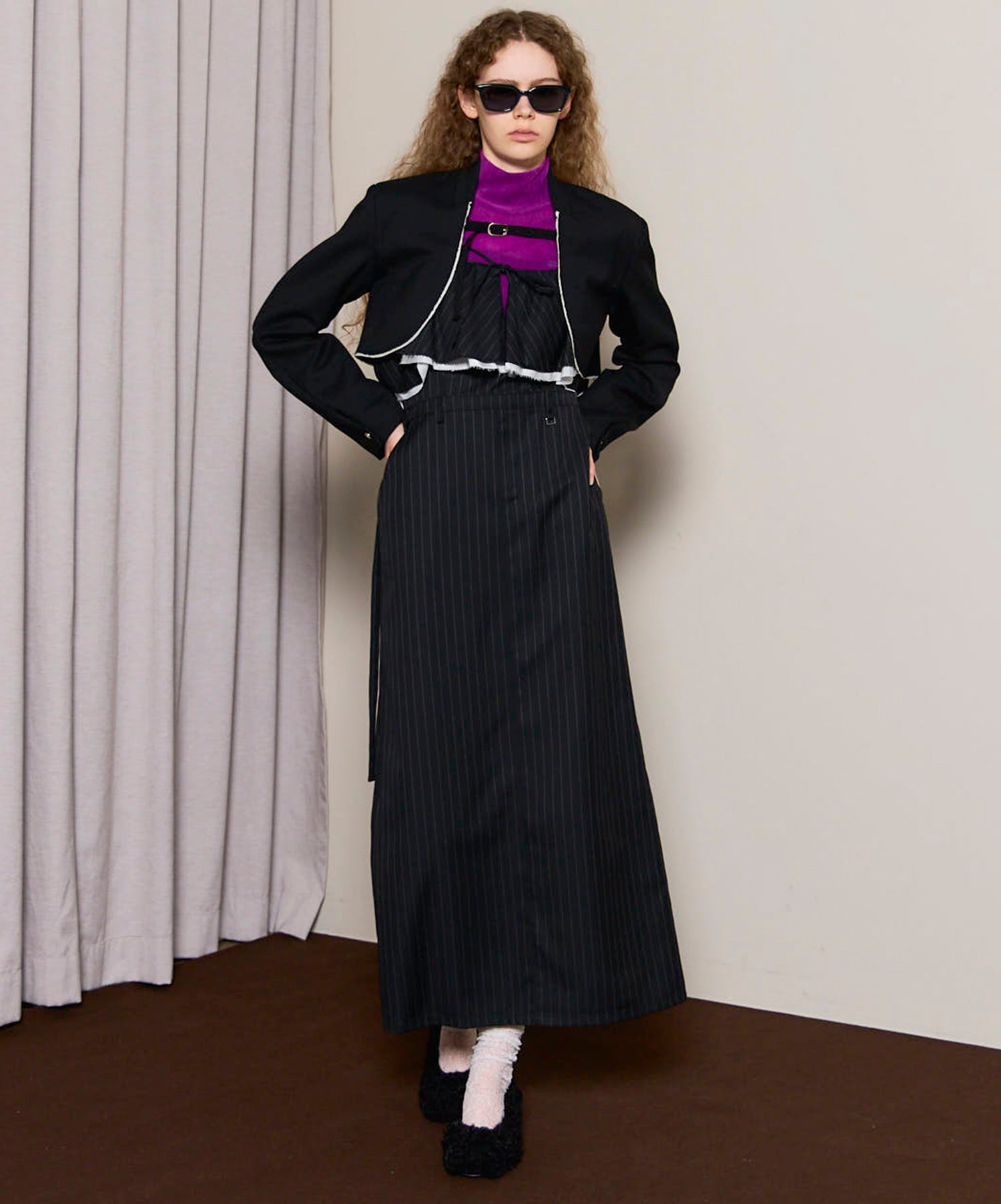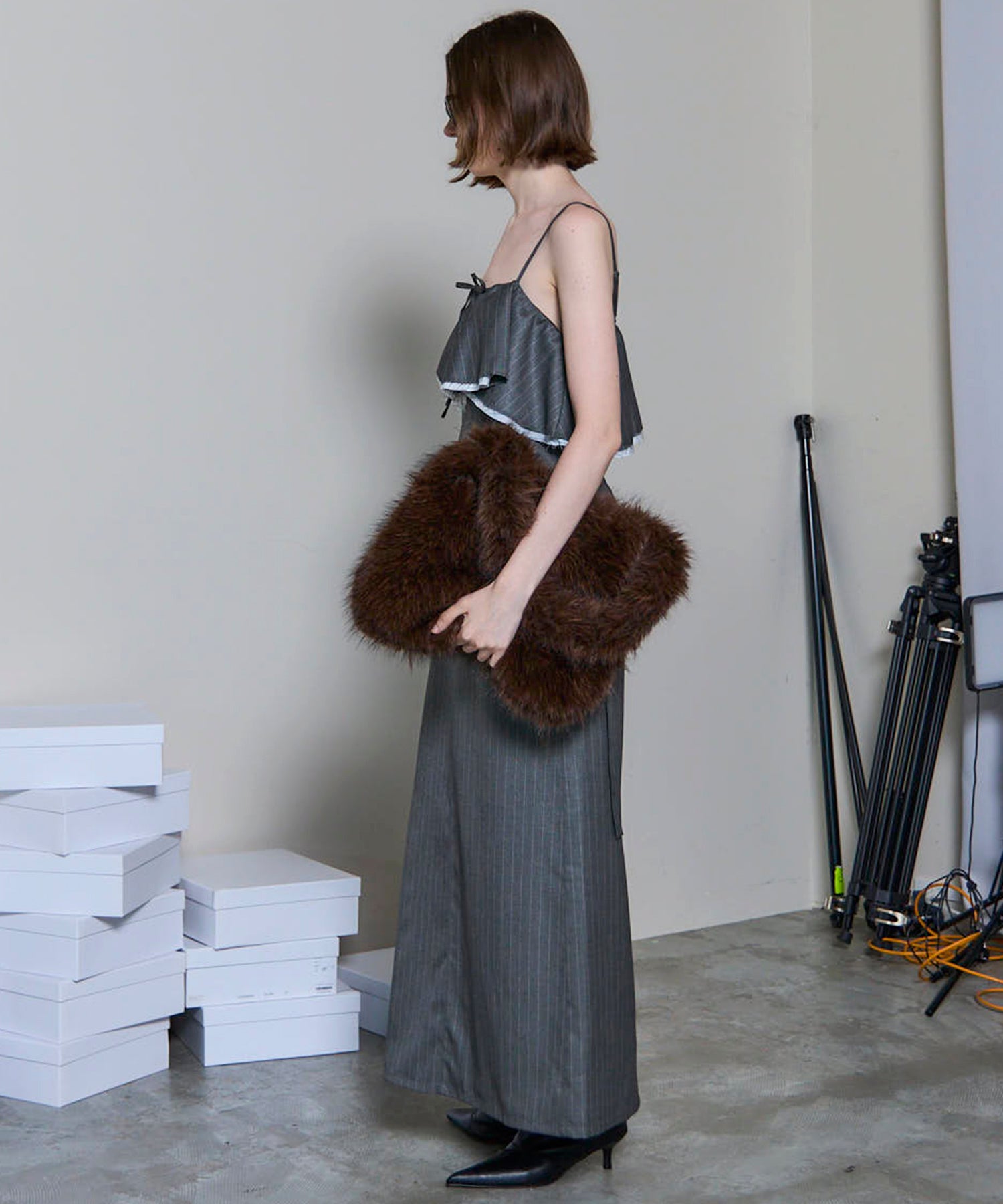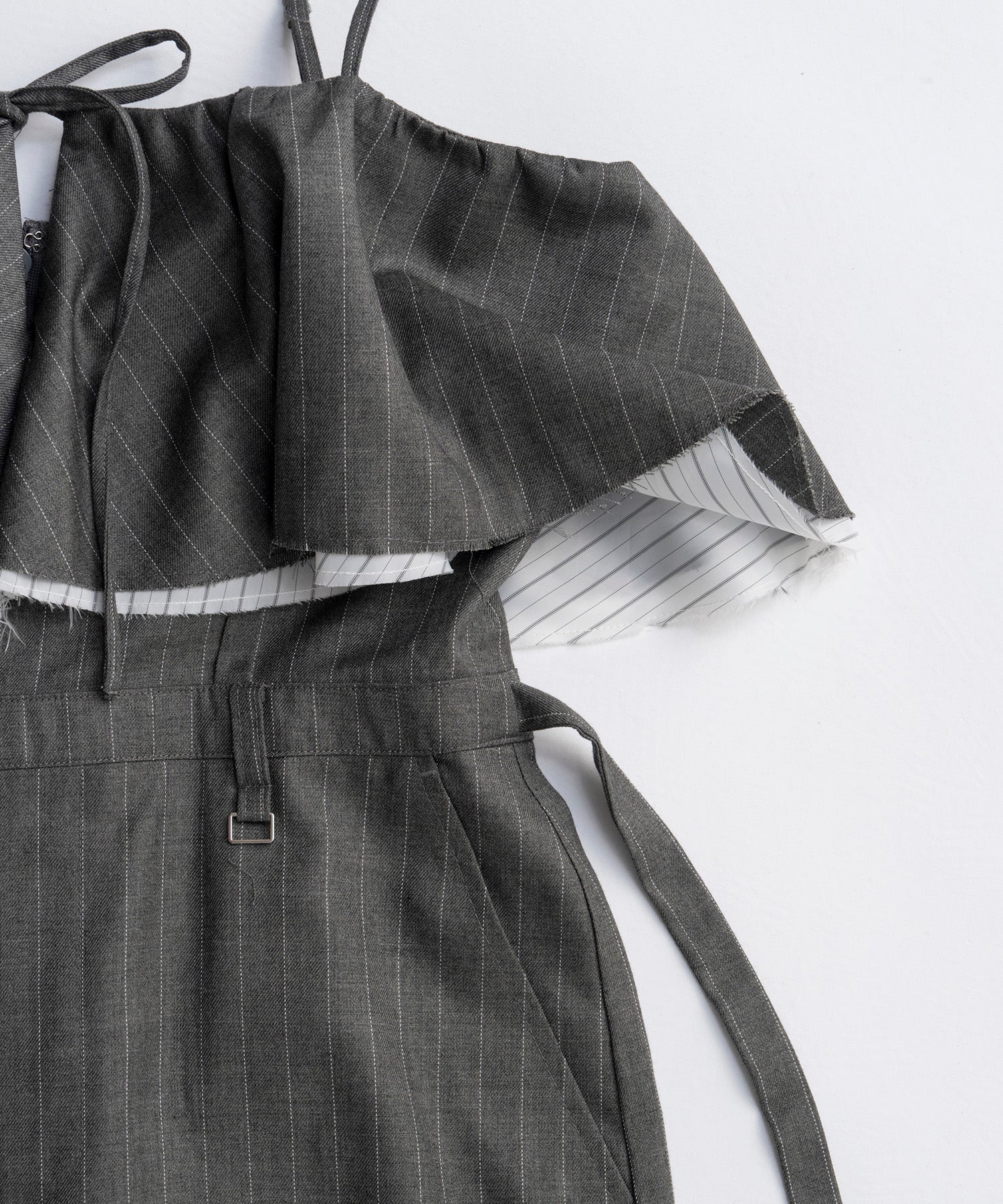 胸元のフリルディテールが程よくフェミニンな印象を添え、シンプルながらも存在感のある一着に仕上がっています。