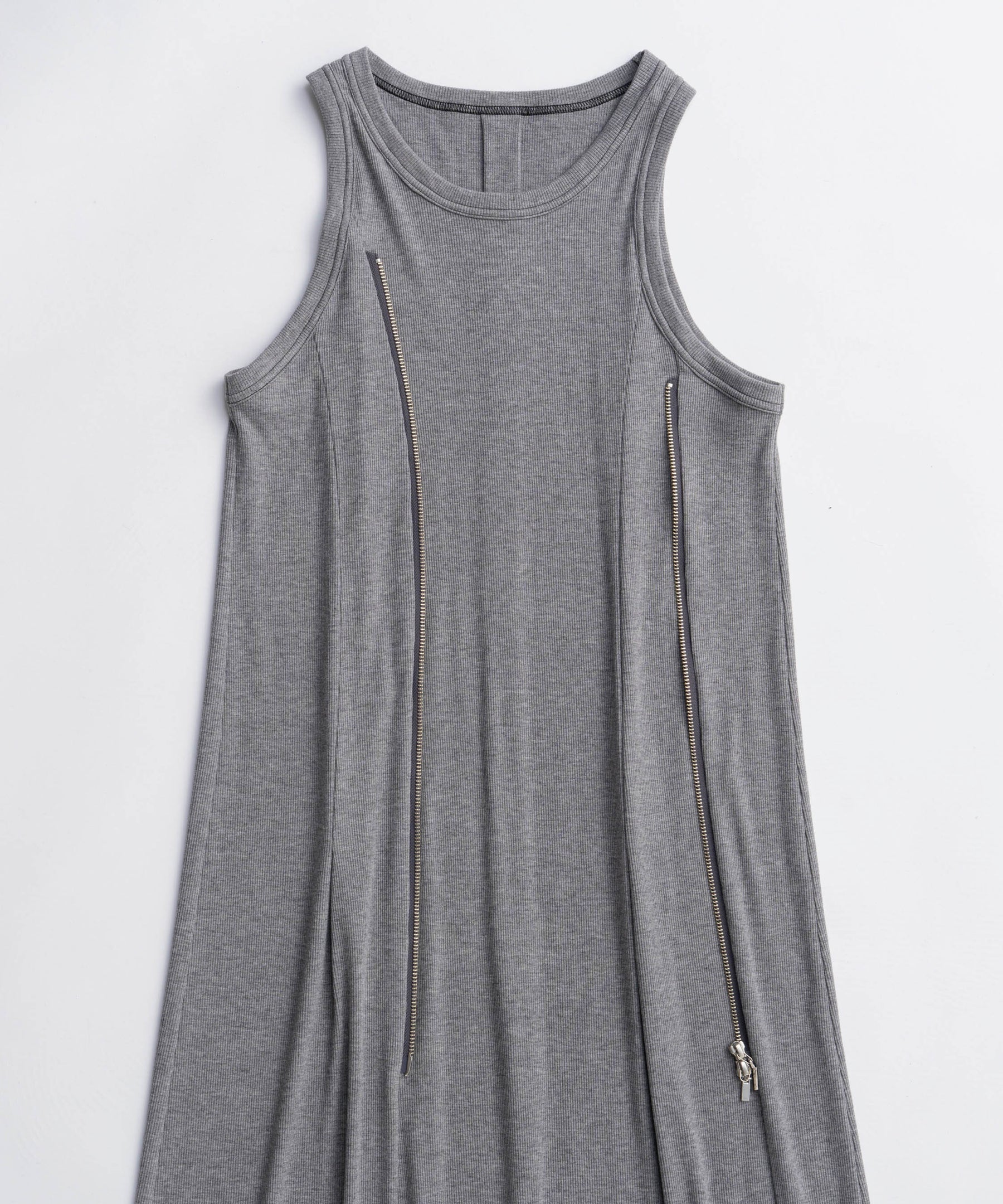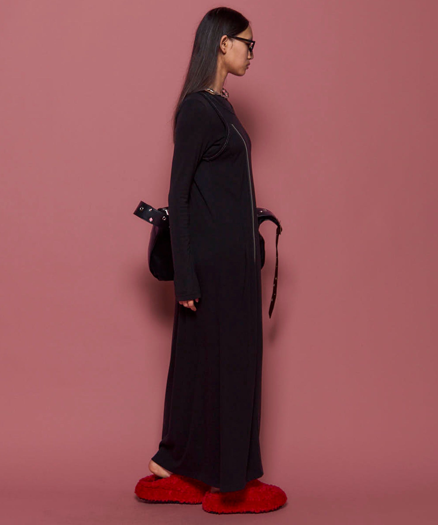 ・フロントに施されたファスナーを閉じれば、自然とウエストマークされ、すっきりとしたシルエットに。