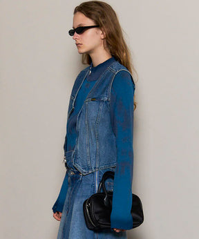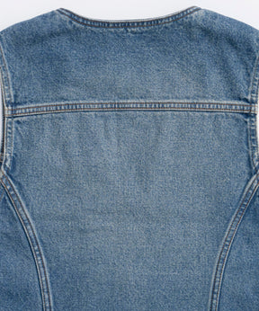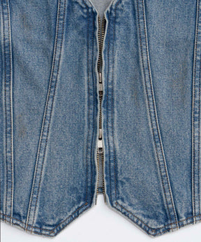 ・シャープな深めのVネックと立体的な切り替えディテールが、クラシカルなデニム素材にモードな印象をプラスしたデニムベスト。