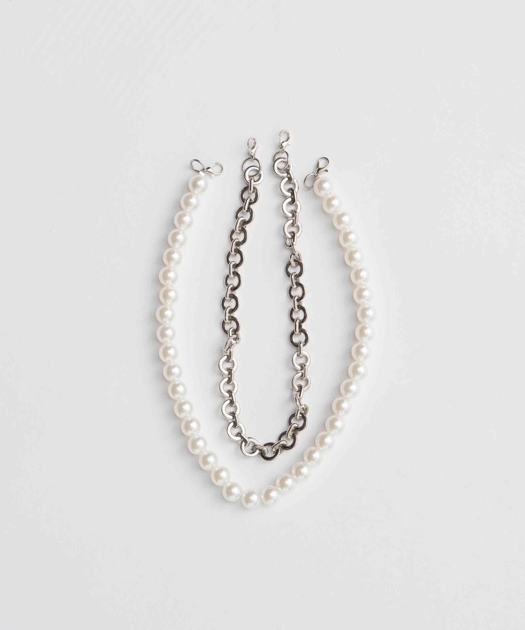 パール、チェーンの2種類の肩紐が付属でついており、取り外し可能なので、スタイリングで遊べるのもポイント。