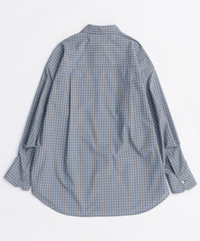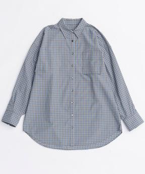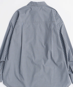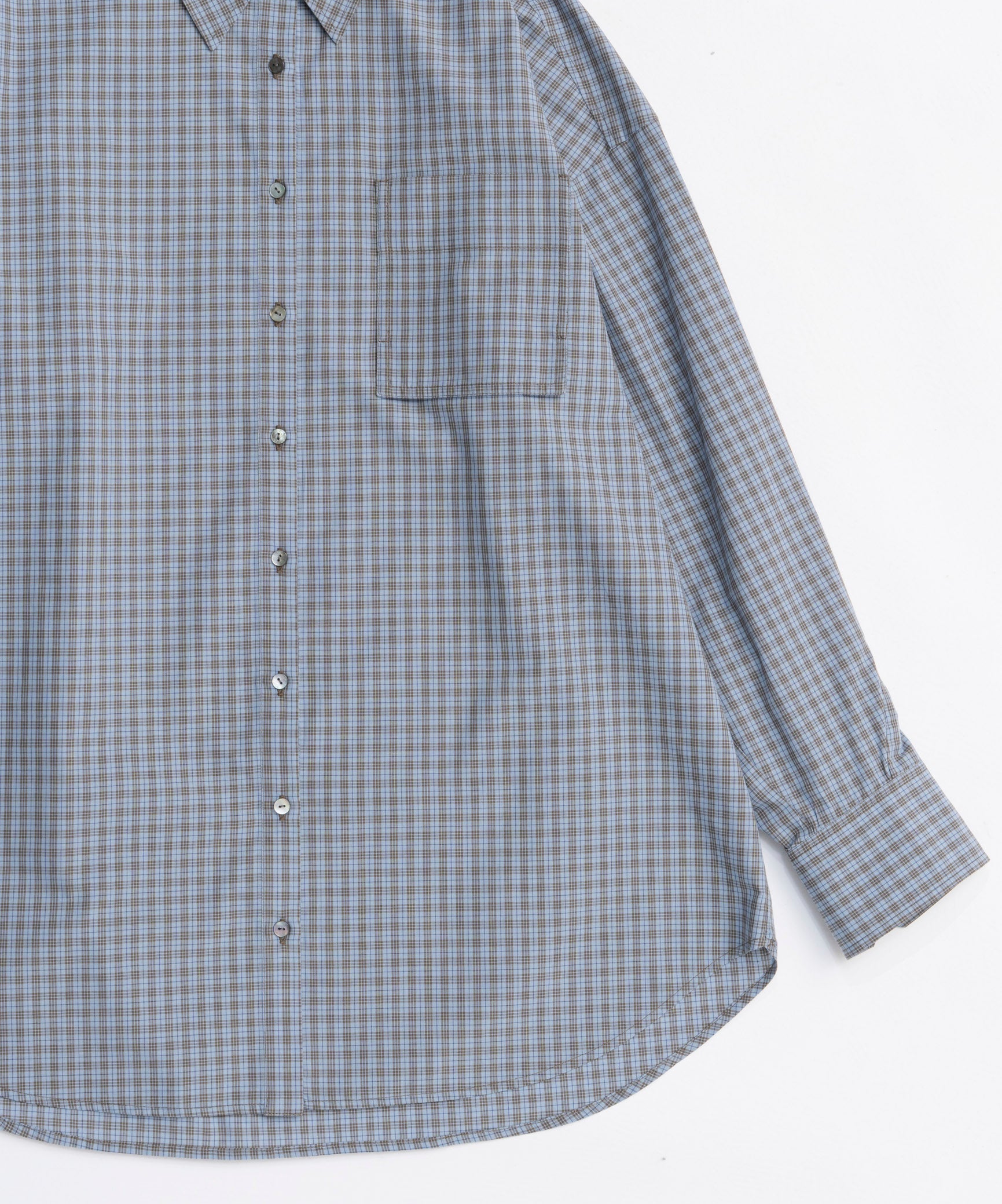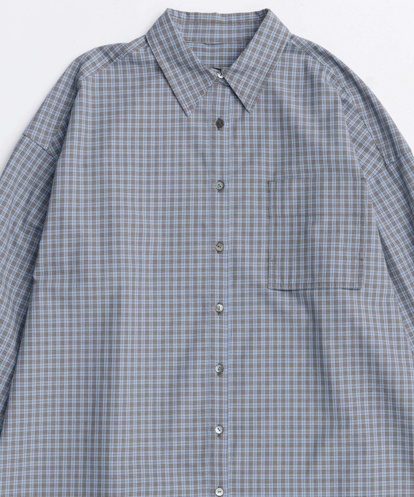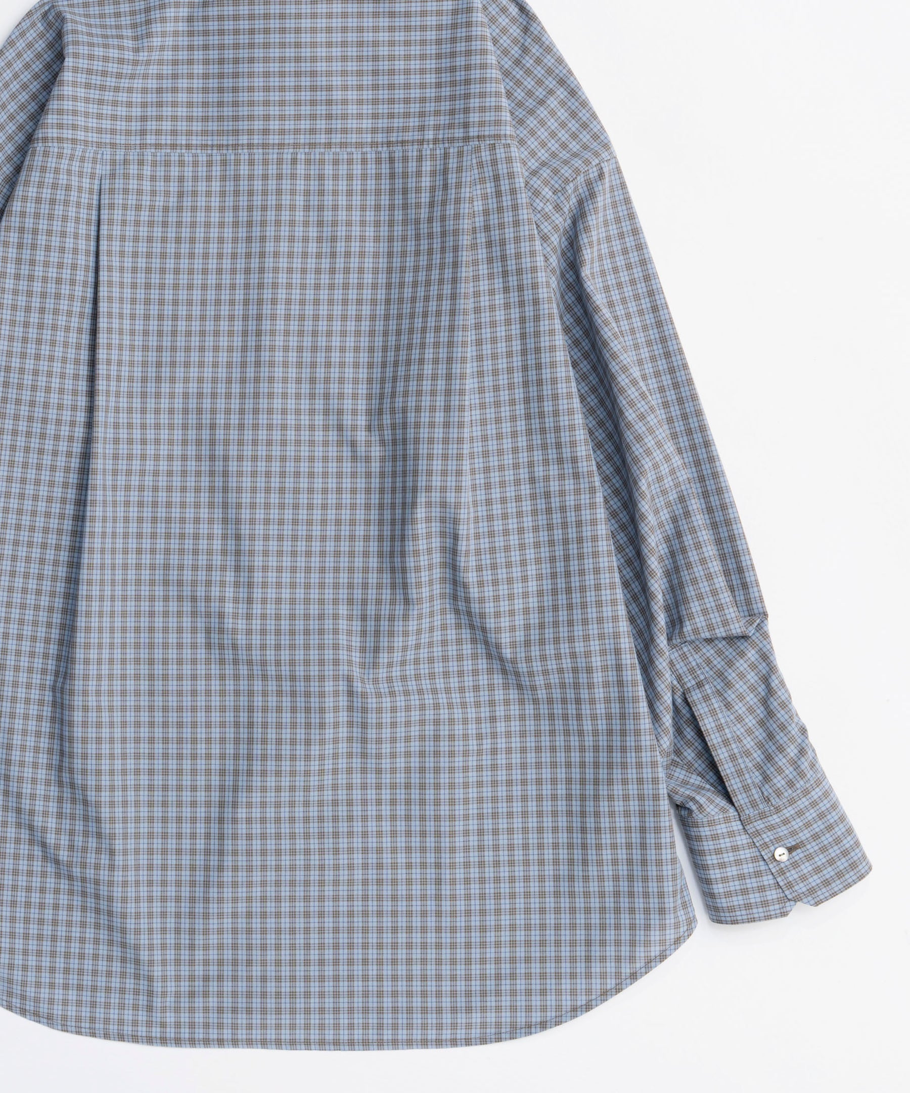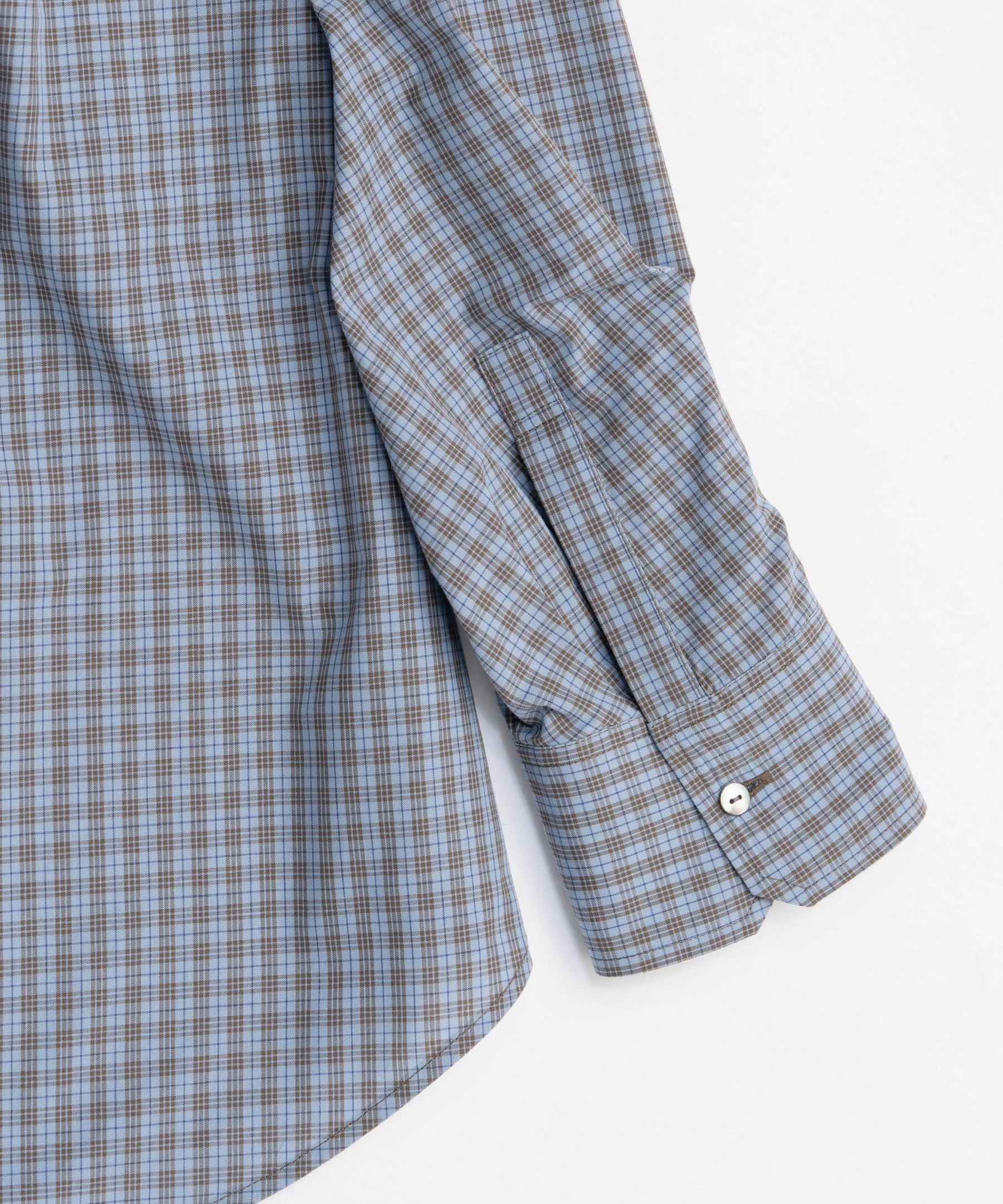 綿ポリエステルでシワになりずらく、ブルーとブラウンのチェックが珍しいシャツ生地。