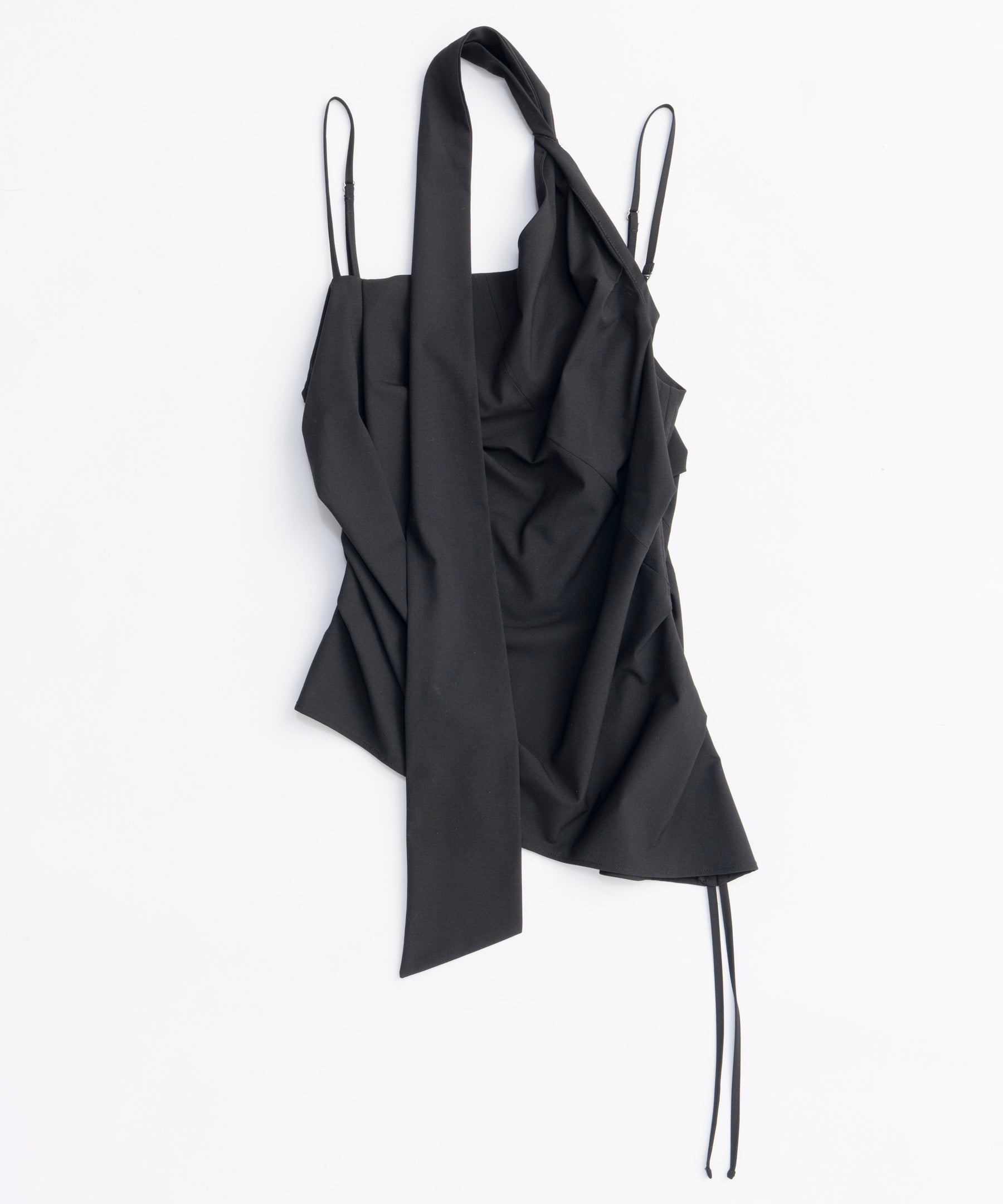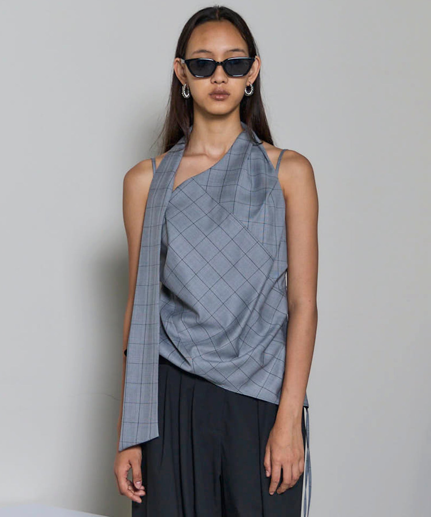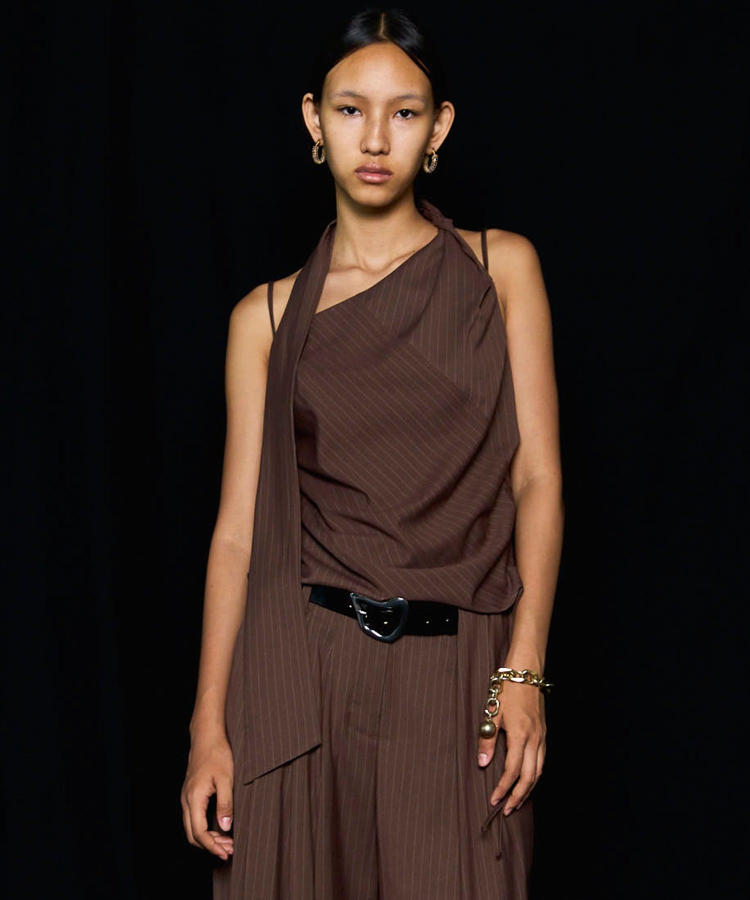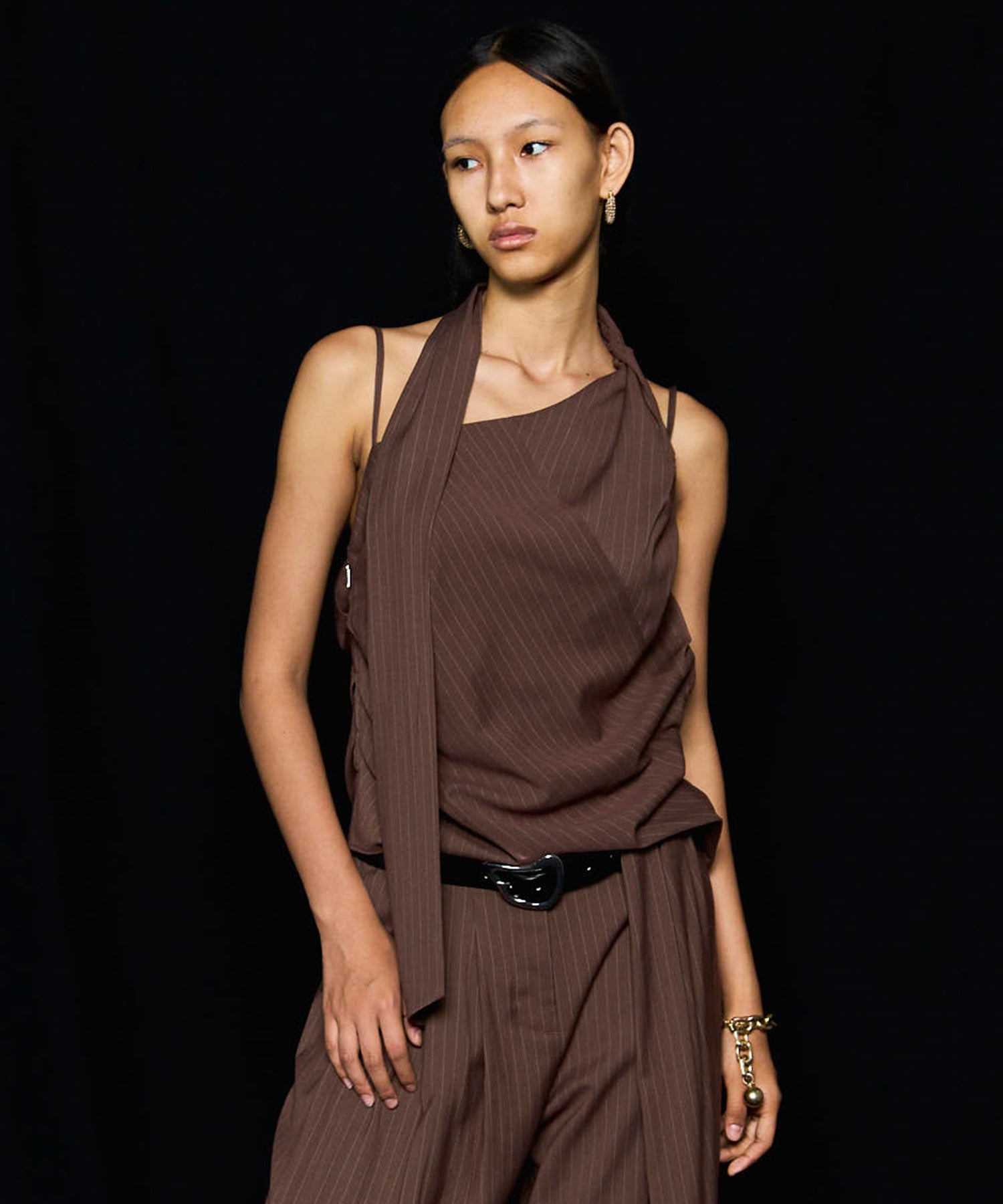 ・スーツ地のクラシックなムードに、アシンメトリーなドレープや長めのタイディテールでひねりを加えた上品でモードな印象のトップス。