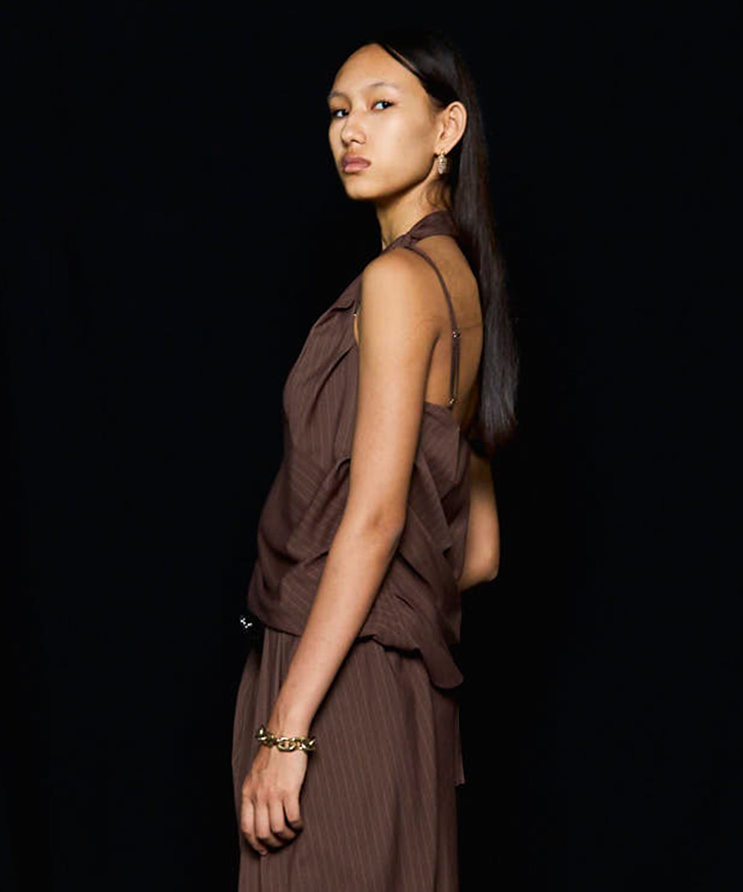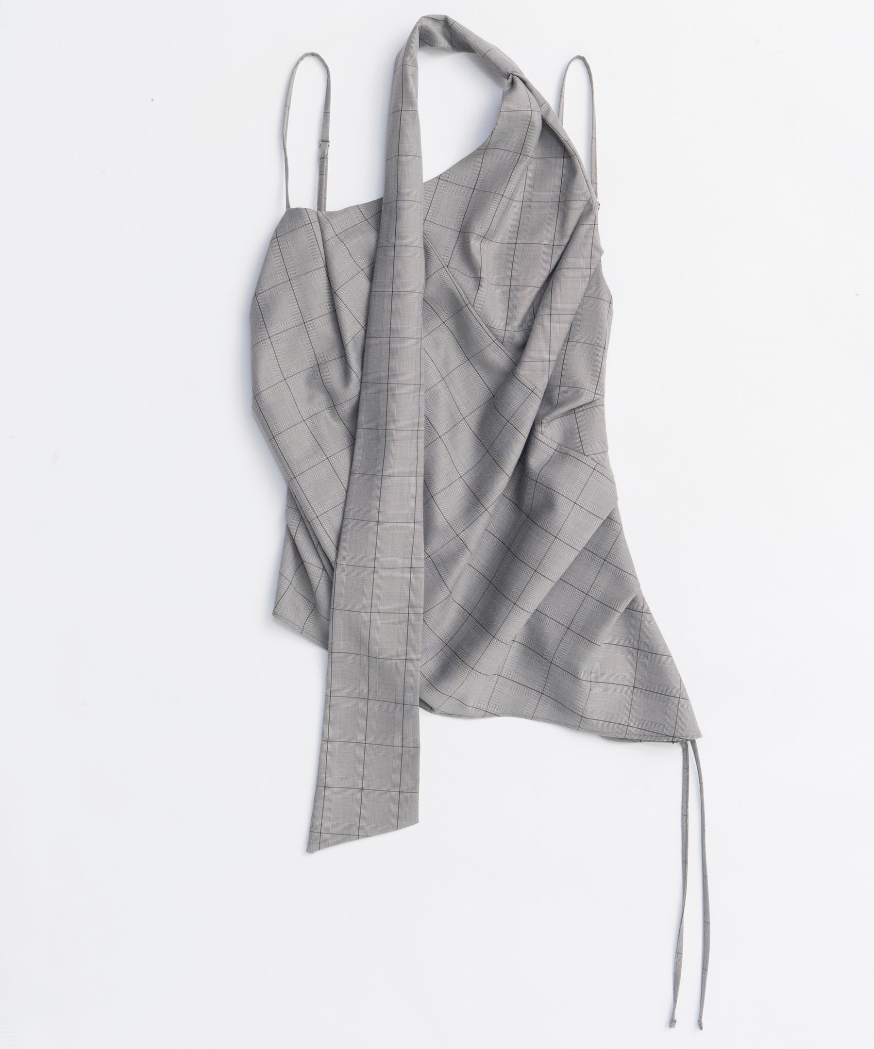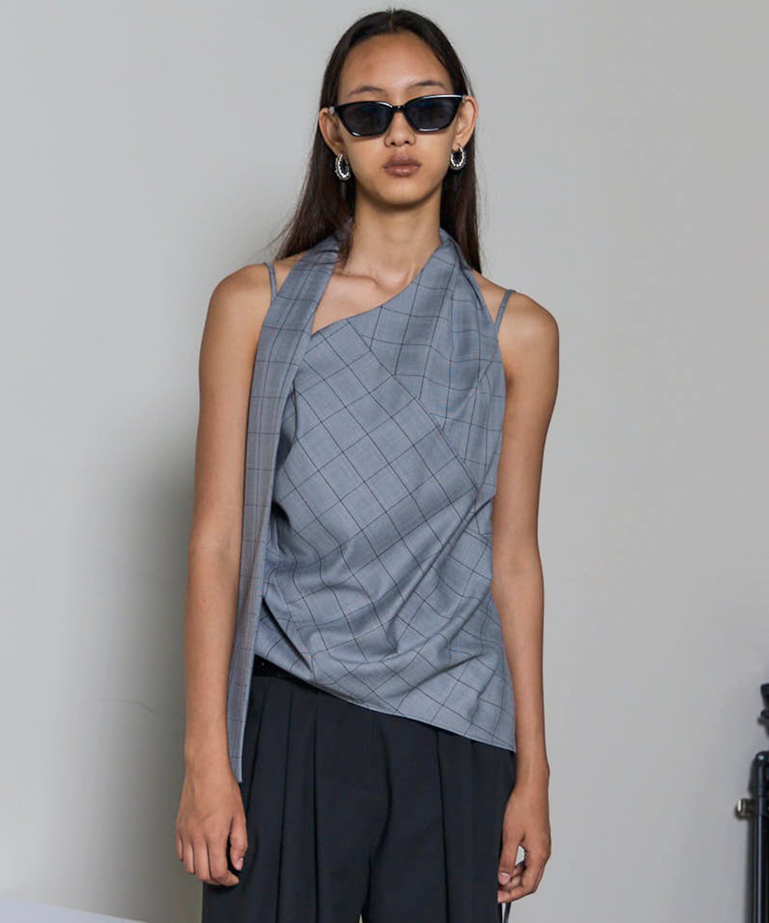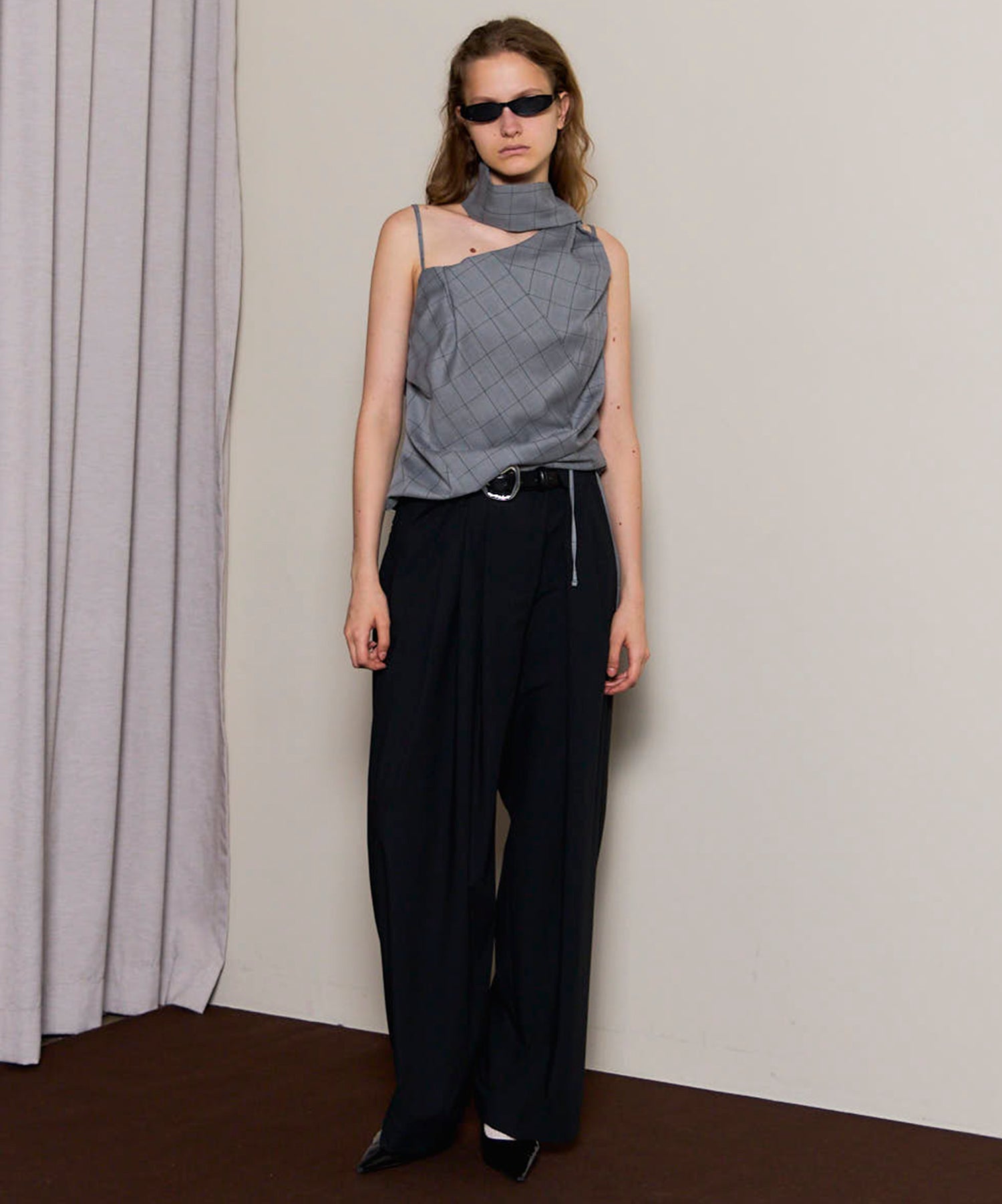 ・スーツ地のクラシックなムードに、アシンメトリーなドレープや長めのタイディテールでひねりを加えた上品でモードな印象のトップス。
