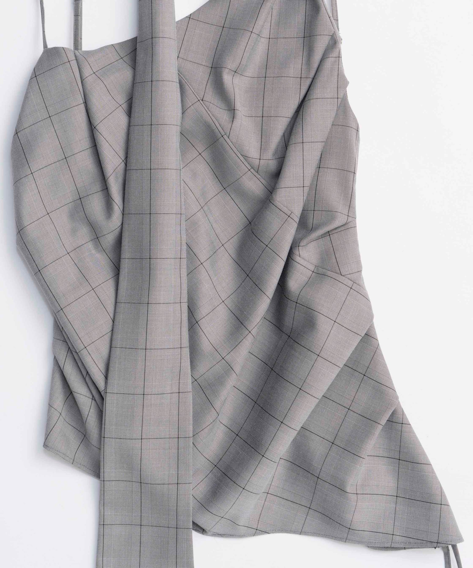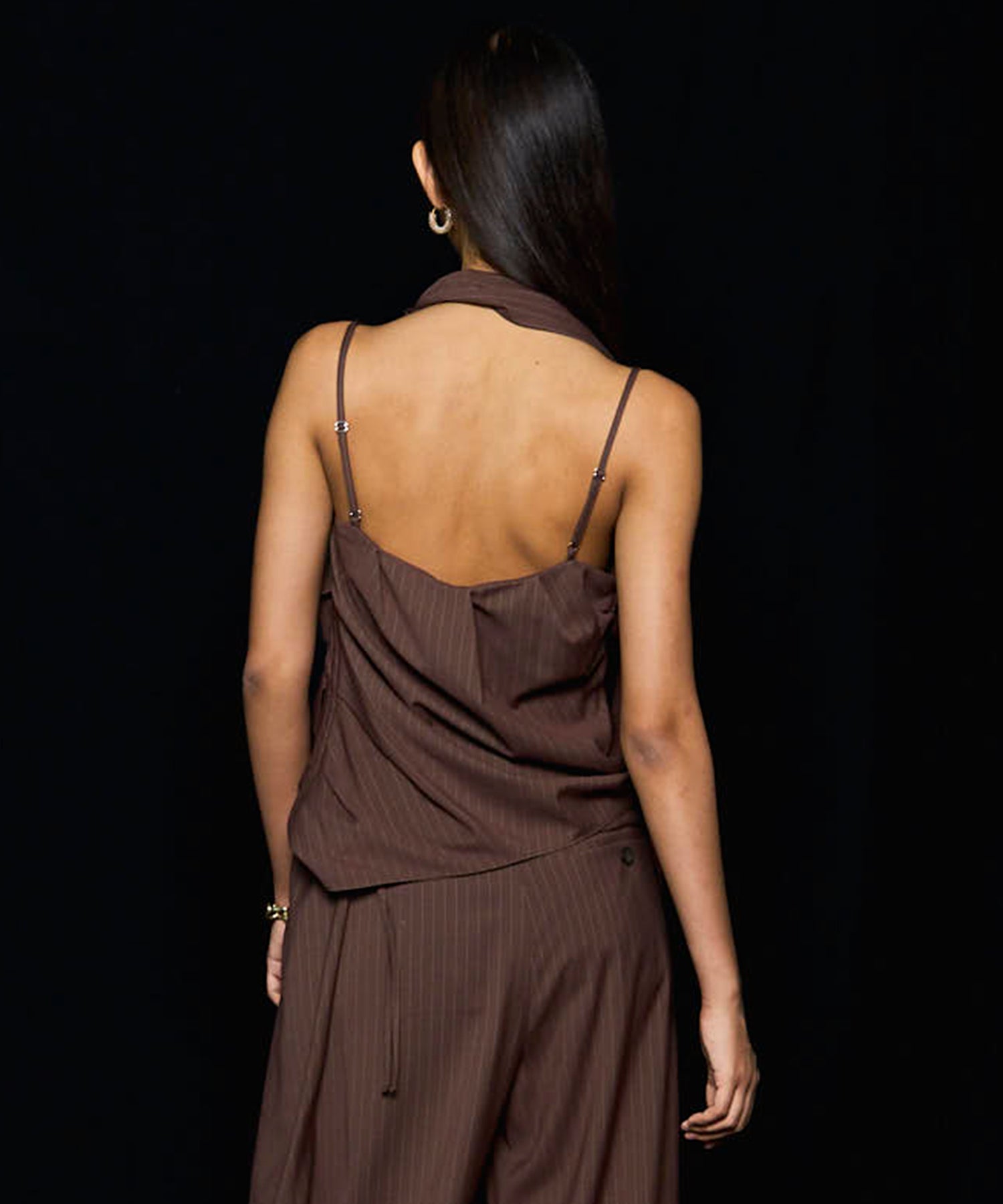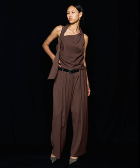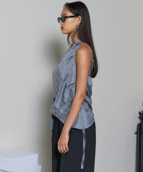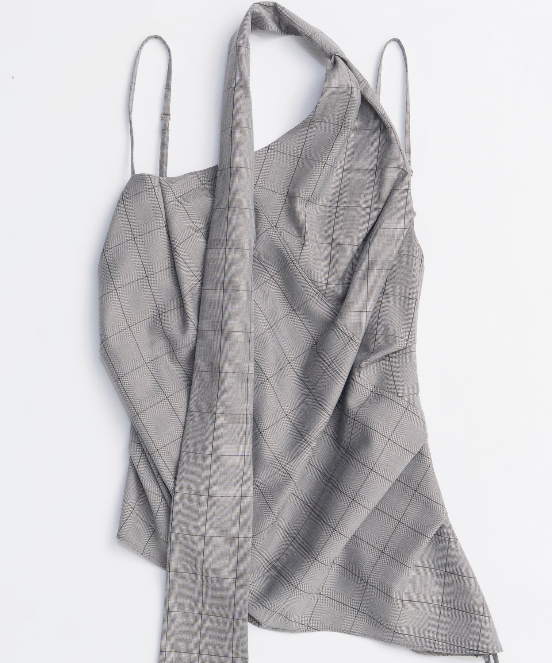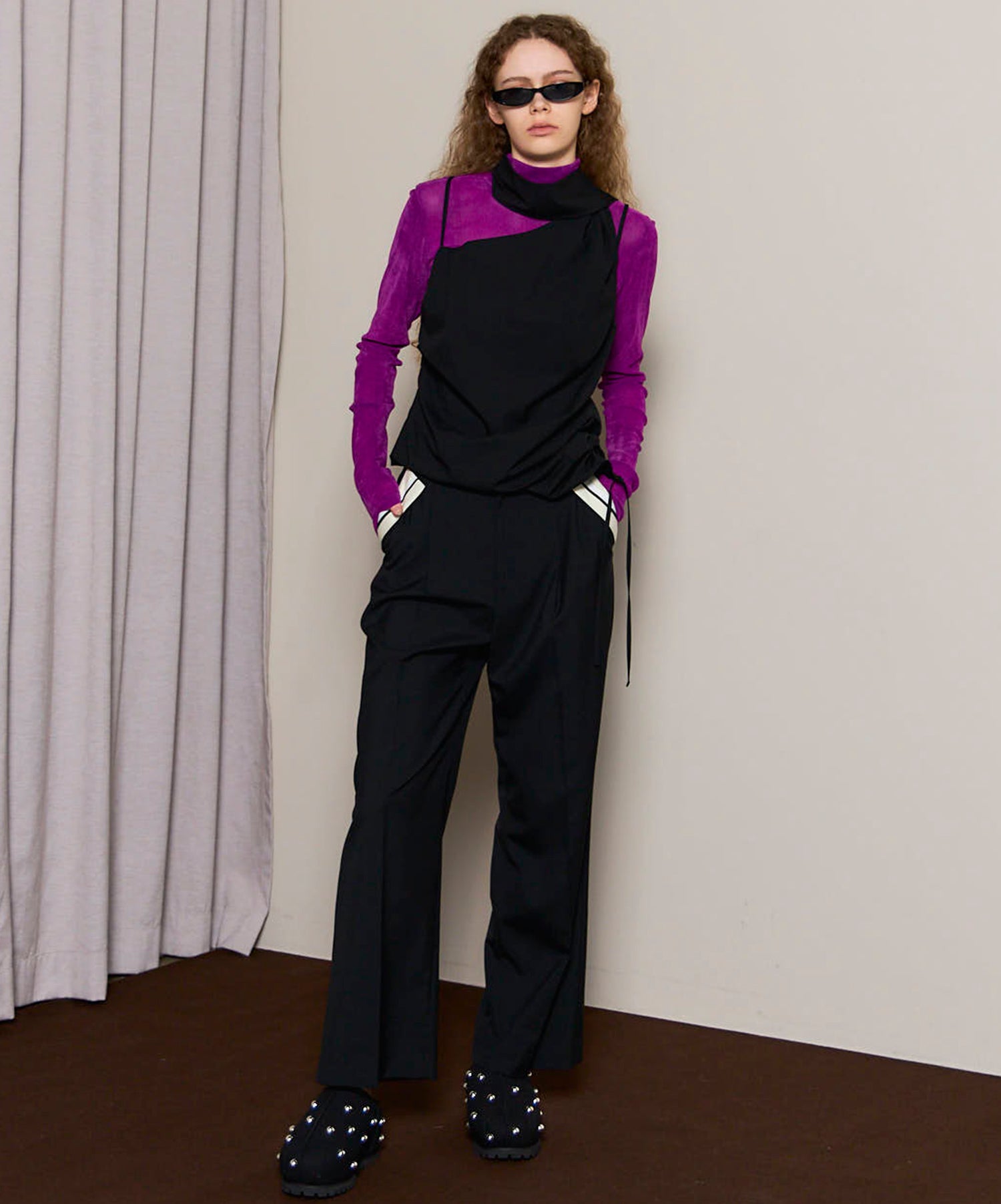 ・スーツ地のクラシックなムードに、アシンメトリーなドレープや長めのタイディテールでひねりを加えた上品でモードな印象のトップス。