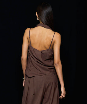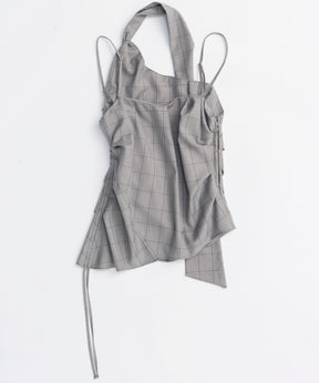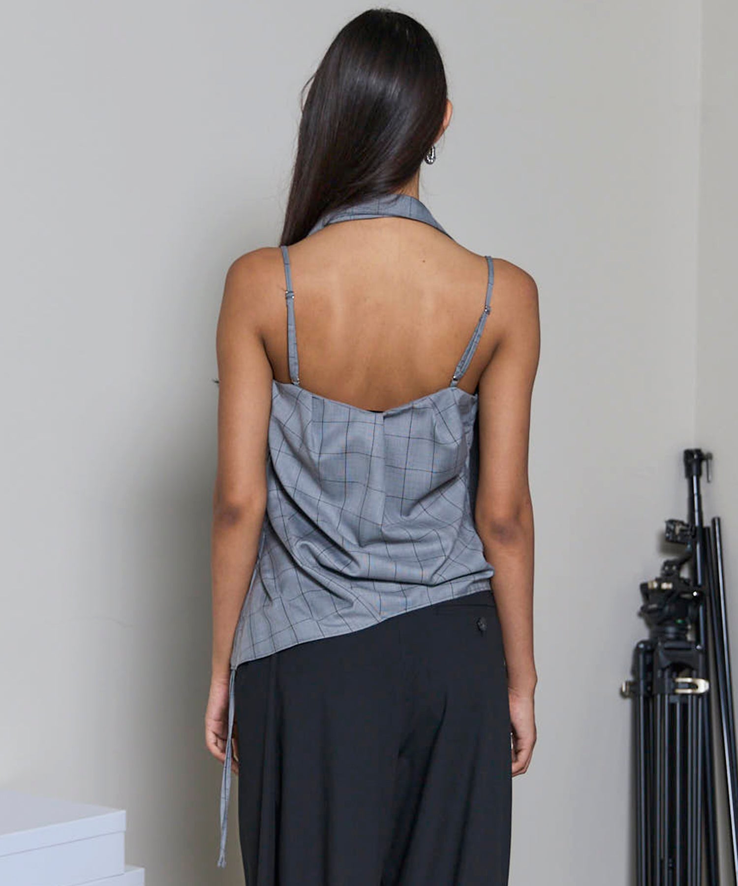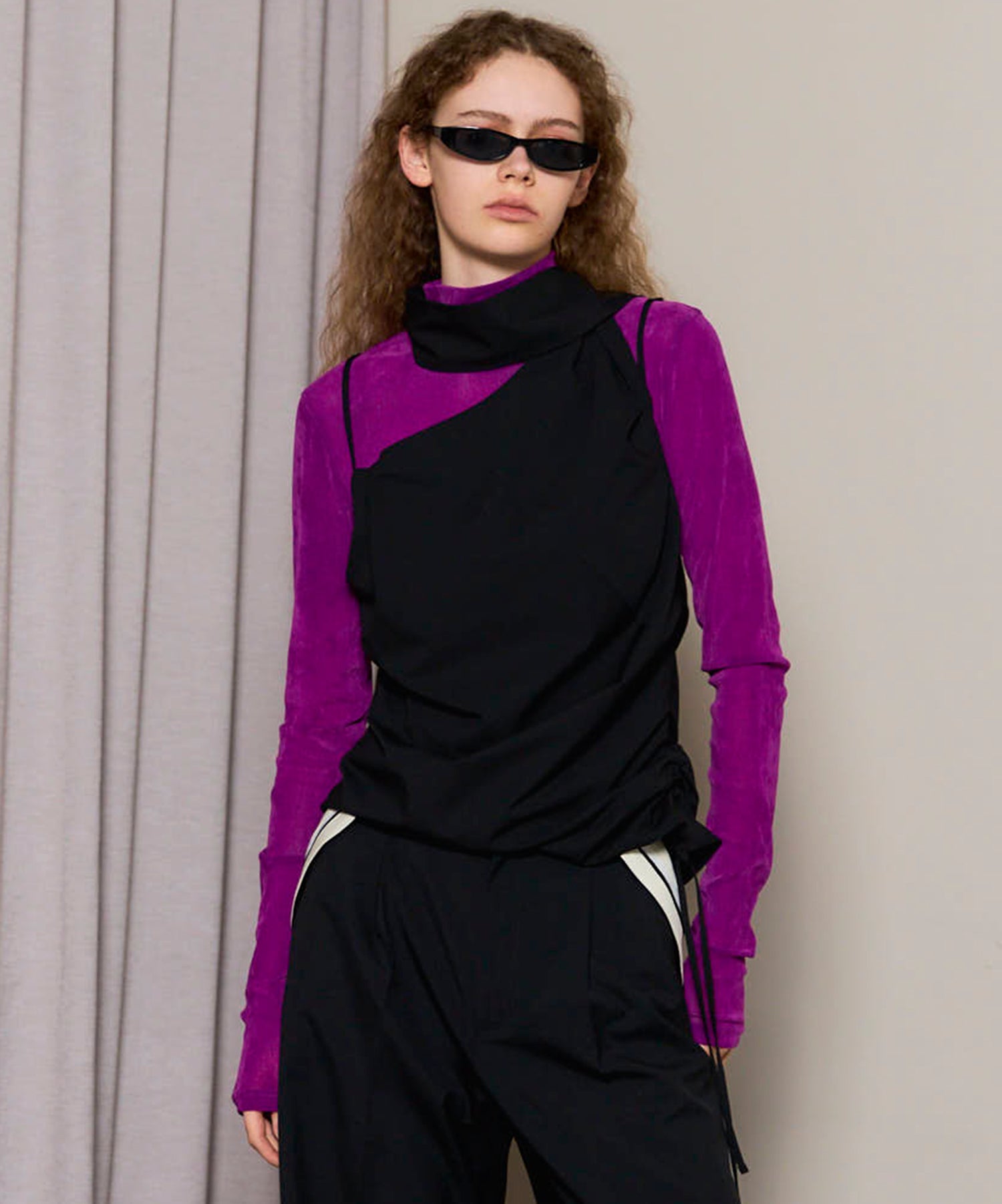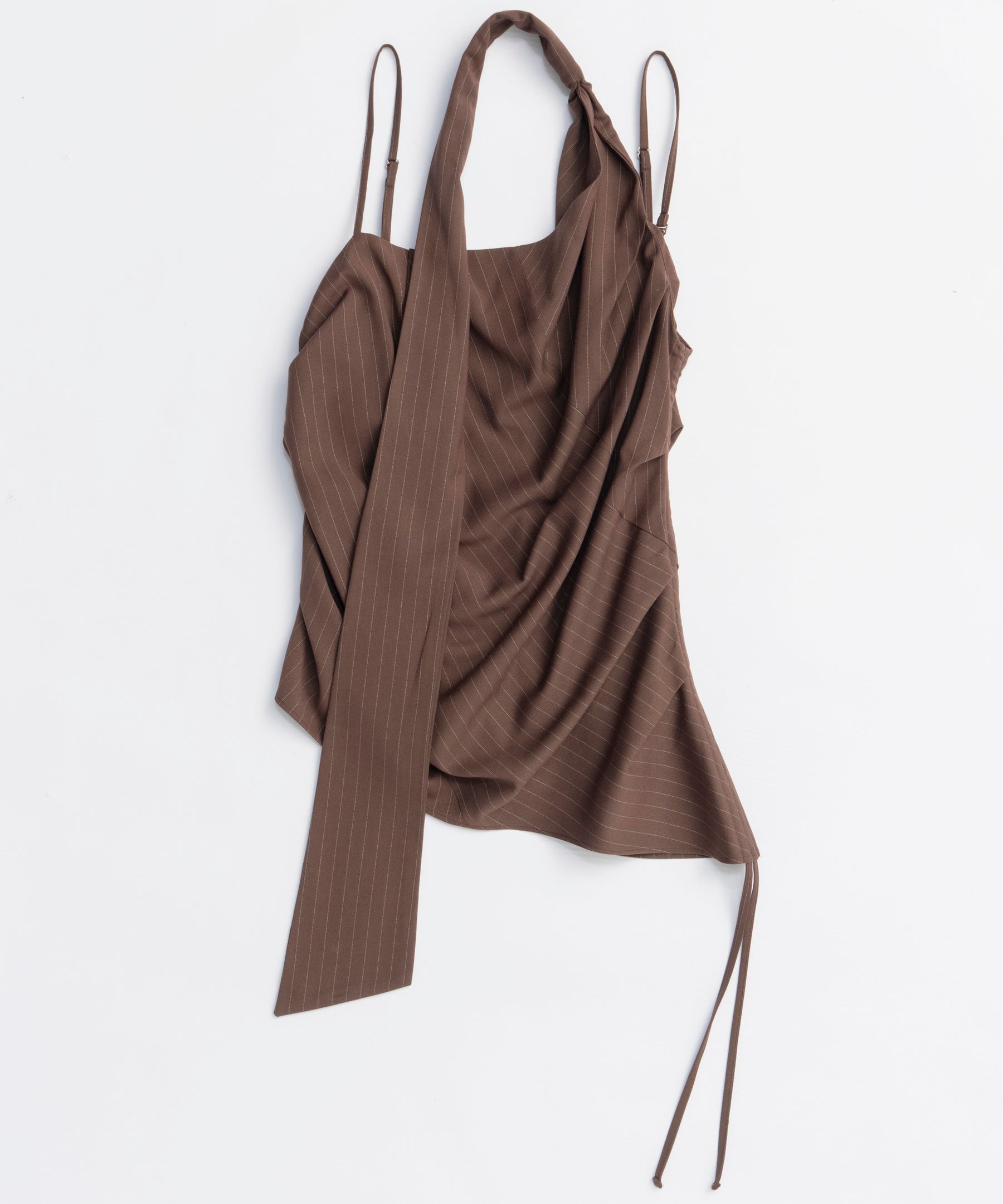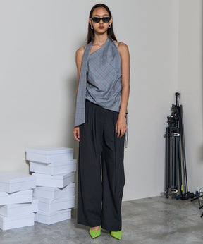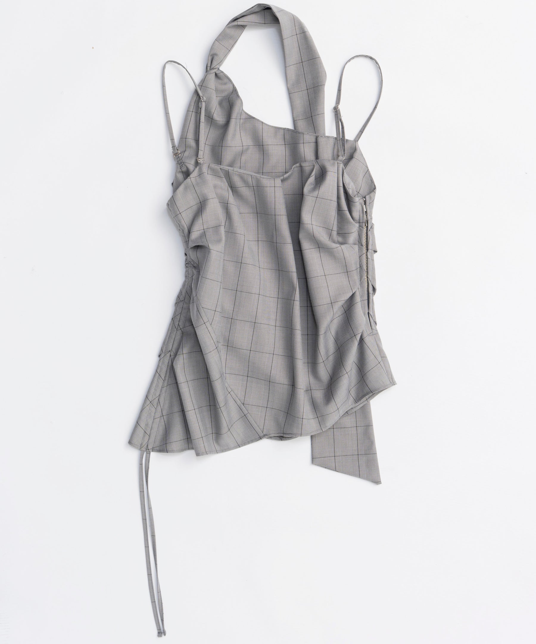 ・スーツ地のクラシックなムードに、アシンメトリーなドレープや長めのタイディテールでひねりを加えた上品でモードな印象のトップス。