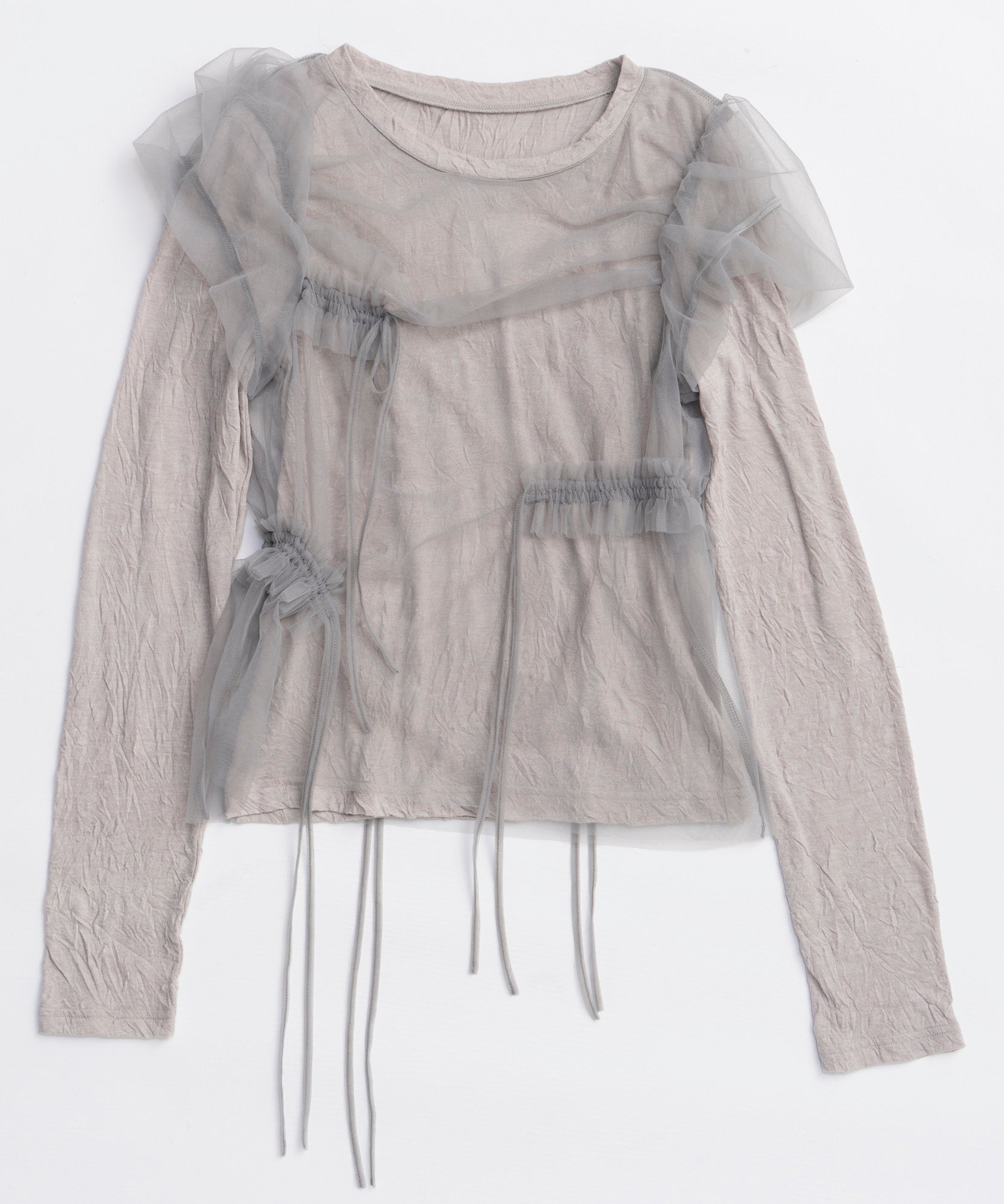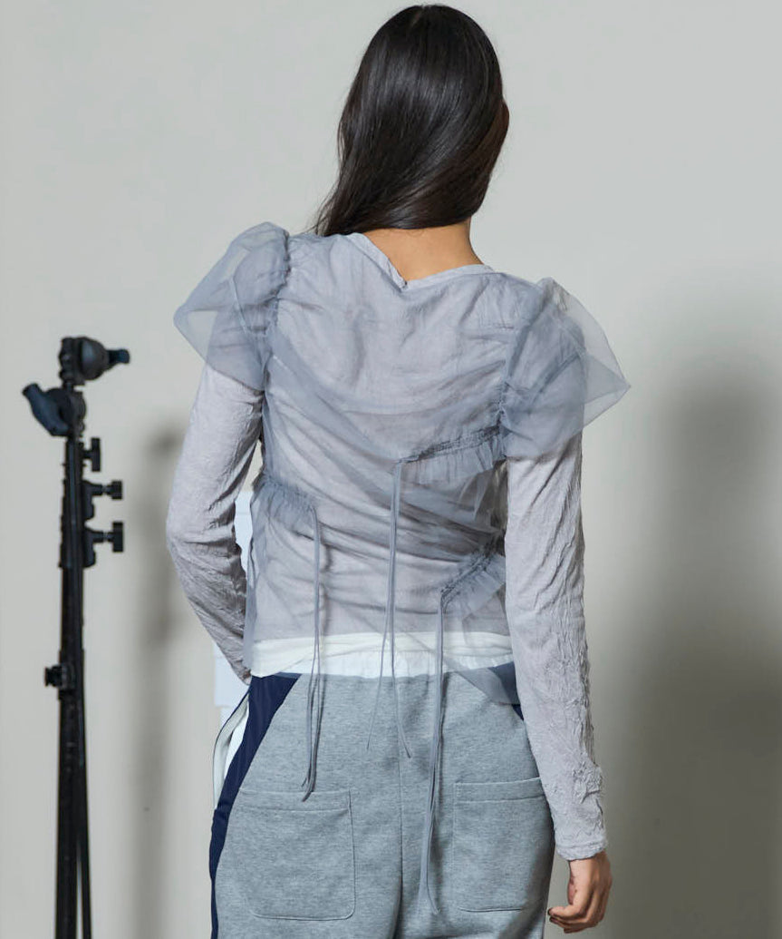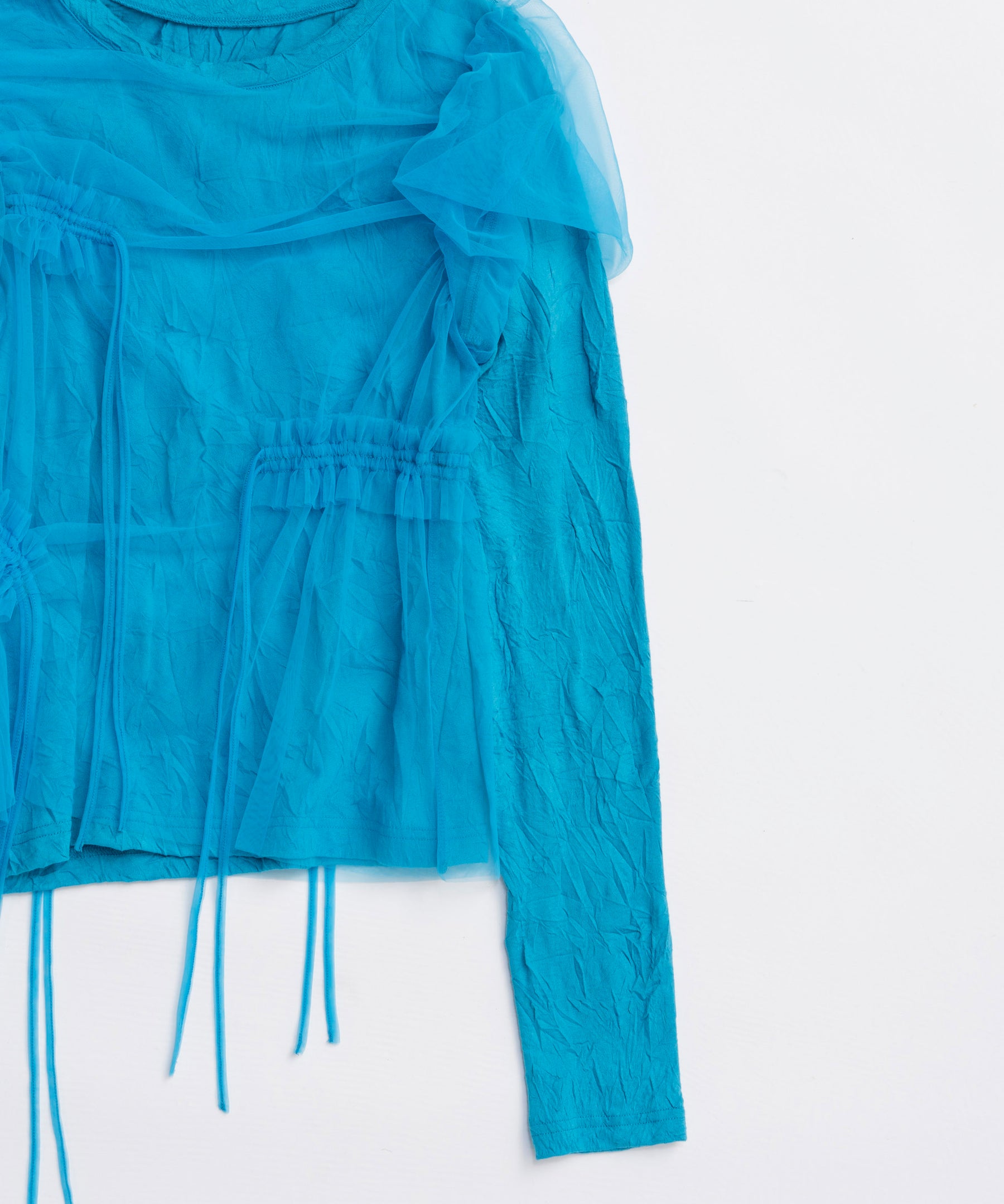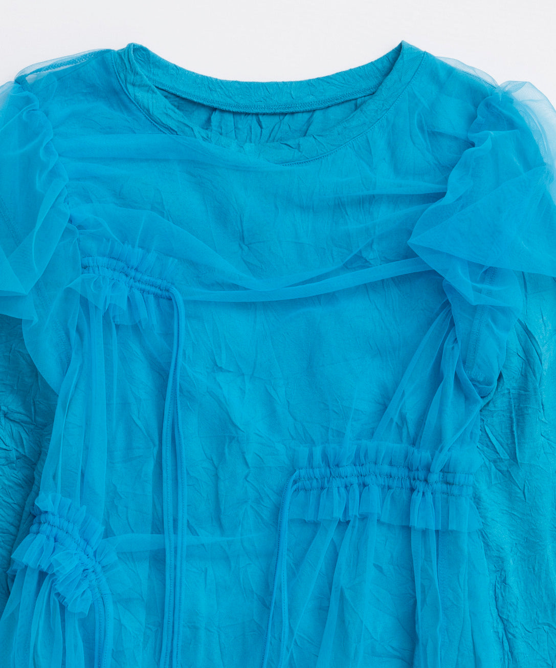 ・伸縮性のある柔らかいワッシャー天竺とソフトチュールをドッキングさせた一着。