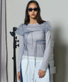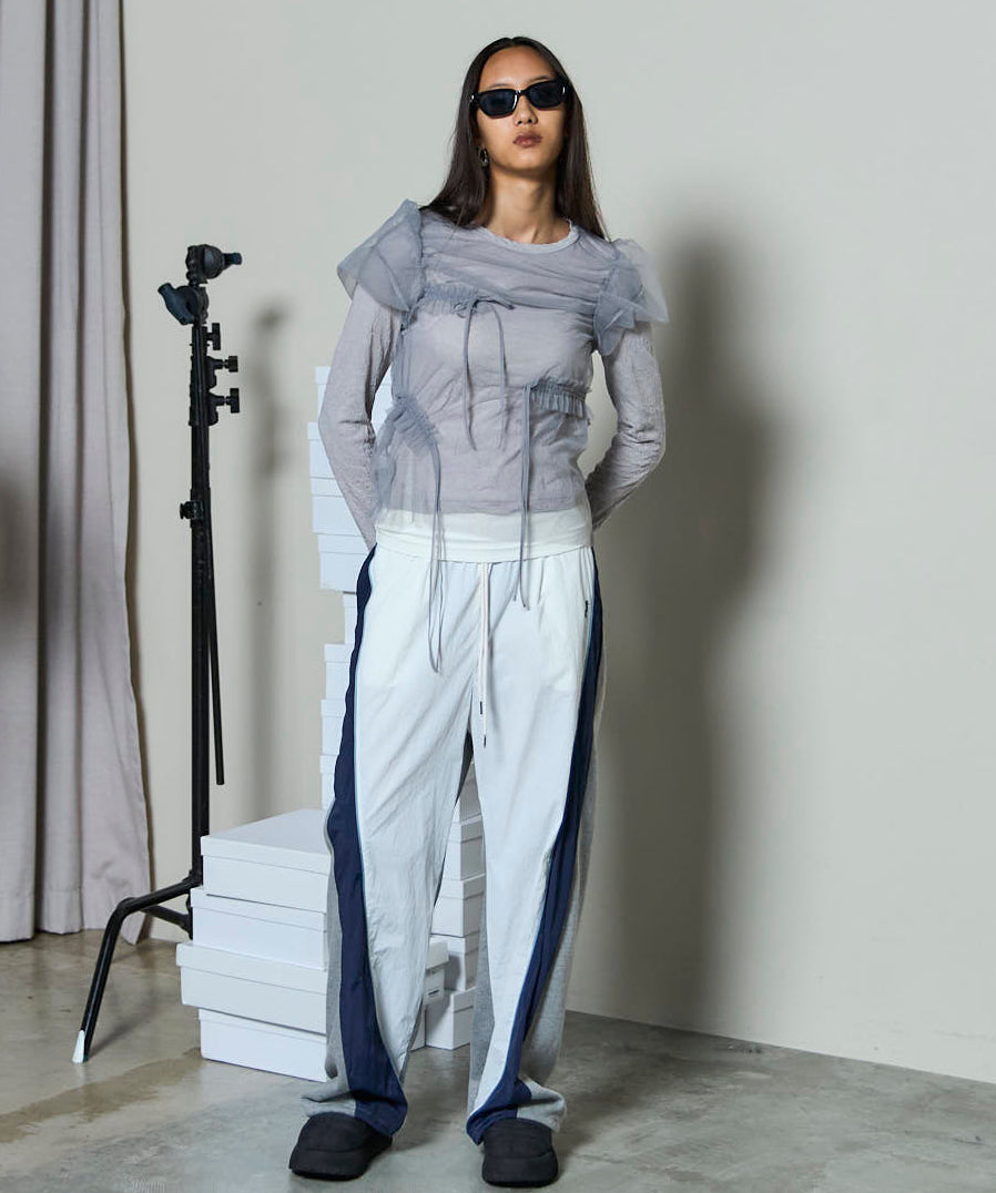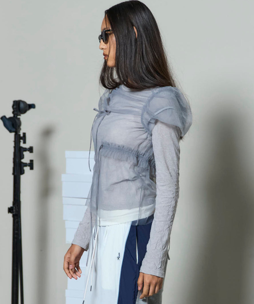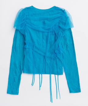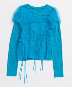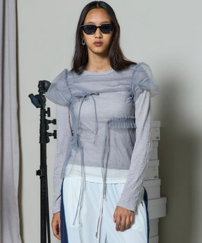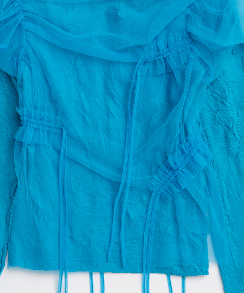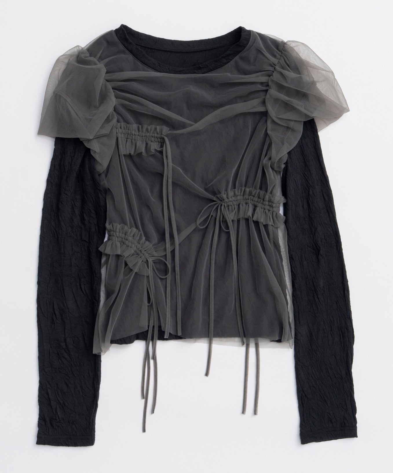 ・伸縮性のある柔らかいワッシャー天竺とソフトチュールをドッキングさせた一着。