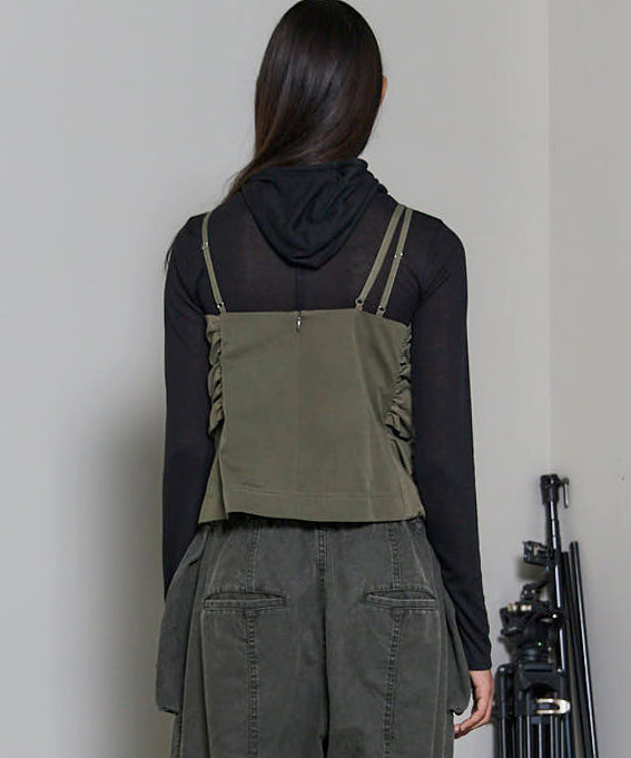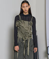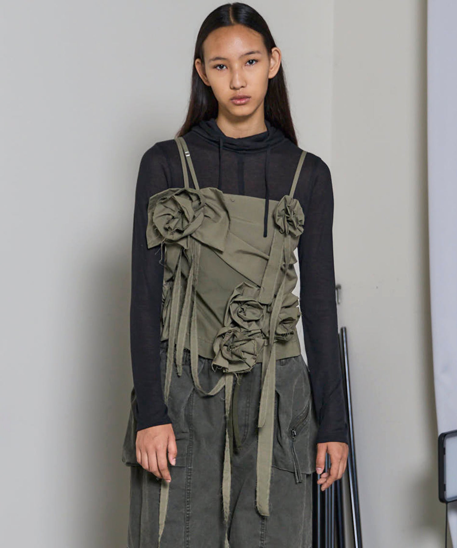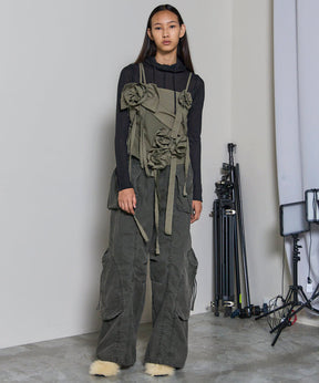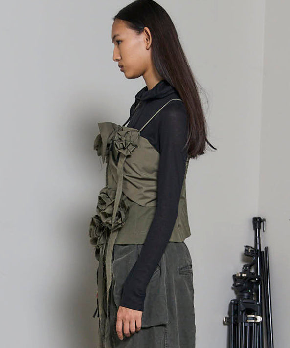 ・断ち切り仕様で仕上げたバラモチーフが目を惹く、ラブリーさとカジュアル感をミックスしたグログランビスチェ。