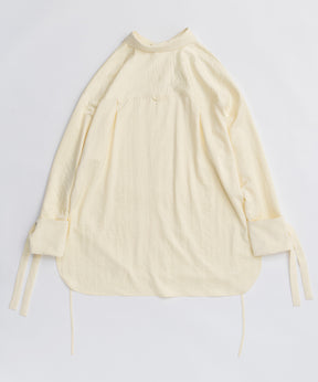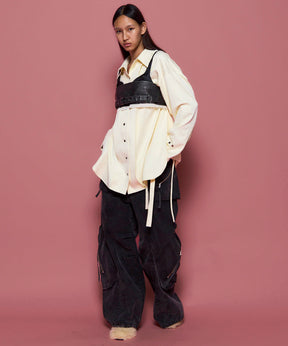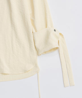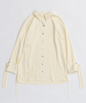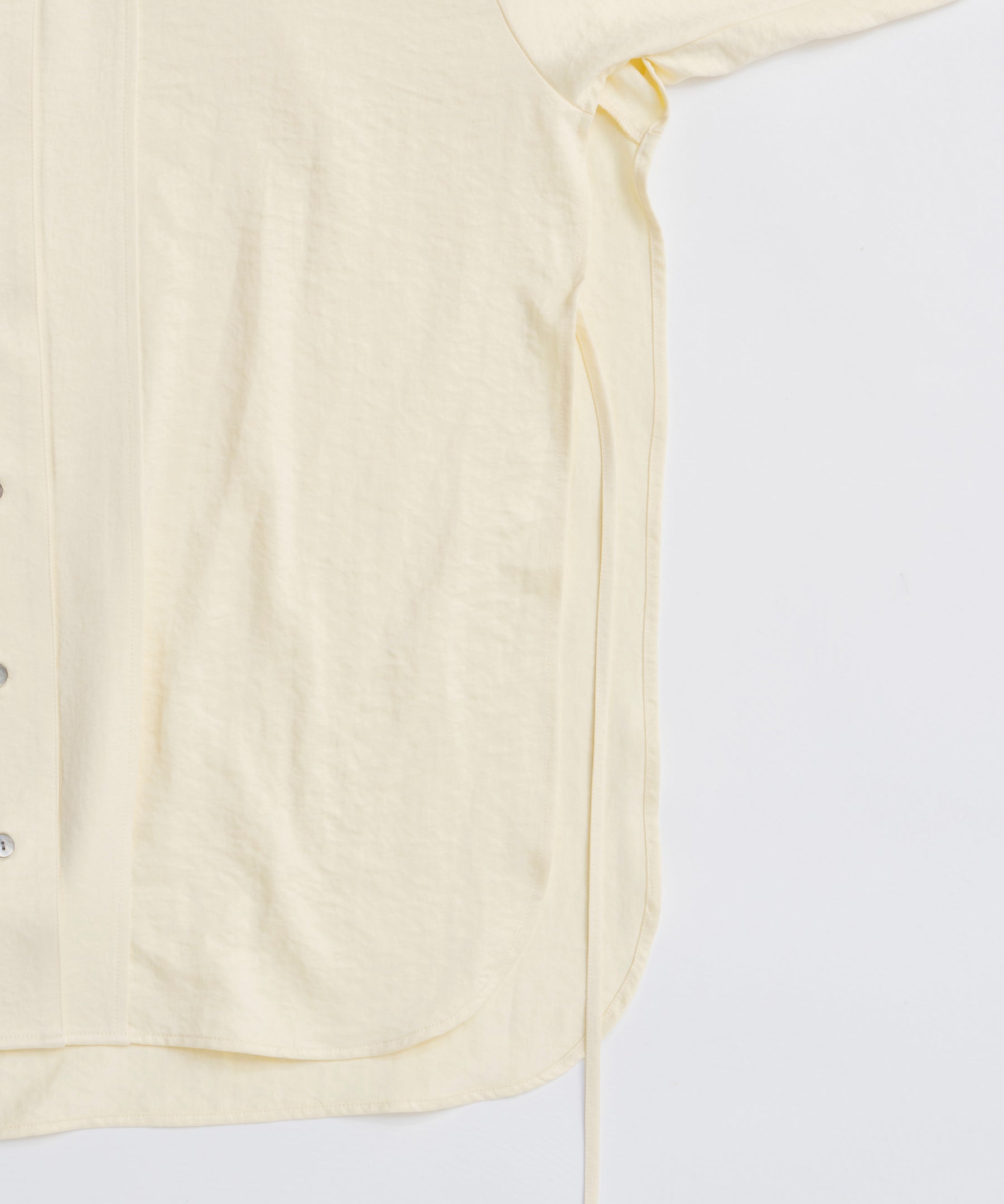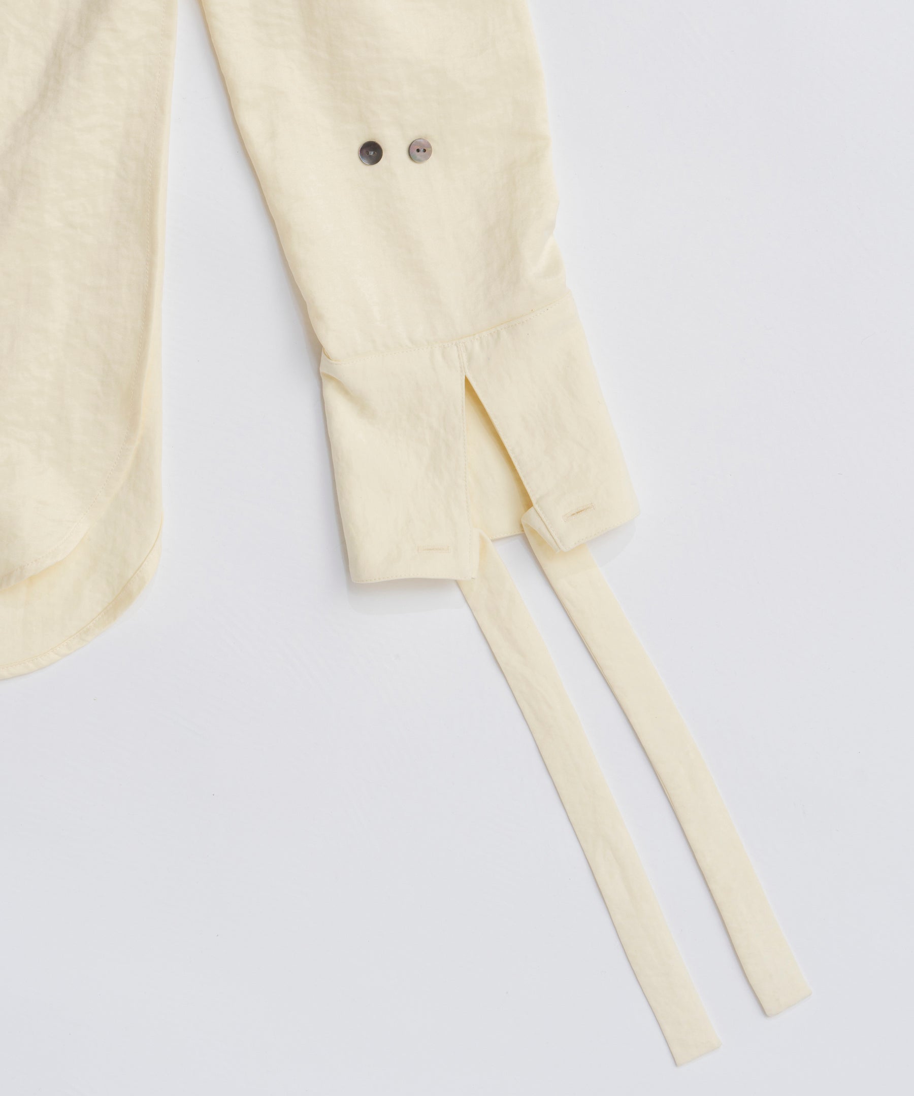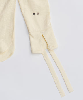 ・脇には大胆に入ったスリットと、ウエストを自由に絞れるリボン紐付きで、シルエットの変化も自在。