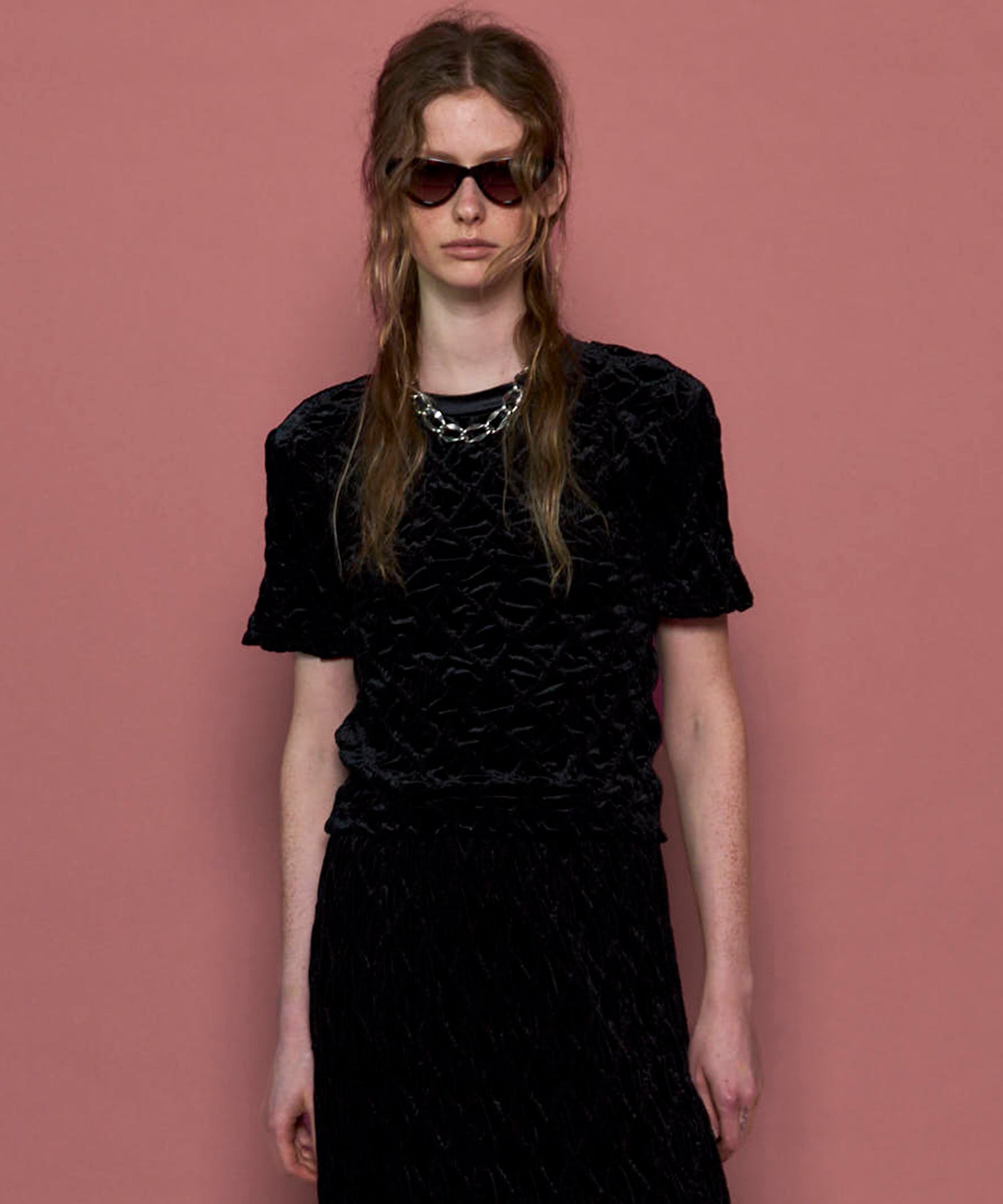 ・ネックラインはやや詰まり気味のクルーで、モード感をプラスしつつ、レイヤード時にも収まりが良いデザインに仕上げています。
