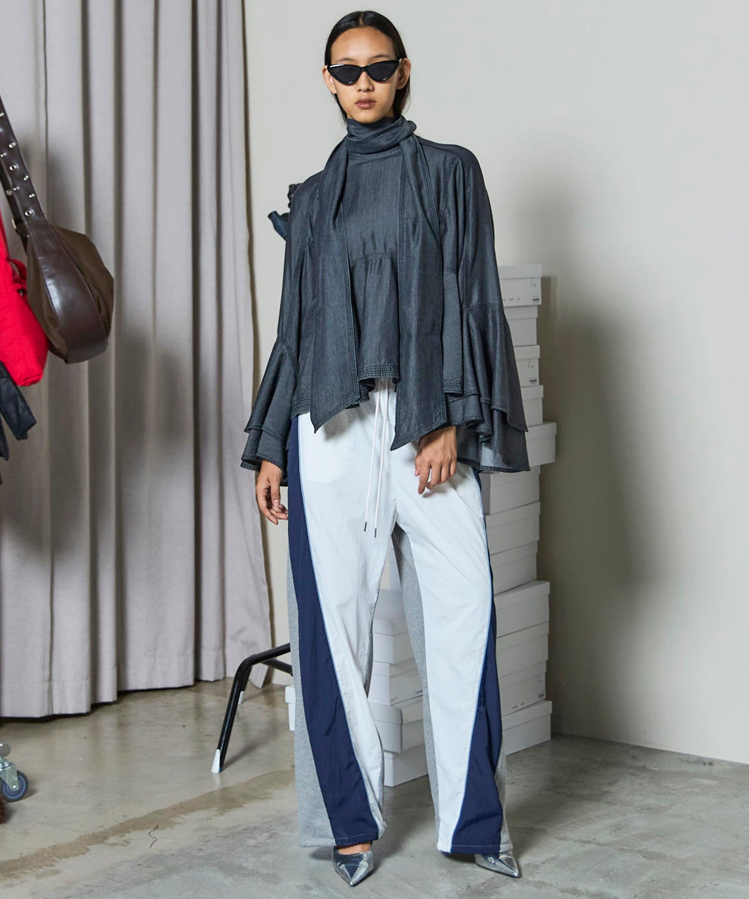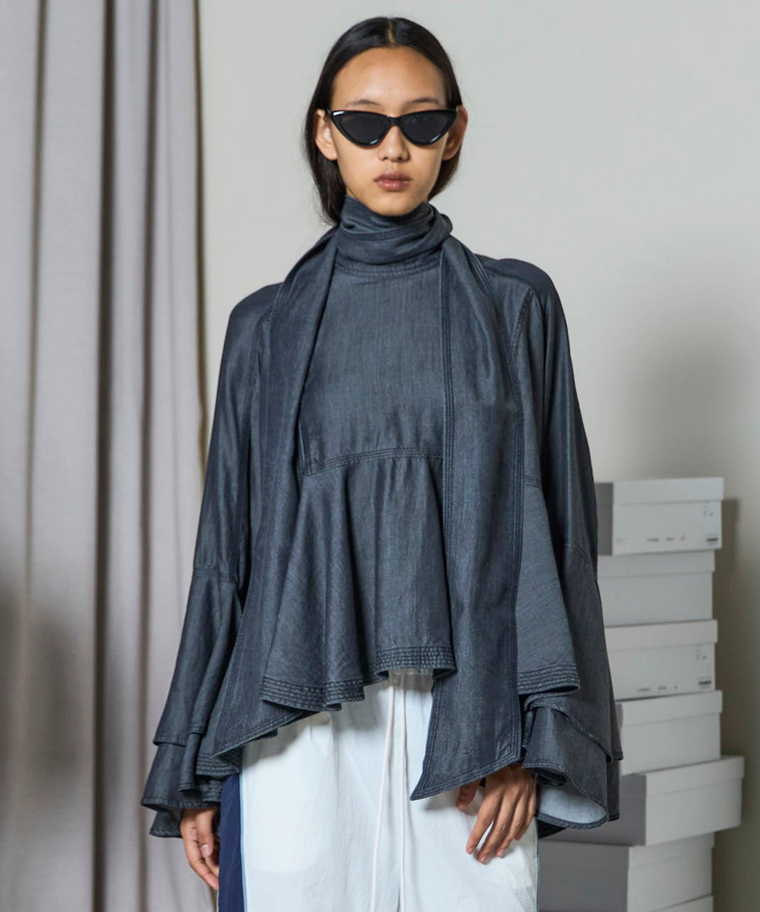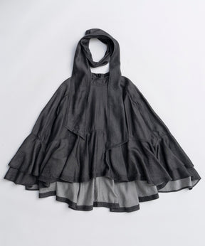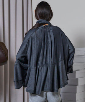 フロントのボウタイはあえて太めに設定し、ラフに垂らしたり無造作に結んだりと、着こなし自由自在で存在感のあるアクセントに。