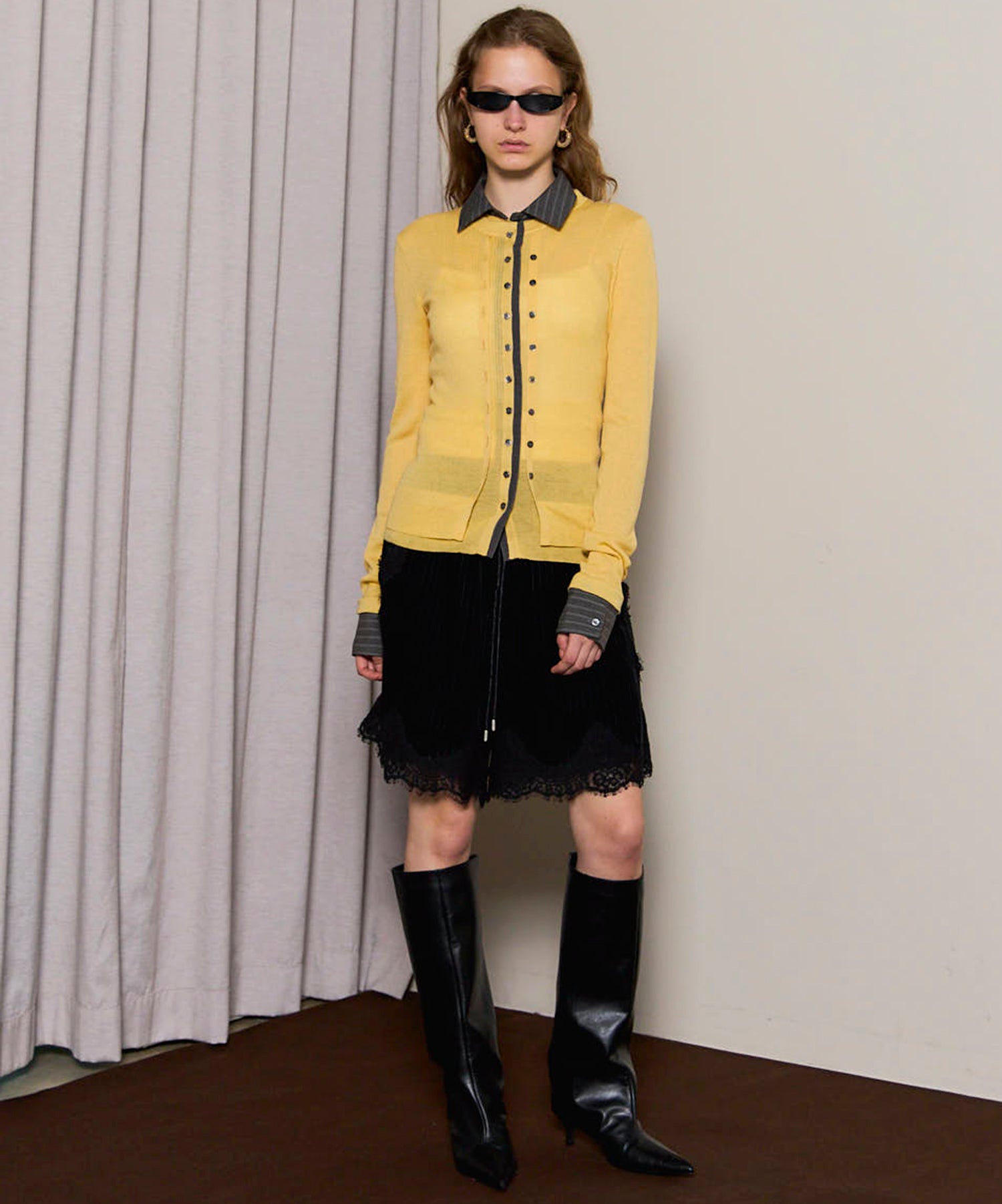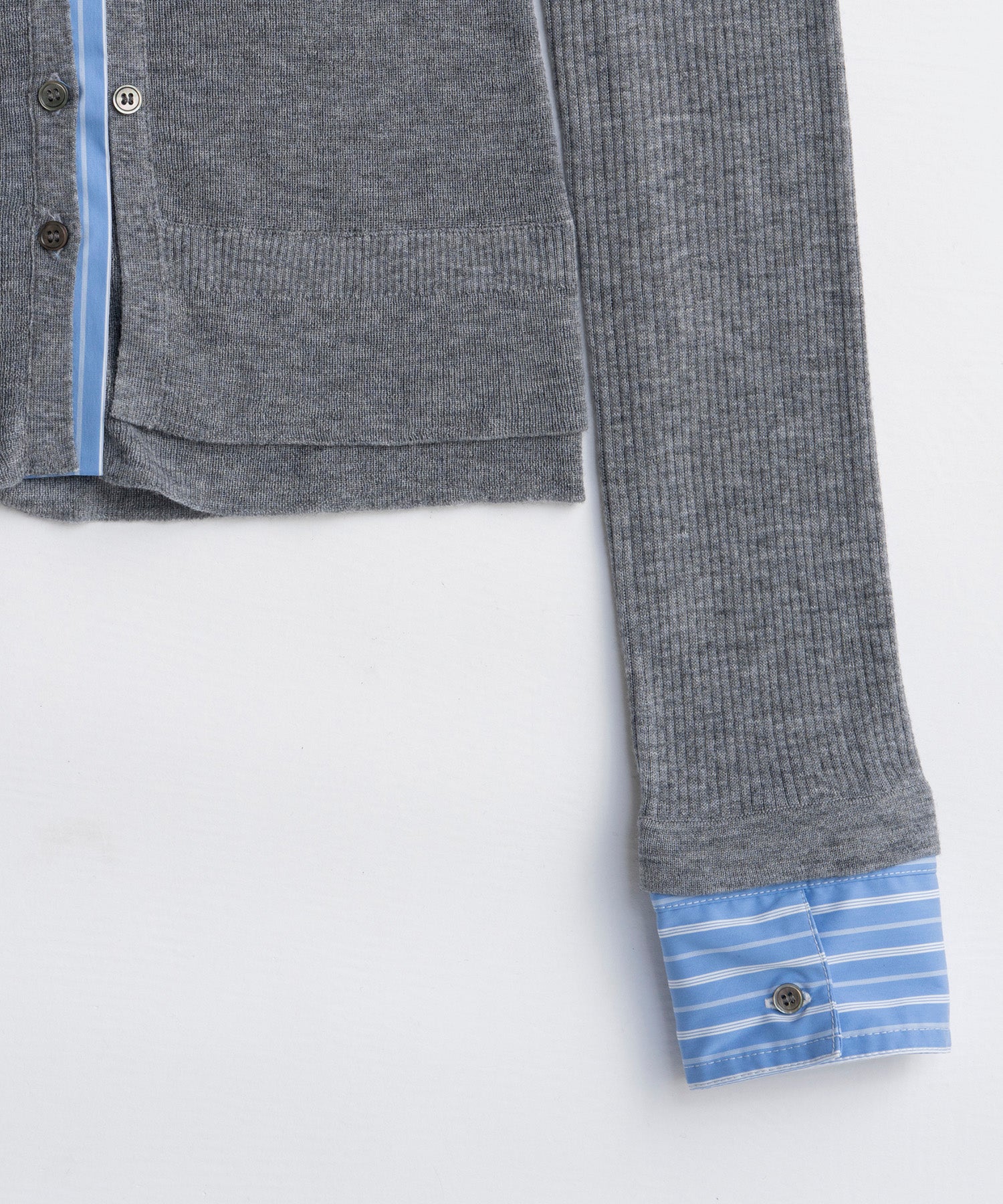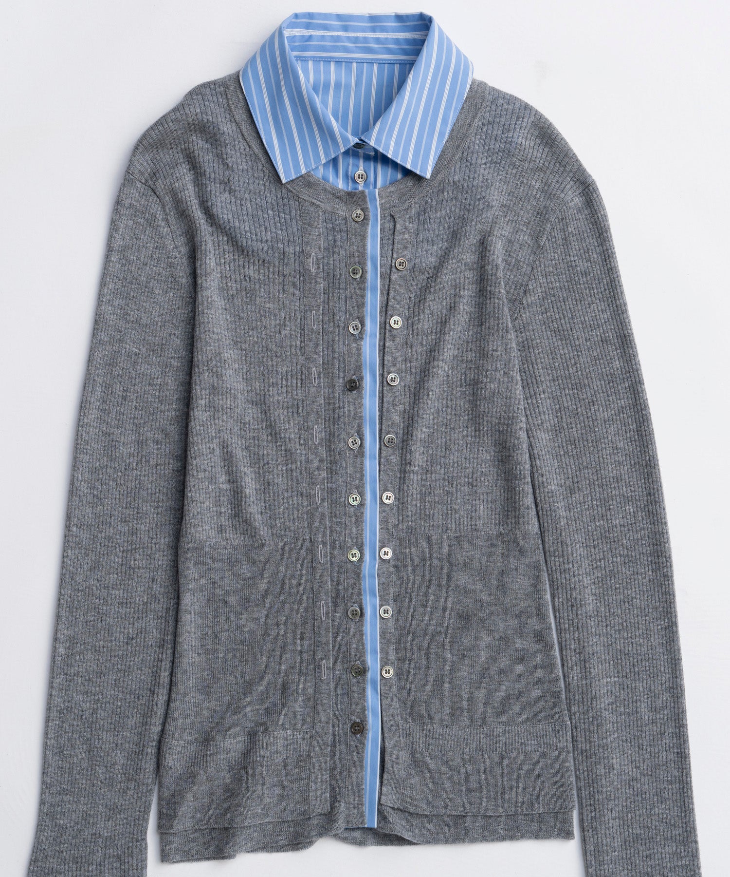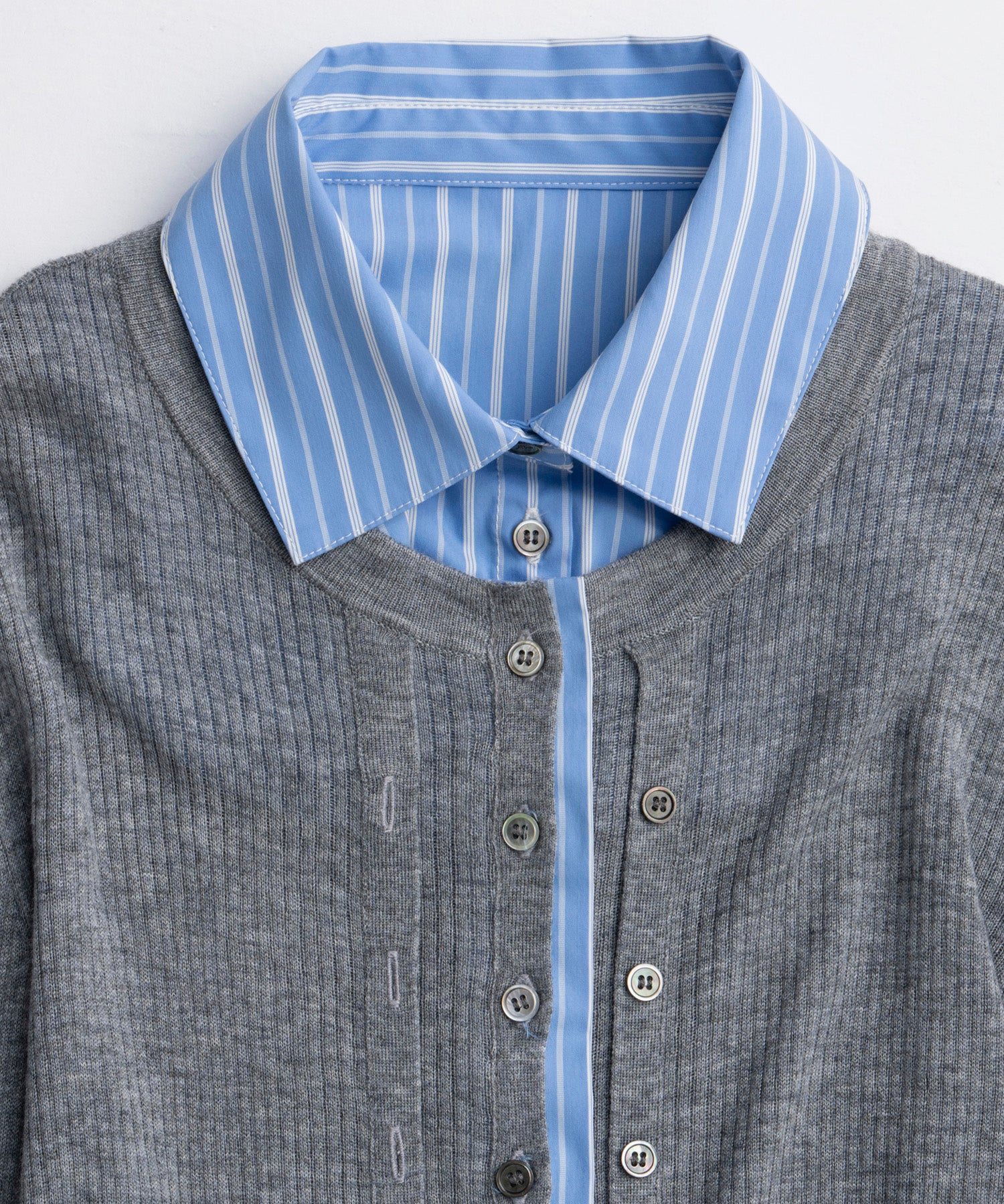 ・シャツとニットをドッキングした、レイヤードデザインがポイントの一着。