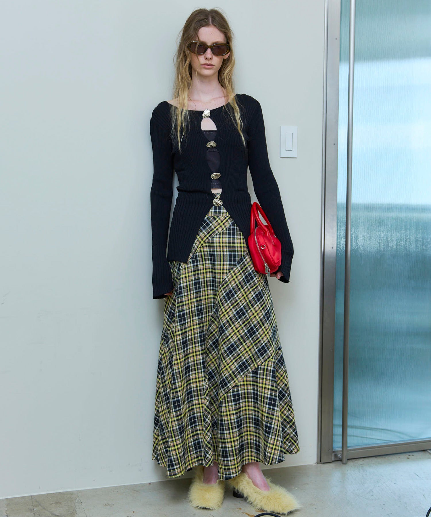 大胆に開いたスリットはインナーとのレイヤードスタイリングを楽しんでいただけます。