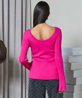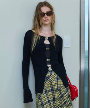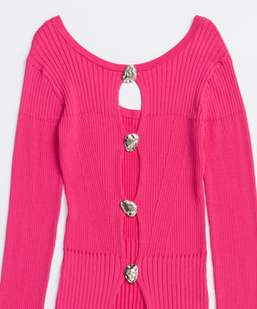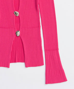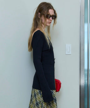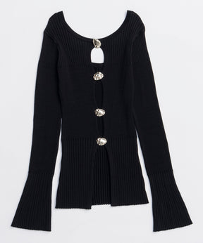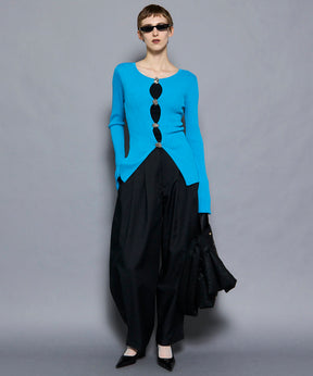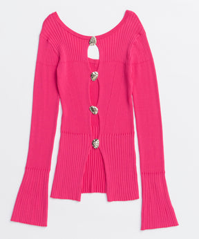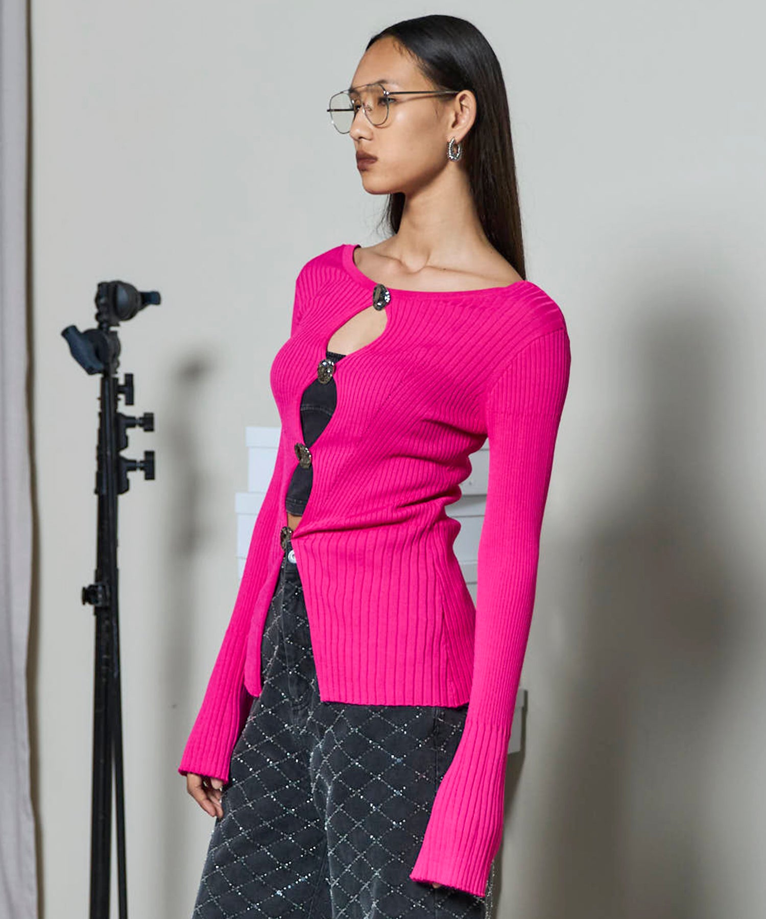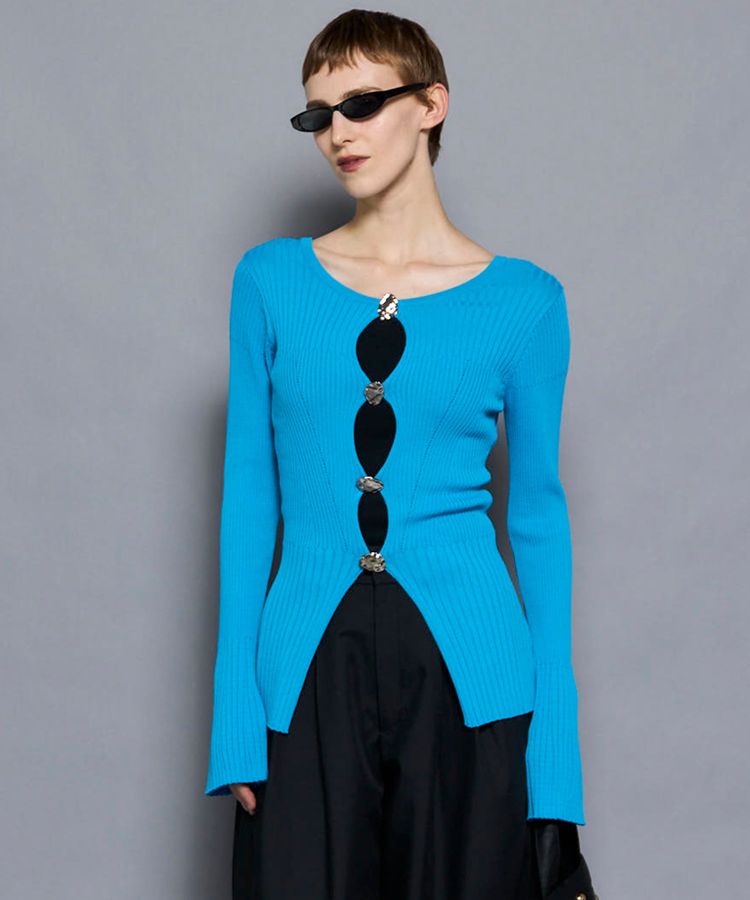 ・大きな飾りボタンでリュクスな印象に仕上げたニットトップス。