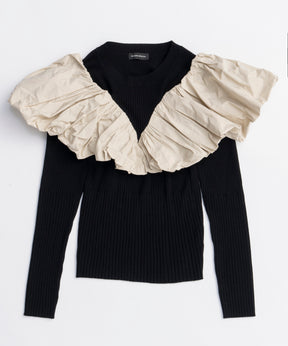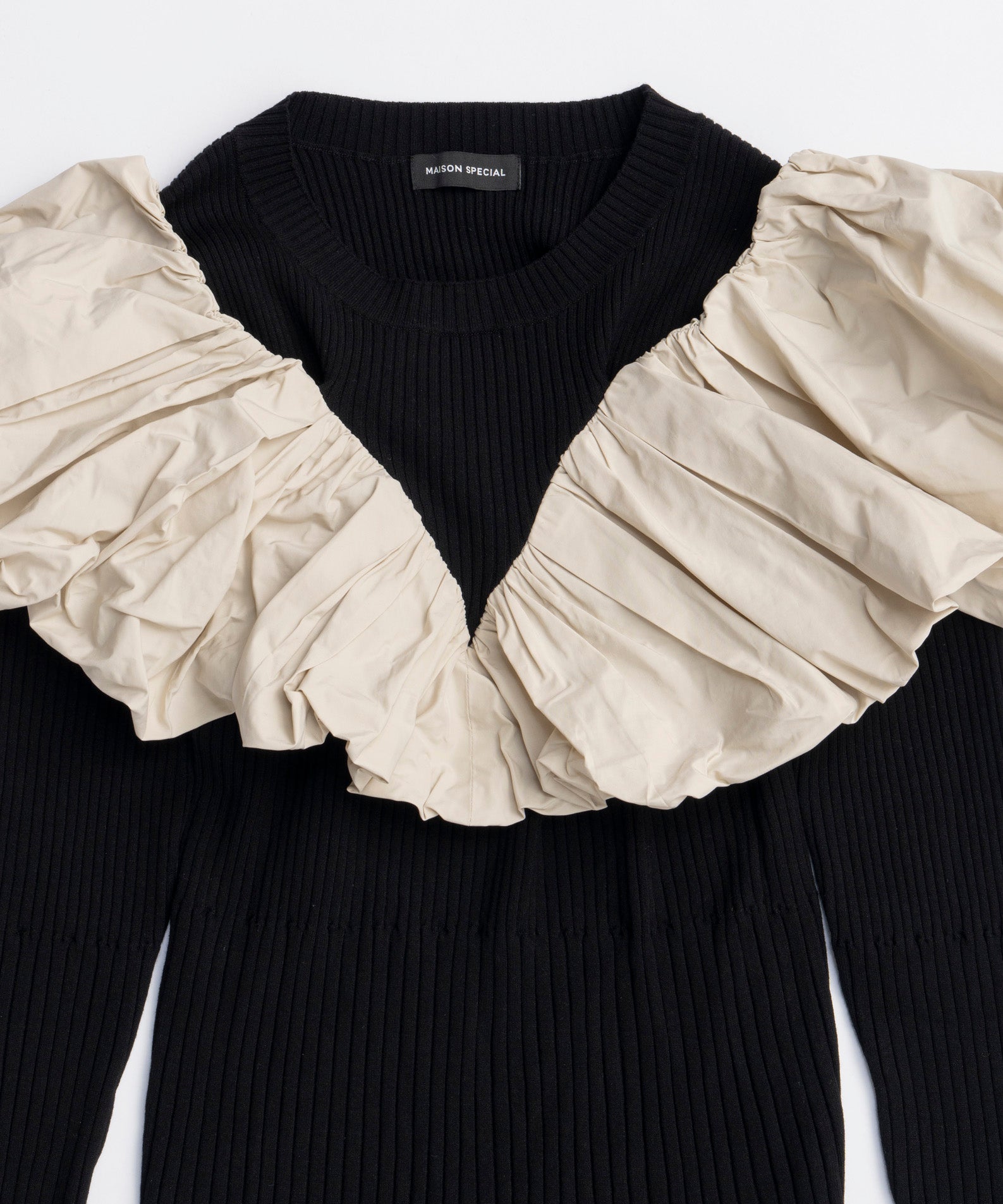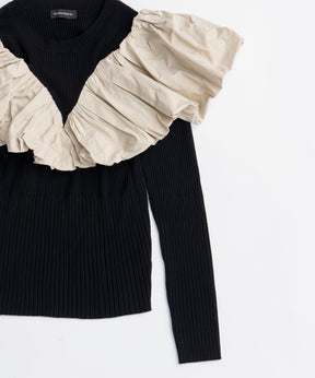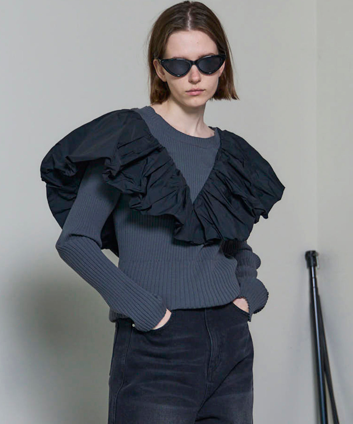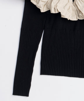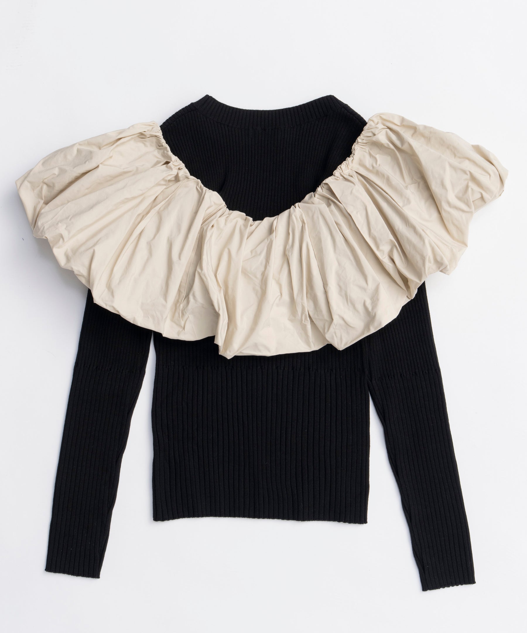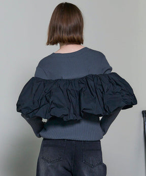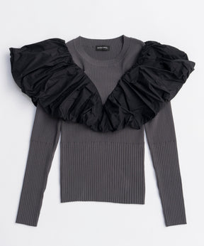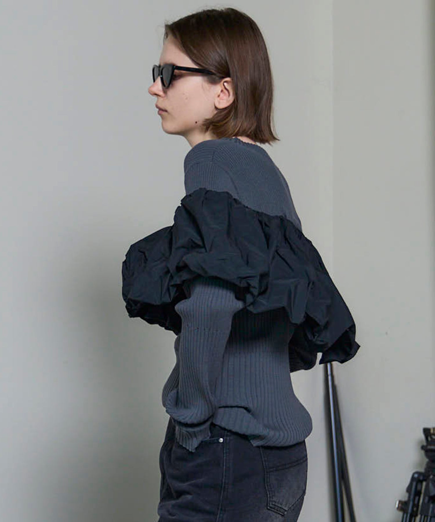 ・すっきりとしたクルーネックのリブニットトップスをベースに、袖に大胆なボリュームパフスリーブをドッキングしたデザインニット。