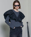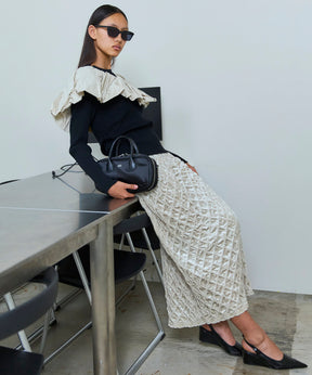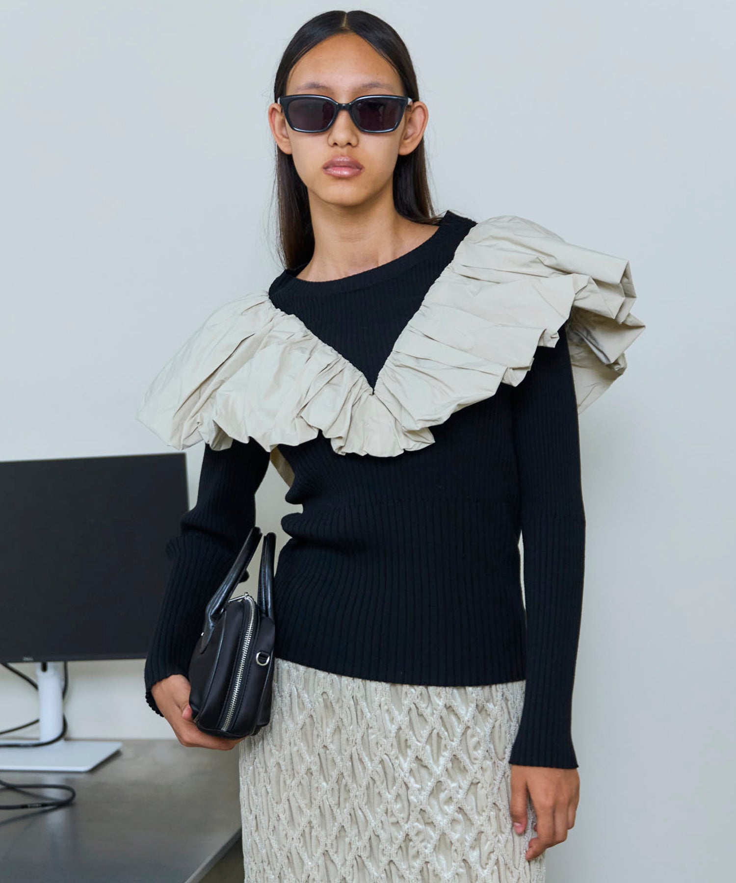・タフタ特有のシャリ感とボリュームがニットと調和し、甘さとモード感を両立。