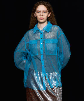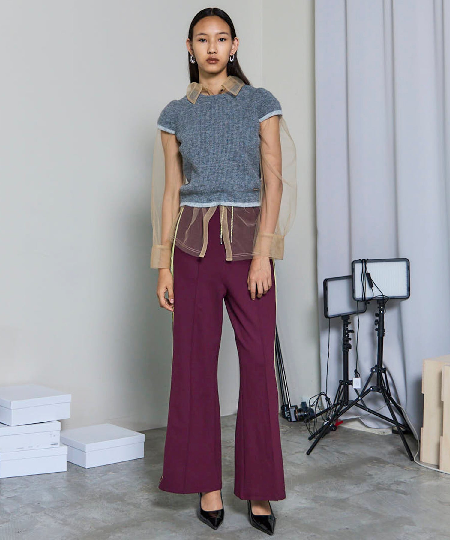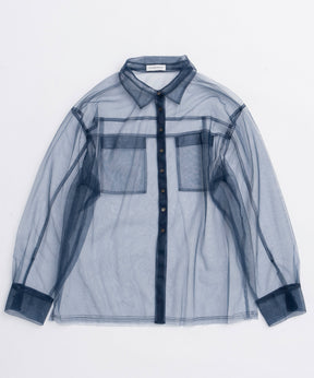 ャツのシアー感がスタイリングに軽さとモード感を与え、ニットとのコントラストが楽しめる一枚です。