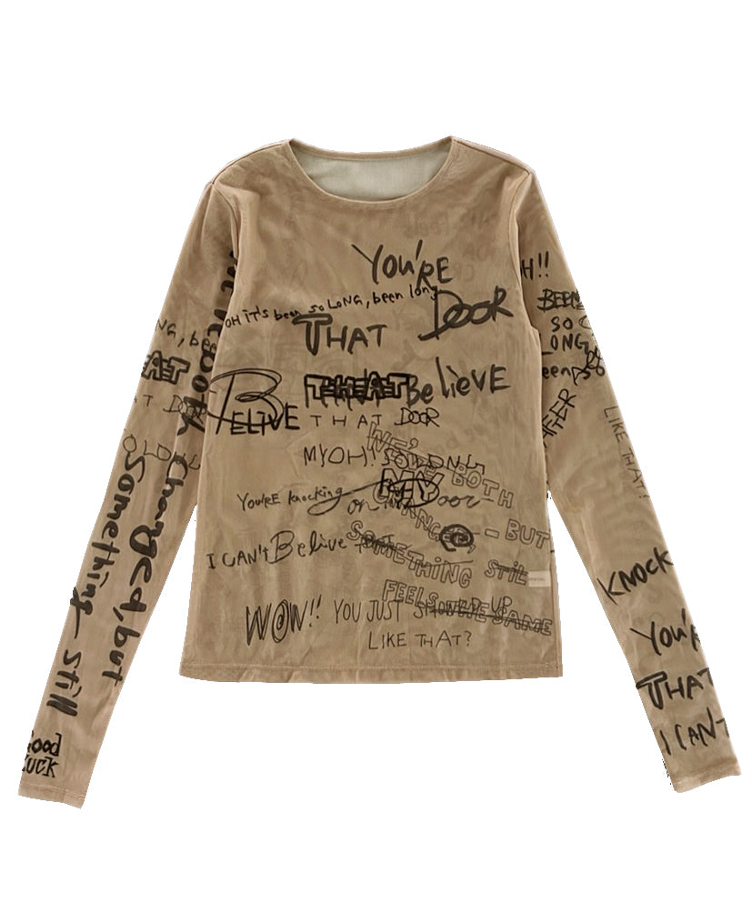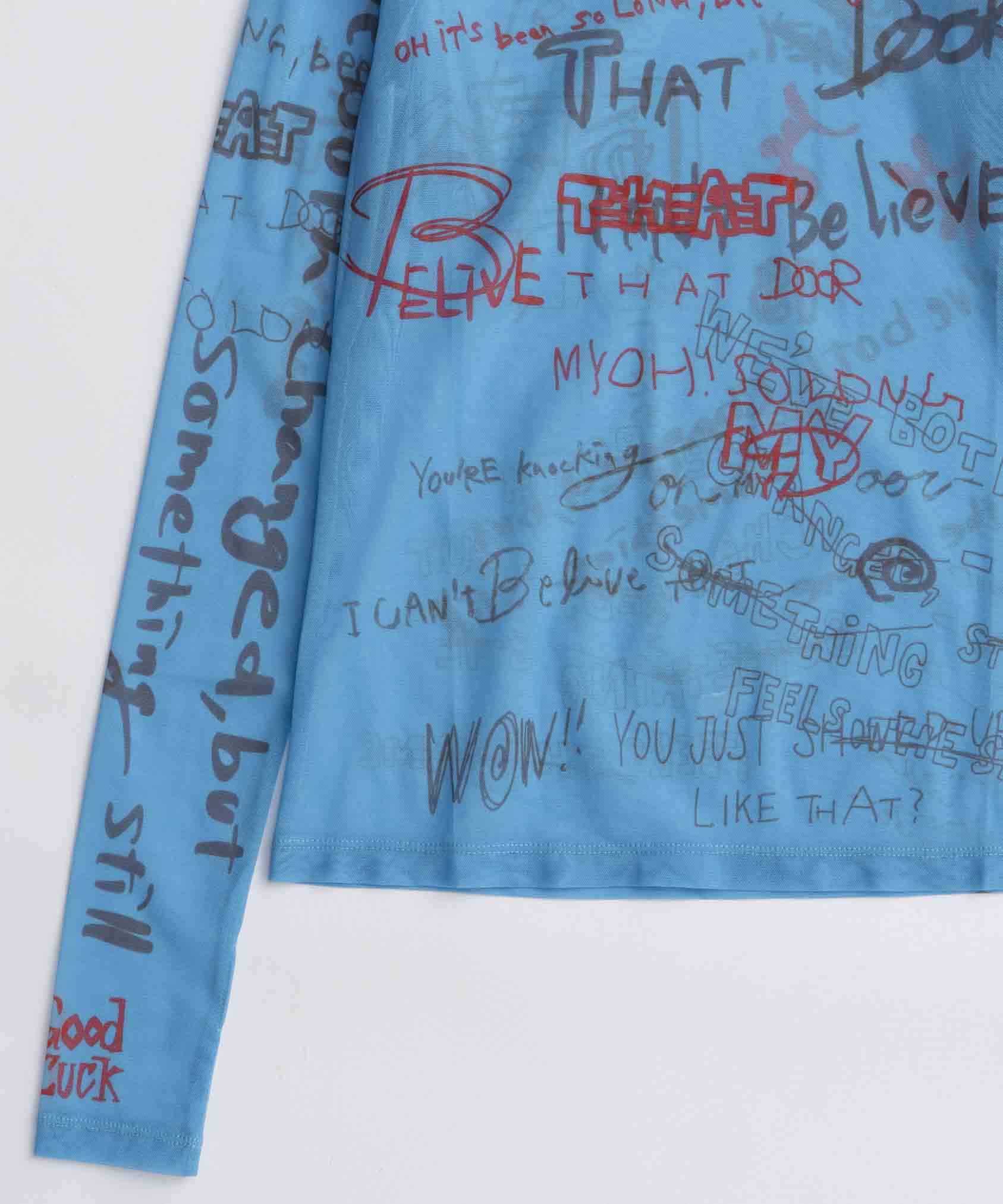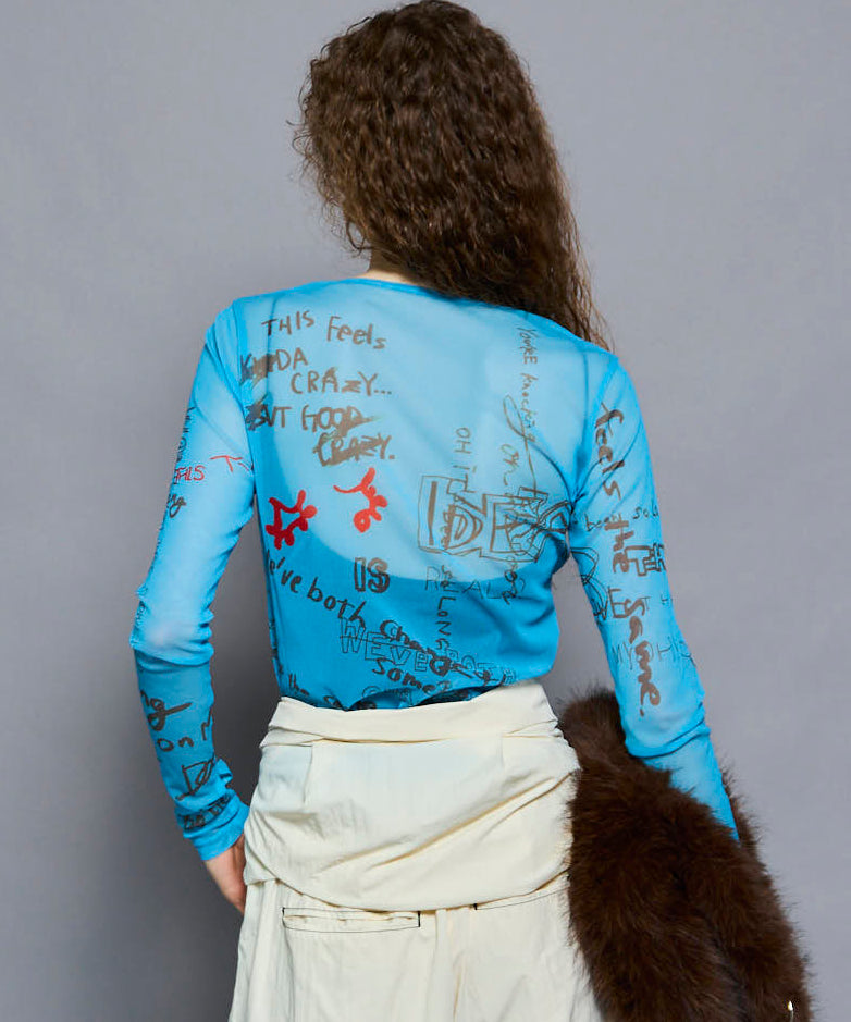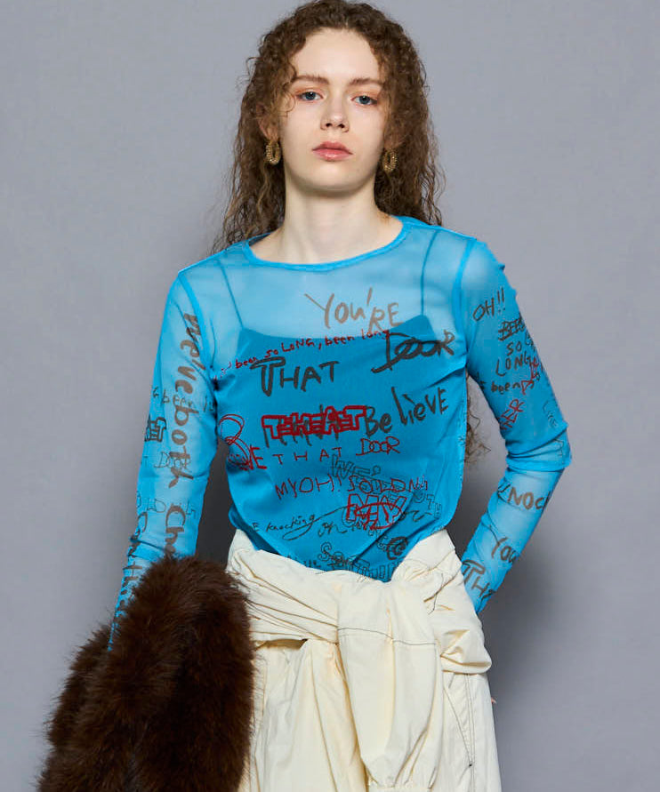・ハンドペイントタッチのプリントを全面に施したオリジナルプリントがキャッチーなタイトトップス。