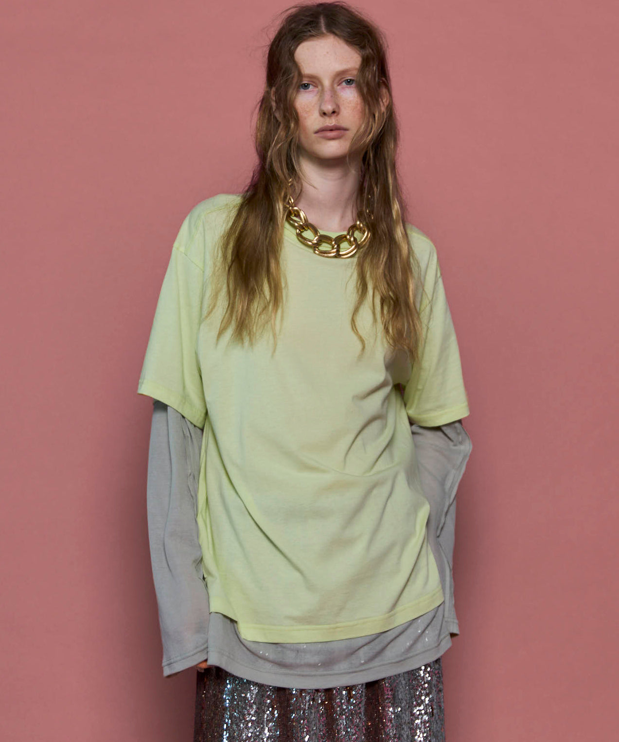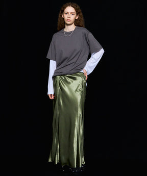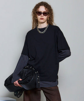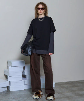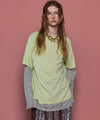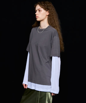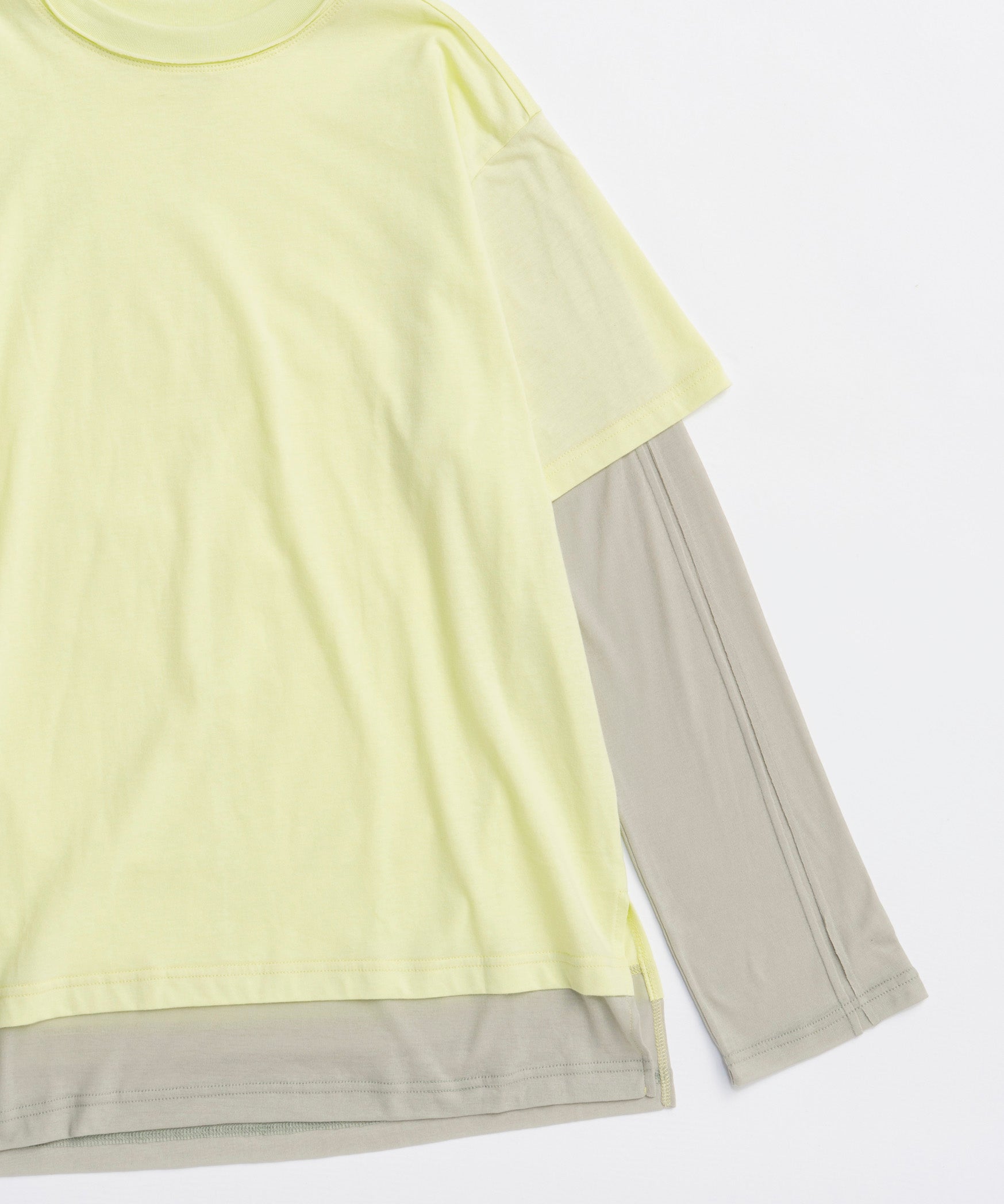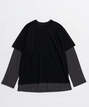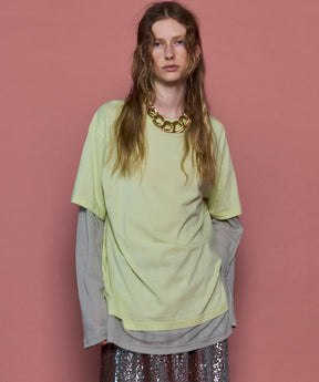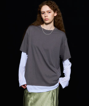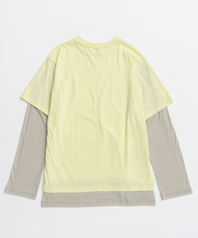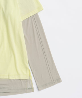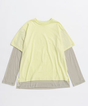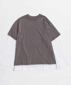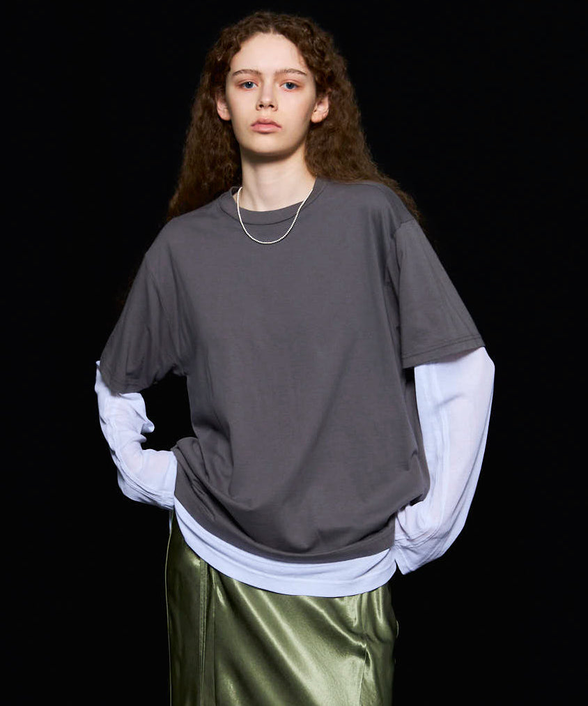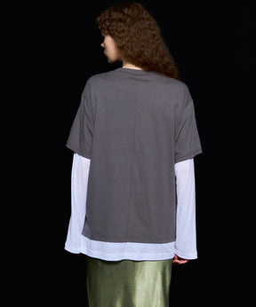 ・半袖のTシャツと長袖のシアーロンTをレイヤードして着ているようなデザインの一着。