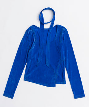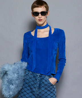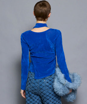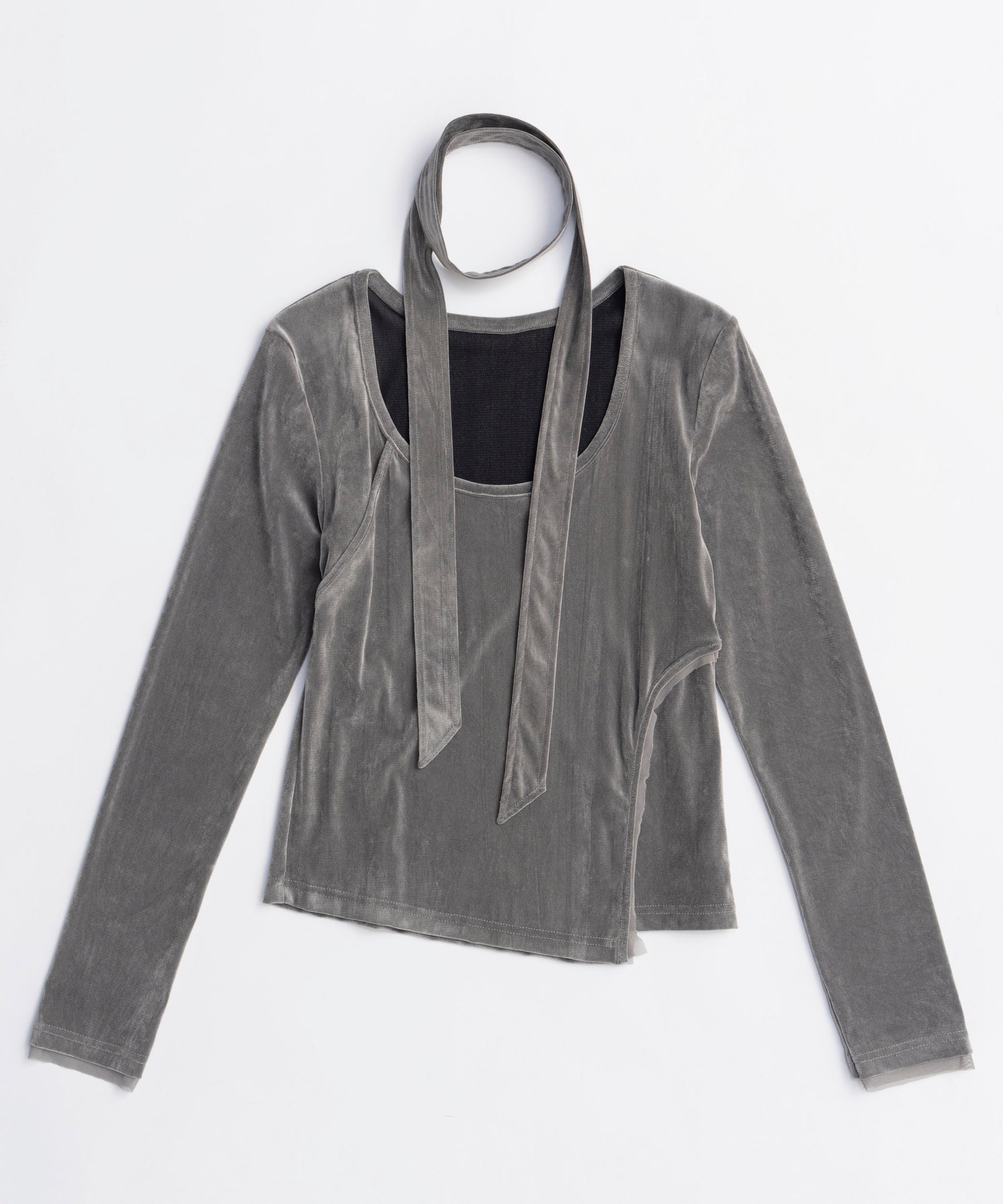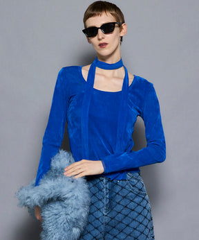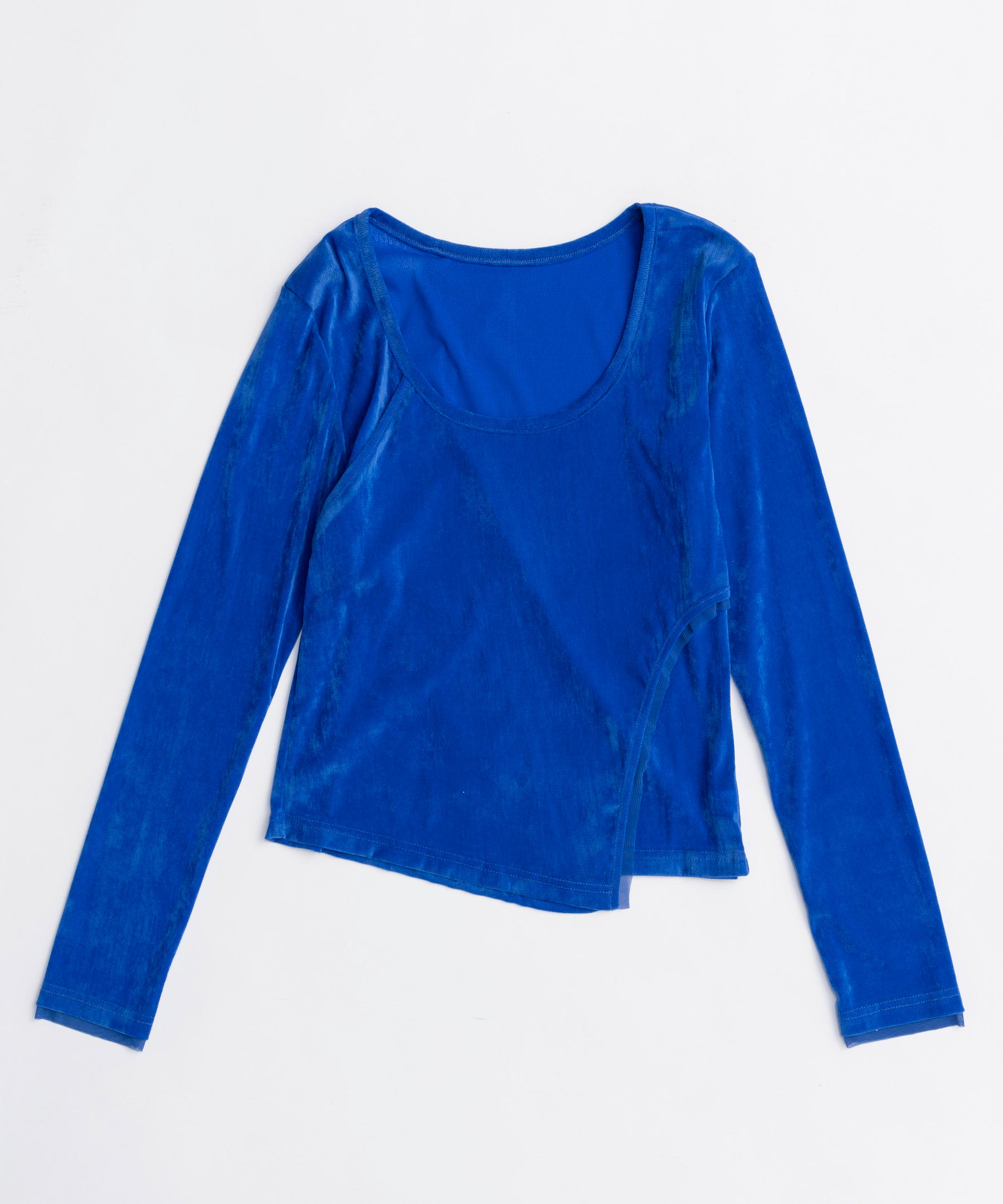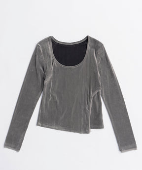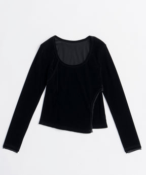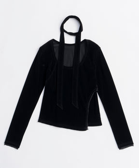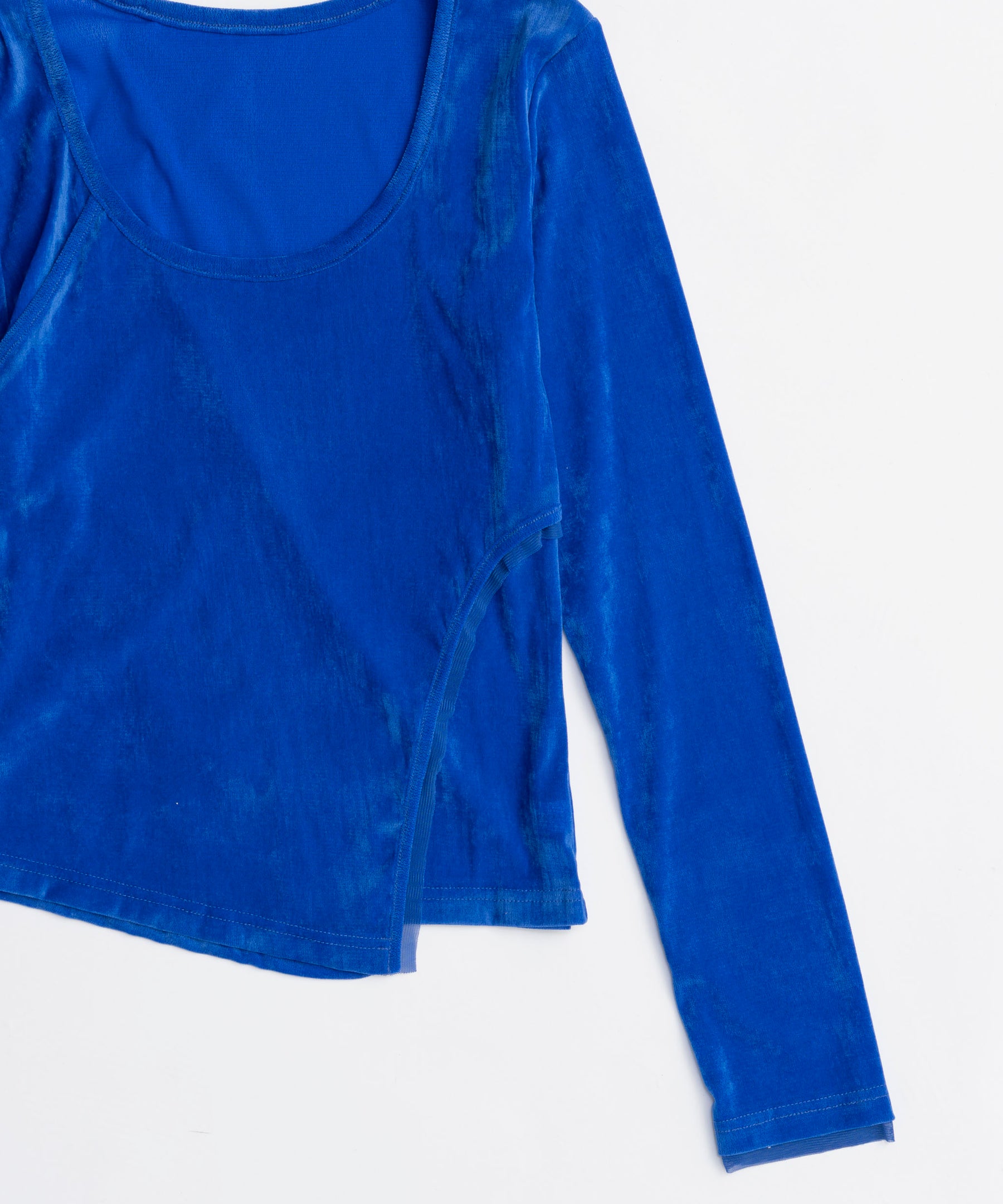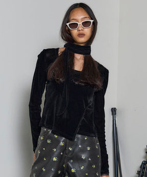 ・デコルテを美しく見せる深めのスクエアネックが特徴のベロアトップス。
