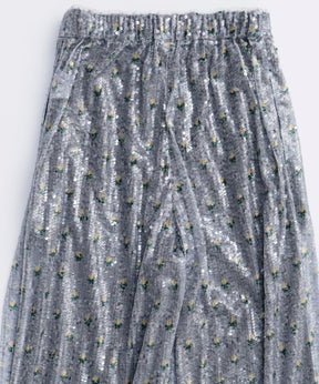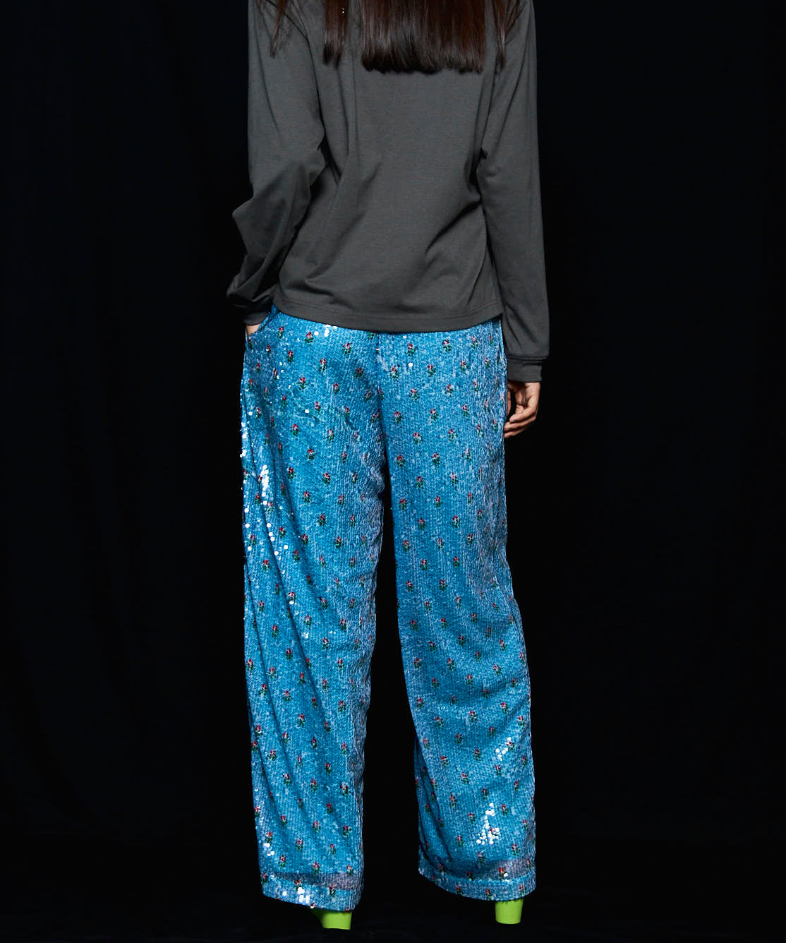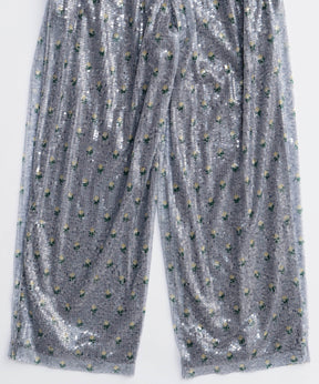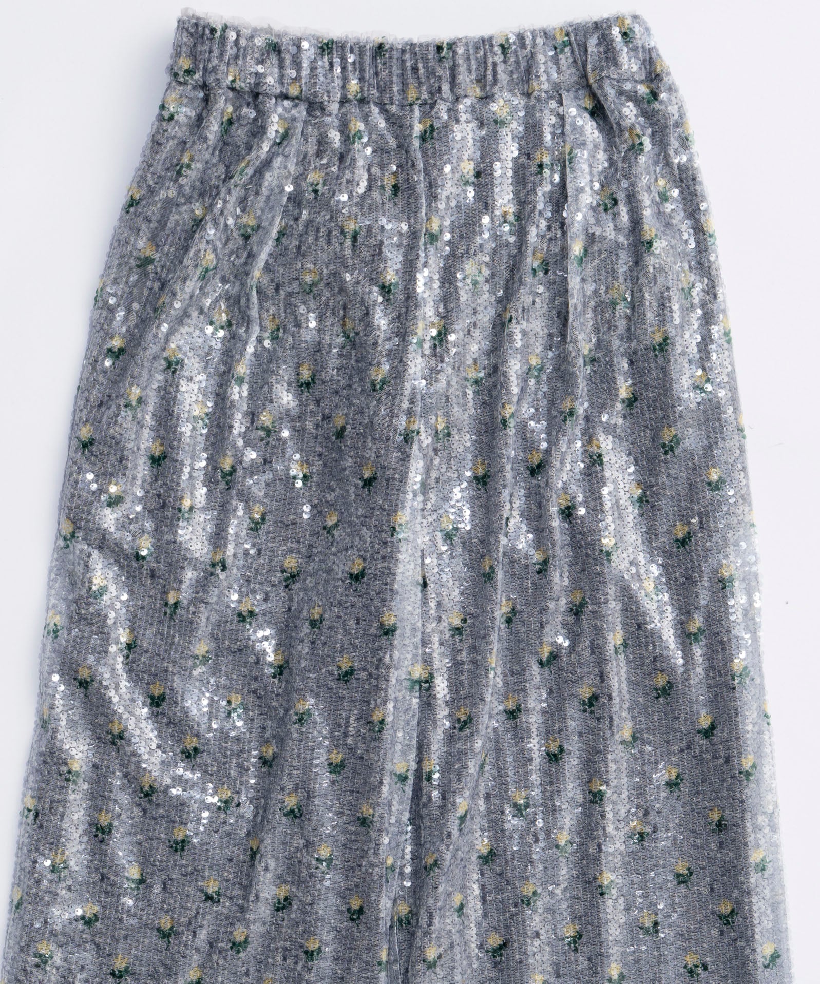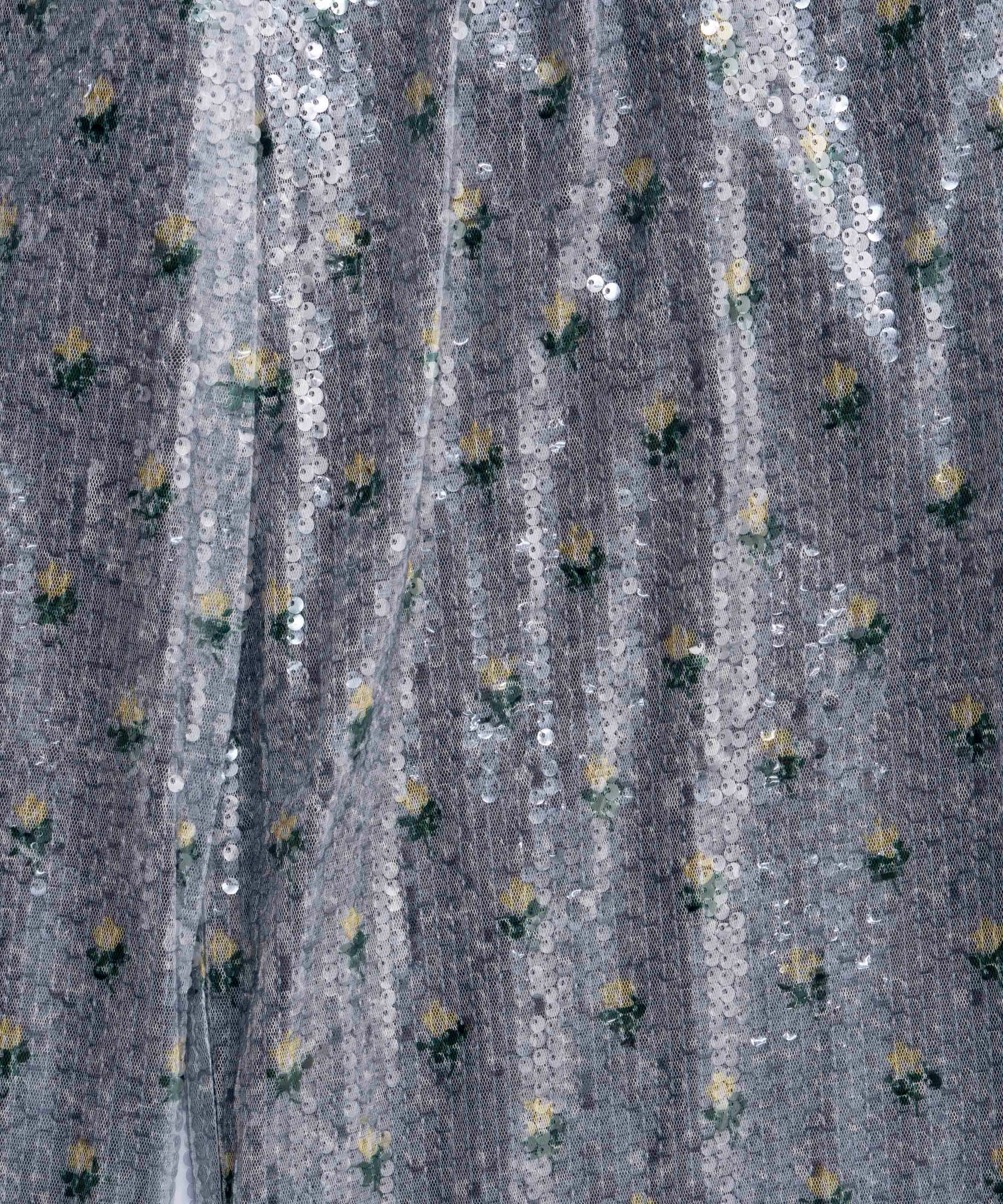 ・クリアなスパンコールファブリックの上から、ブランドオリジナルカラーで描いたフラワープリントを施した特別な素材を使用。
