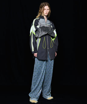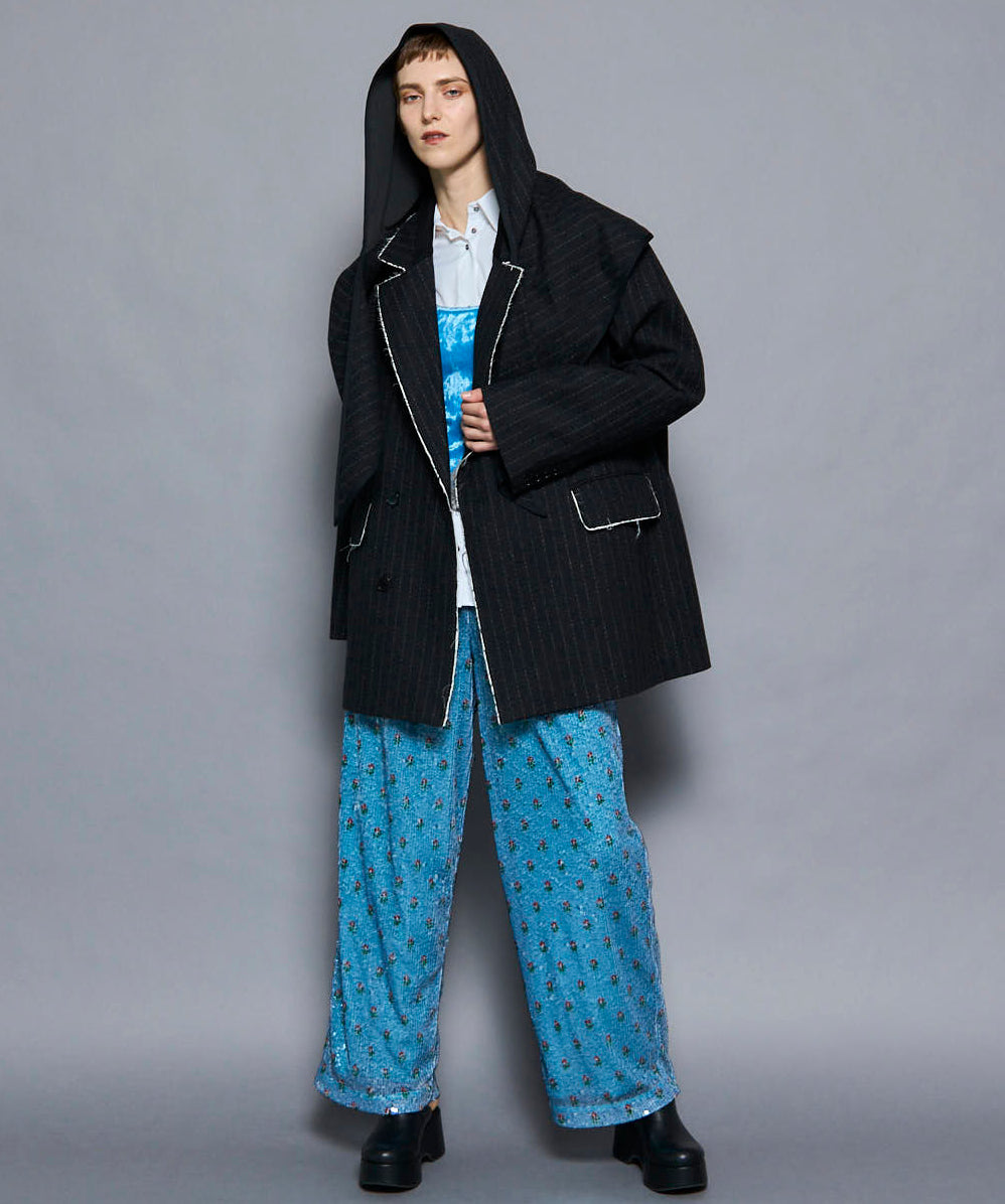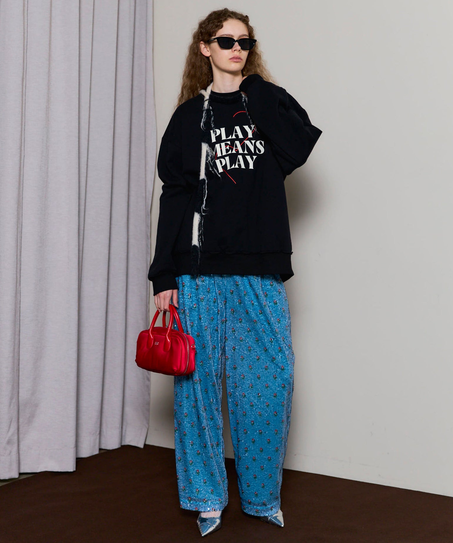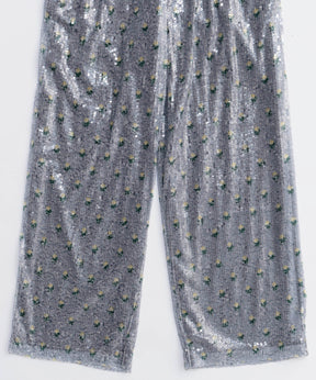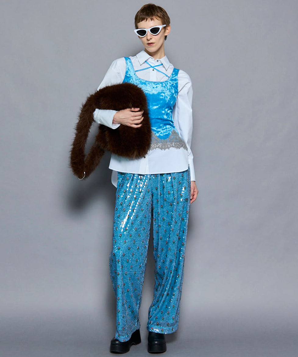 ・クリアなスパンコールファブリックの上から、ブランドオリジナルカラーで描いたフラワープリントを施した特別な素材を使用。