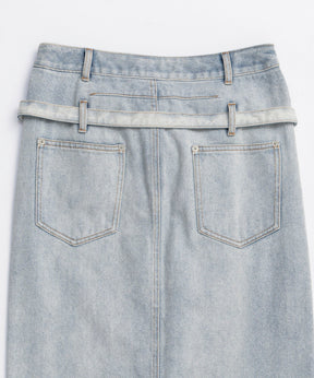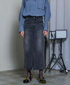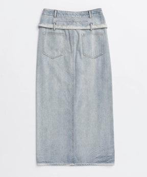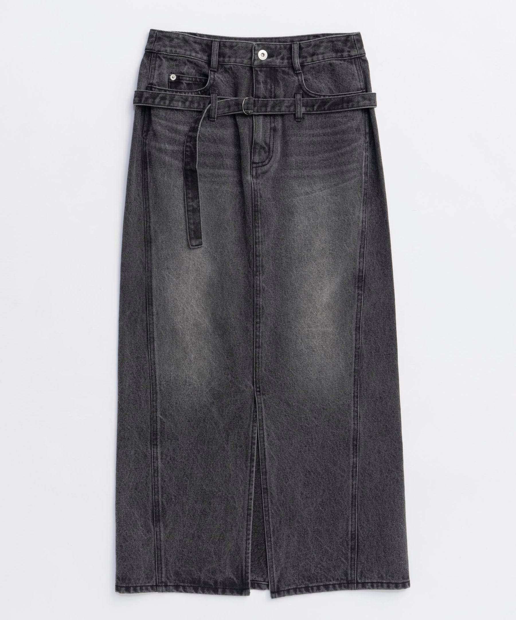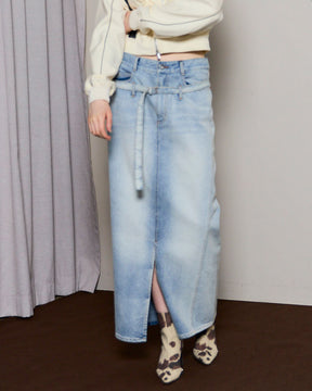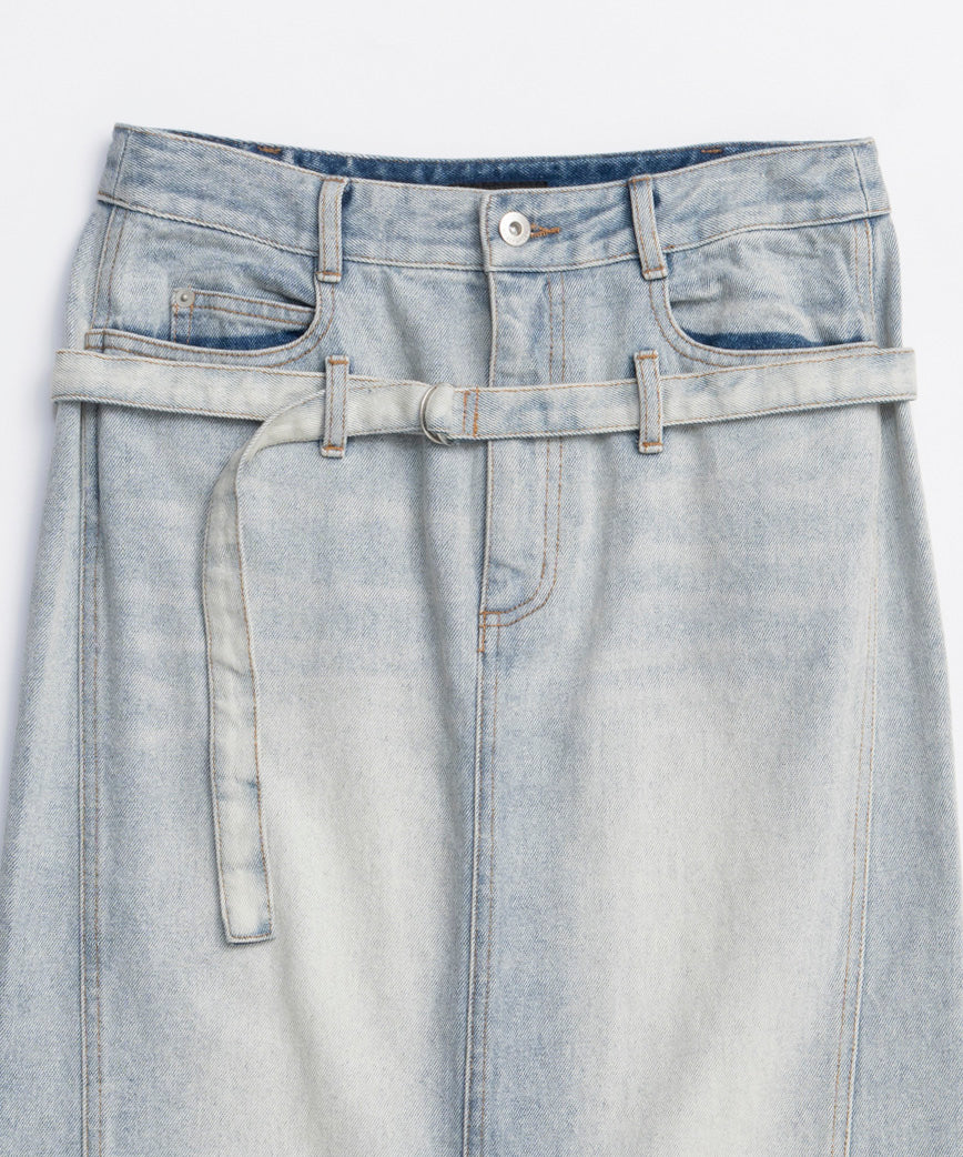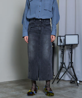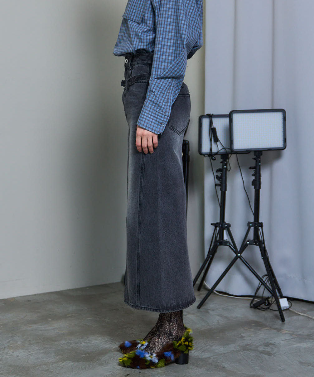 ・ベルトを胸下で閉めるハイウエストでの着用と、ローウエストの着用が可能な2ウエスト仕様がポイントのデニムスカート。