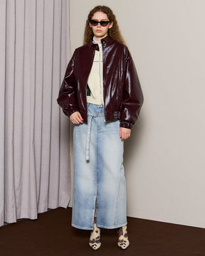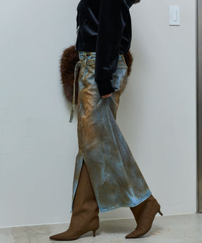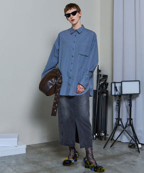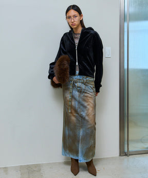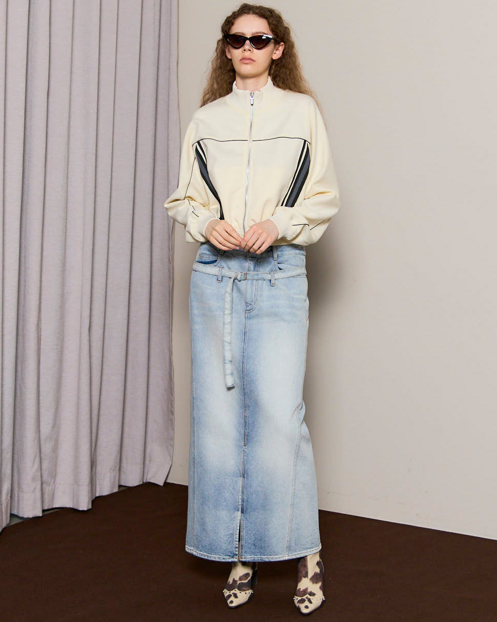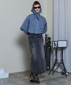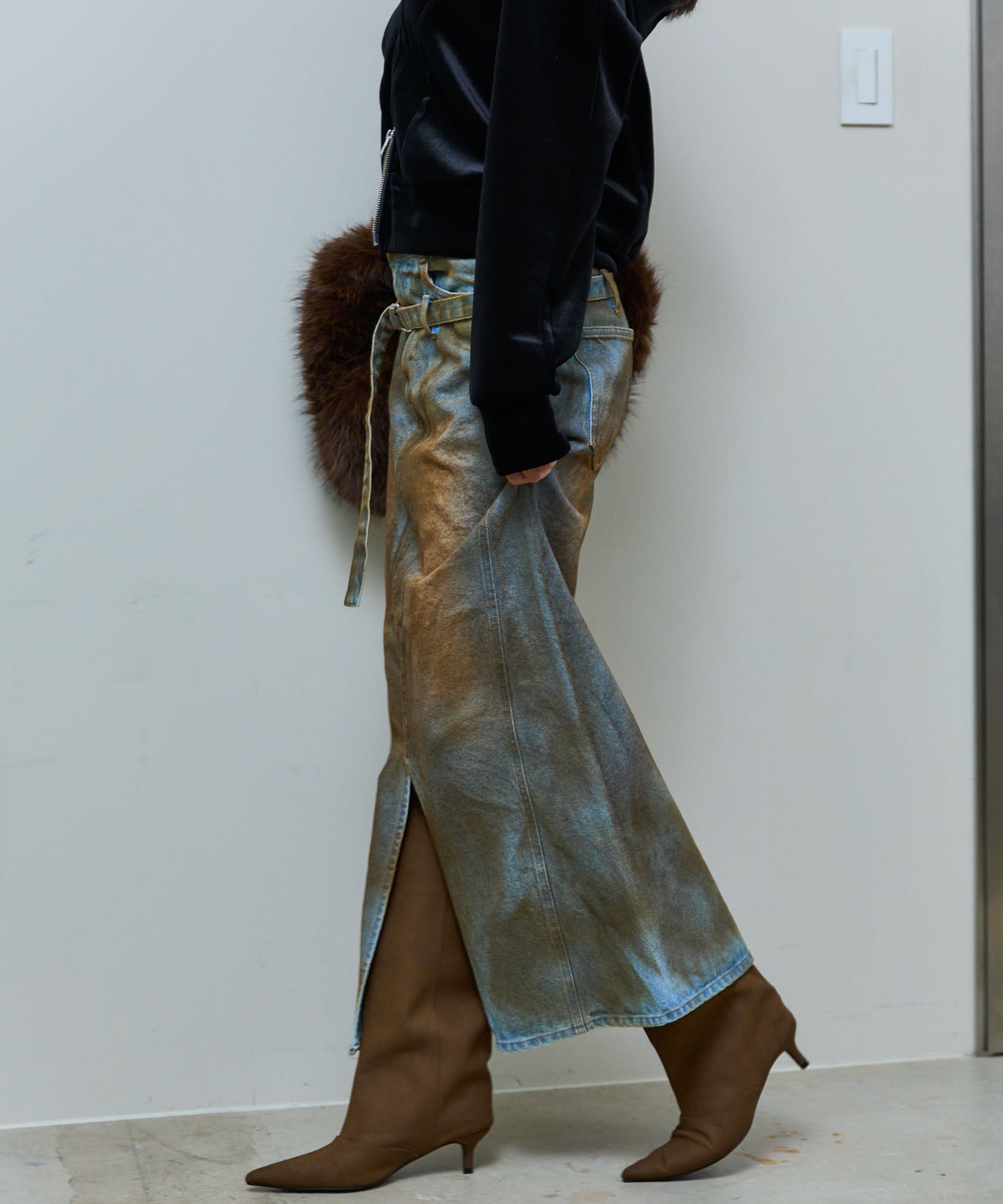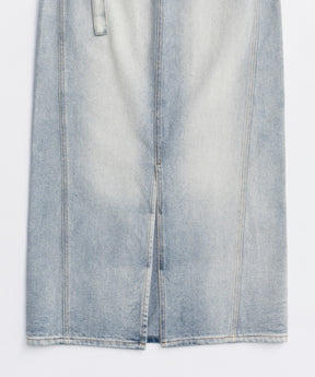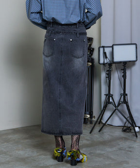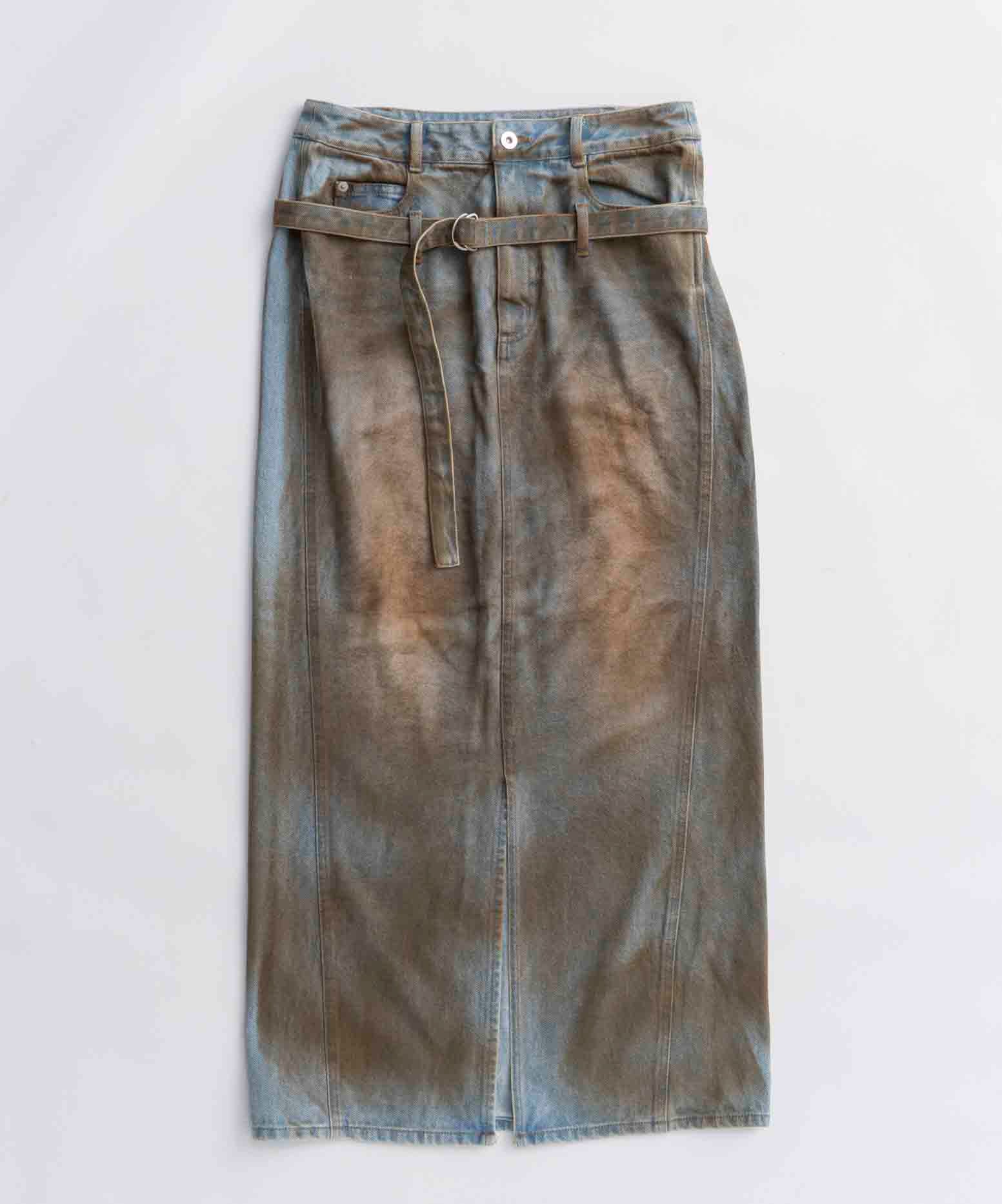・ベルトを胸下で閉めるハイウエストでの着用と、ローウエストの着用が可能な2ウエスト仕様がポイントのデニムスカート。