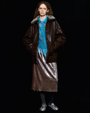 【BRN】シルバーのスパンコールと、オレンジ・ブラウン系のスパンコールのミックス柄がポイントのキャッチーな素材を使用。