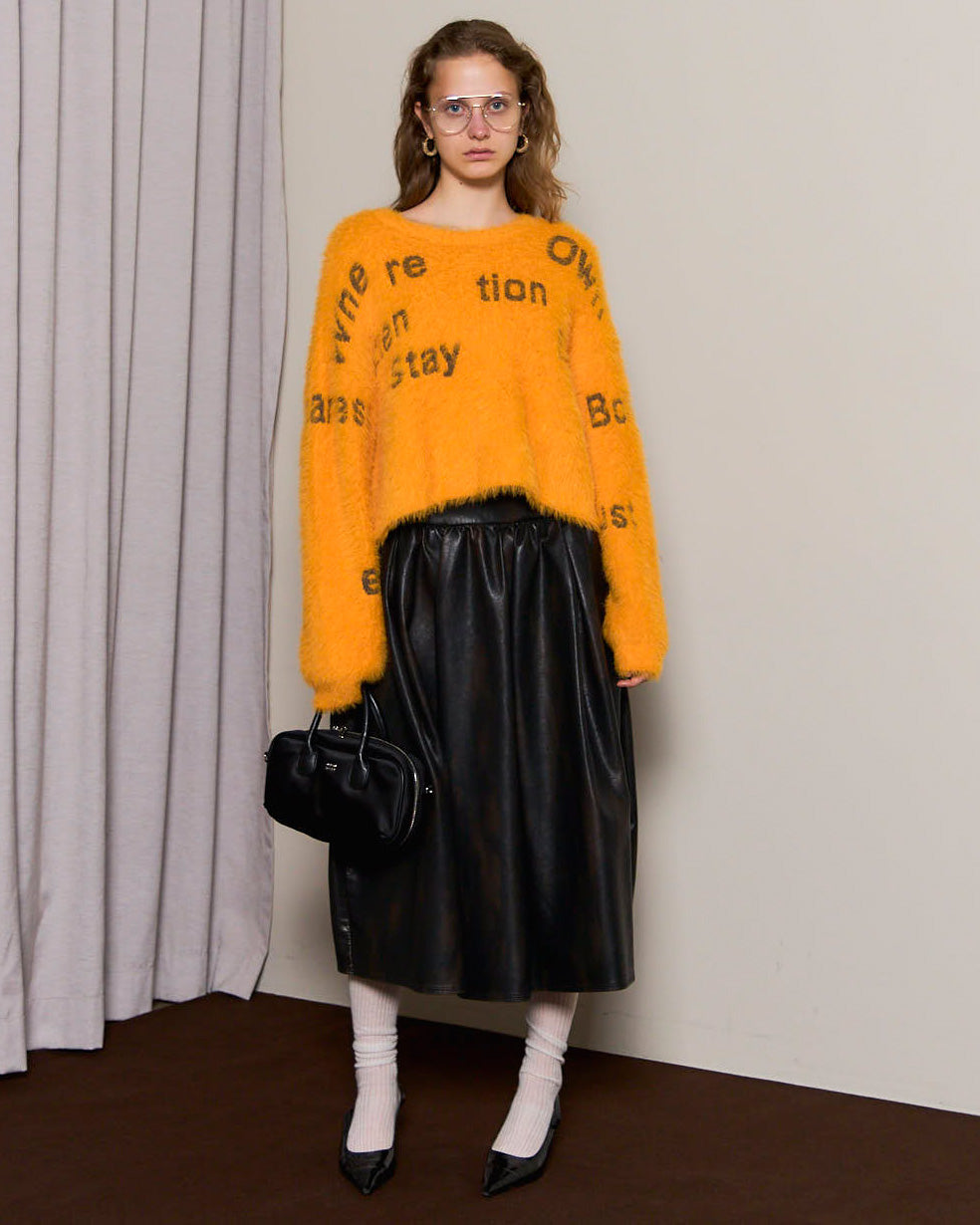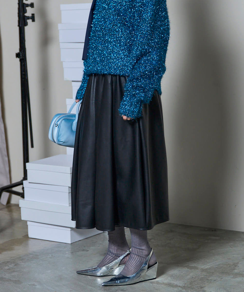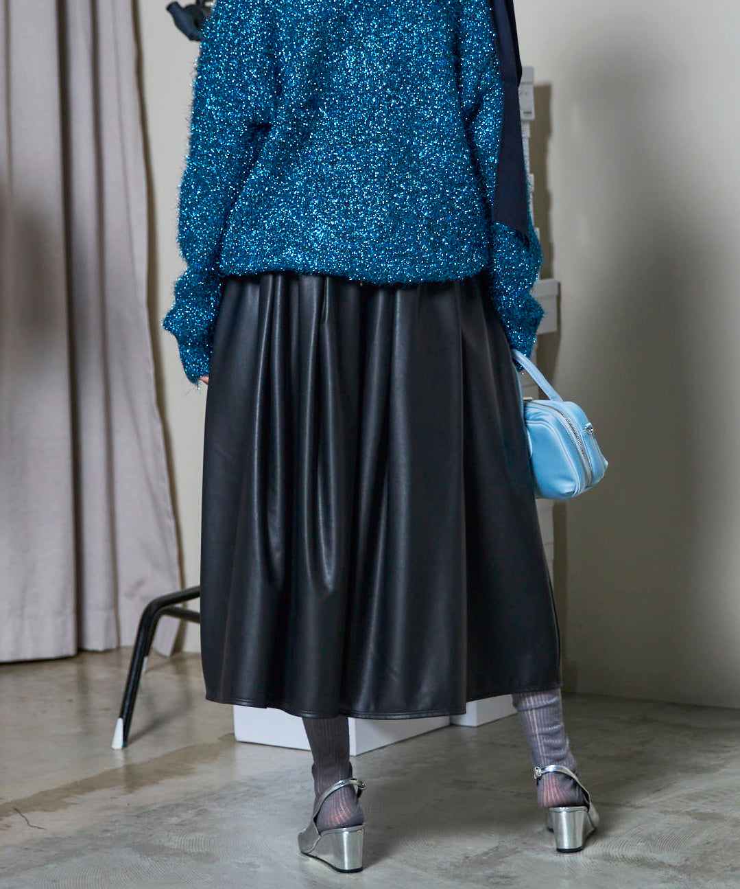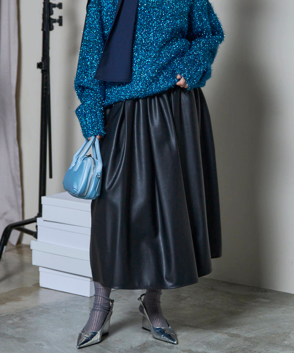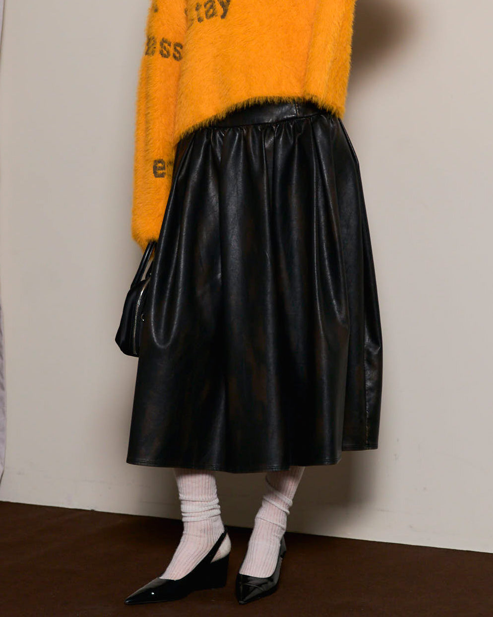 ・旬なヴィーガンレザー素材を使用した、今年らしさ満点のミモレ丈スカート。