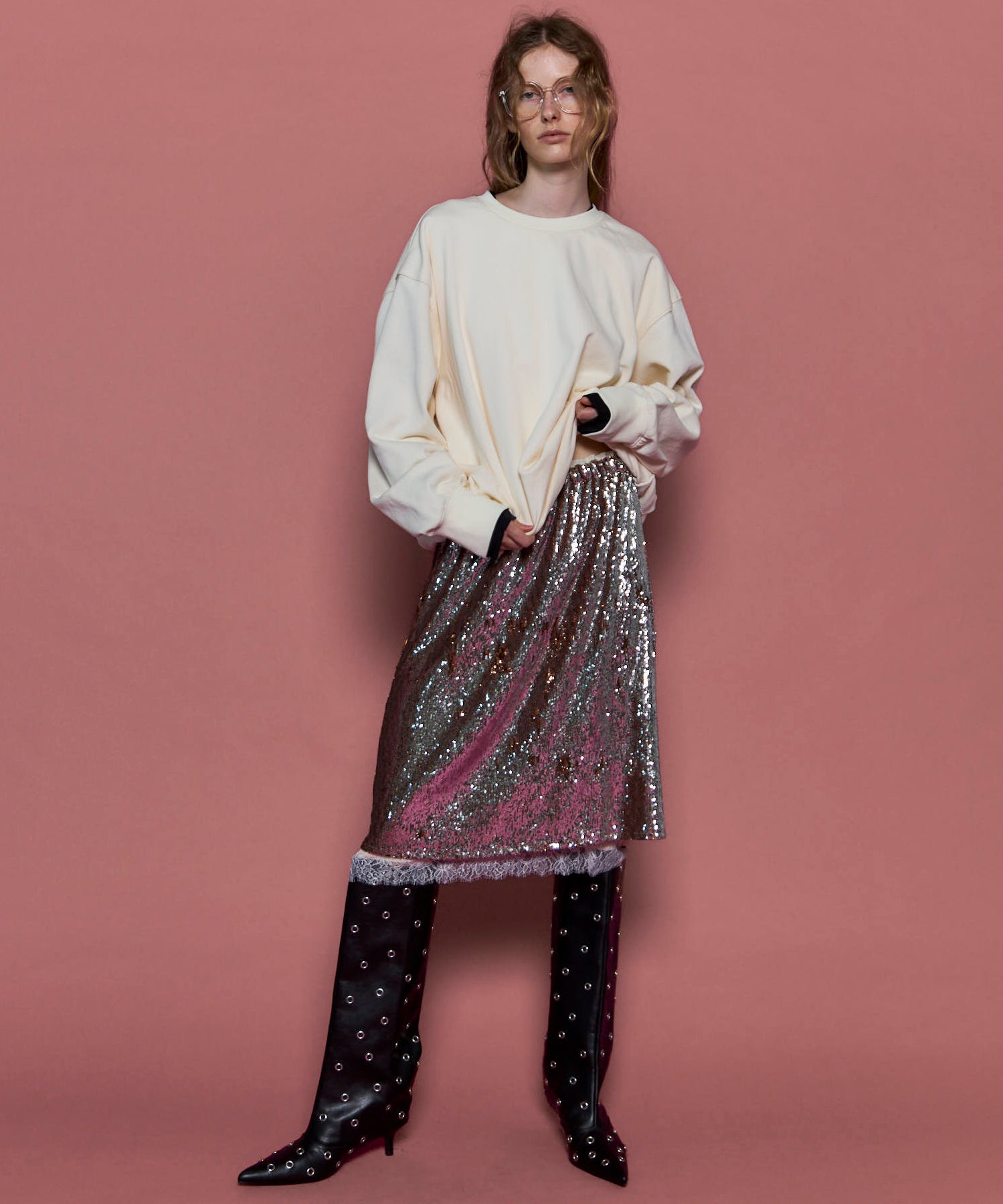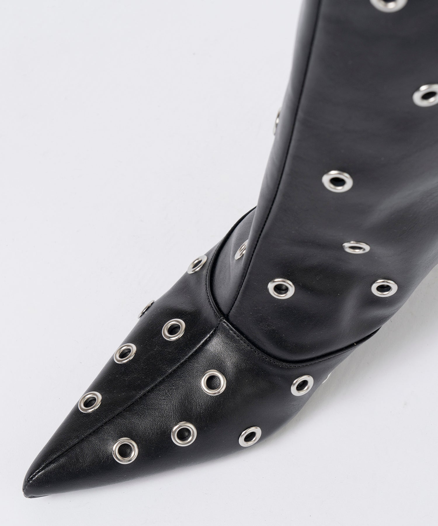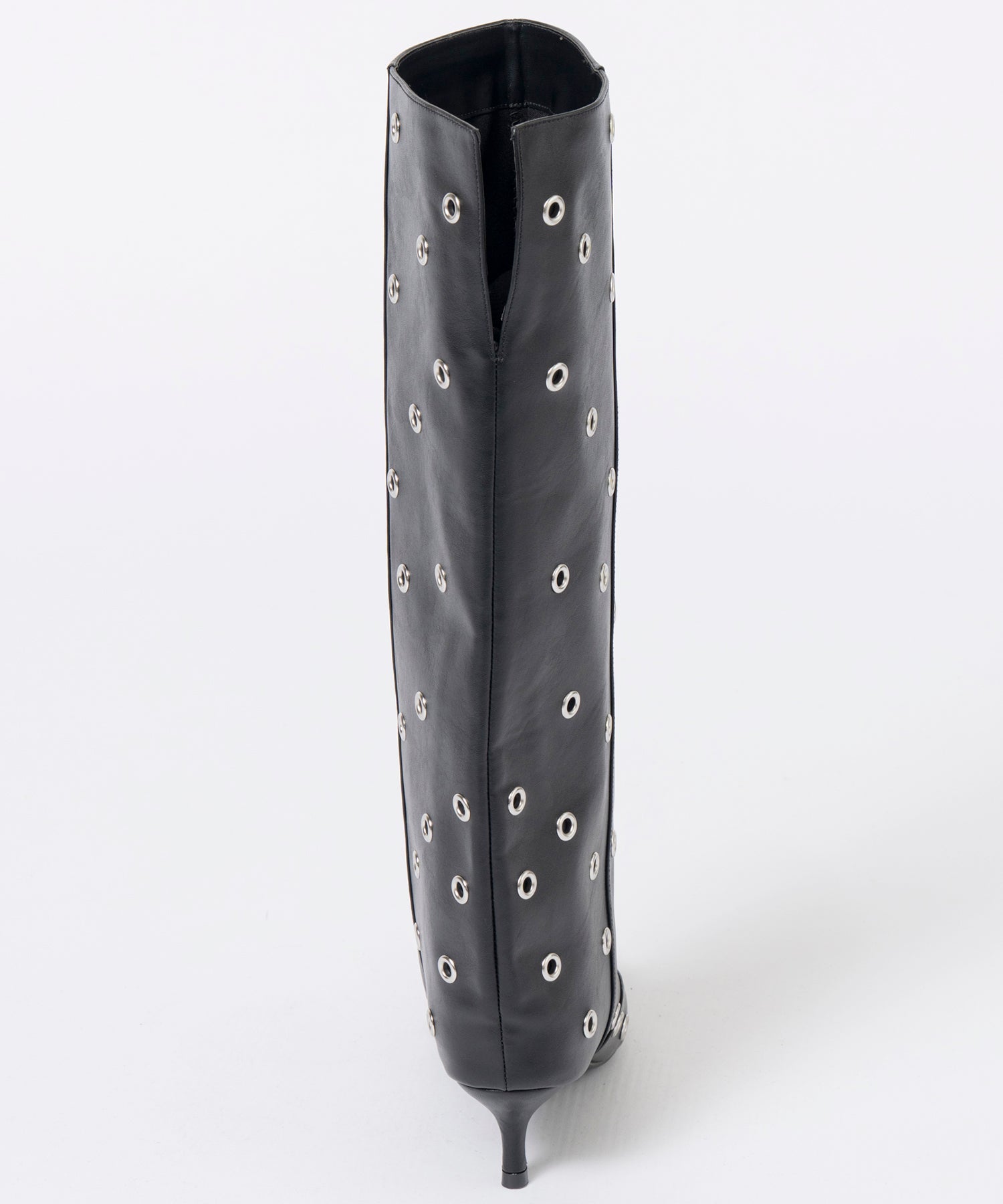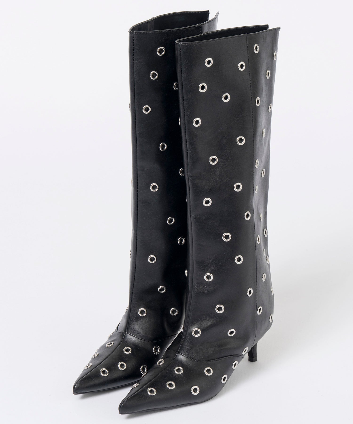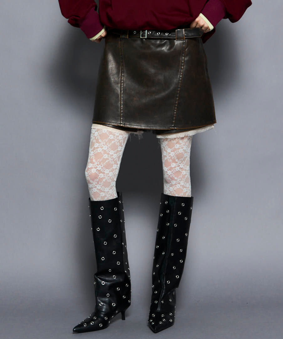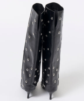 ■ルーズさがトレンド感のあるロングブーツはスタッズでエッジの効いた一足に。