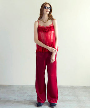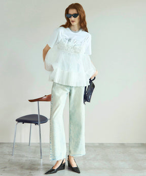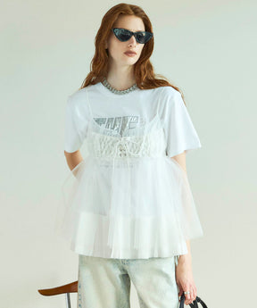 - 将薄纱花边夹在胸部下方,下摆的褶皱由用平板线制成的质朴材料制成。