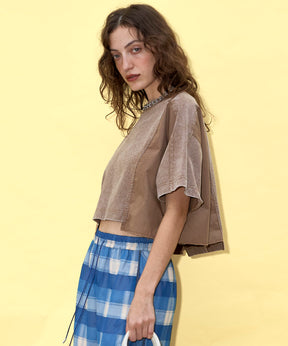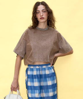 - 碰撞组合T恤和时尚的感觉,结合了来自不同材料的对接和损坏处理。