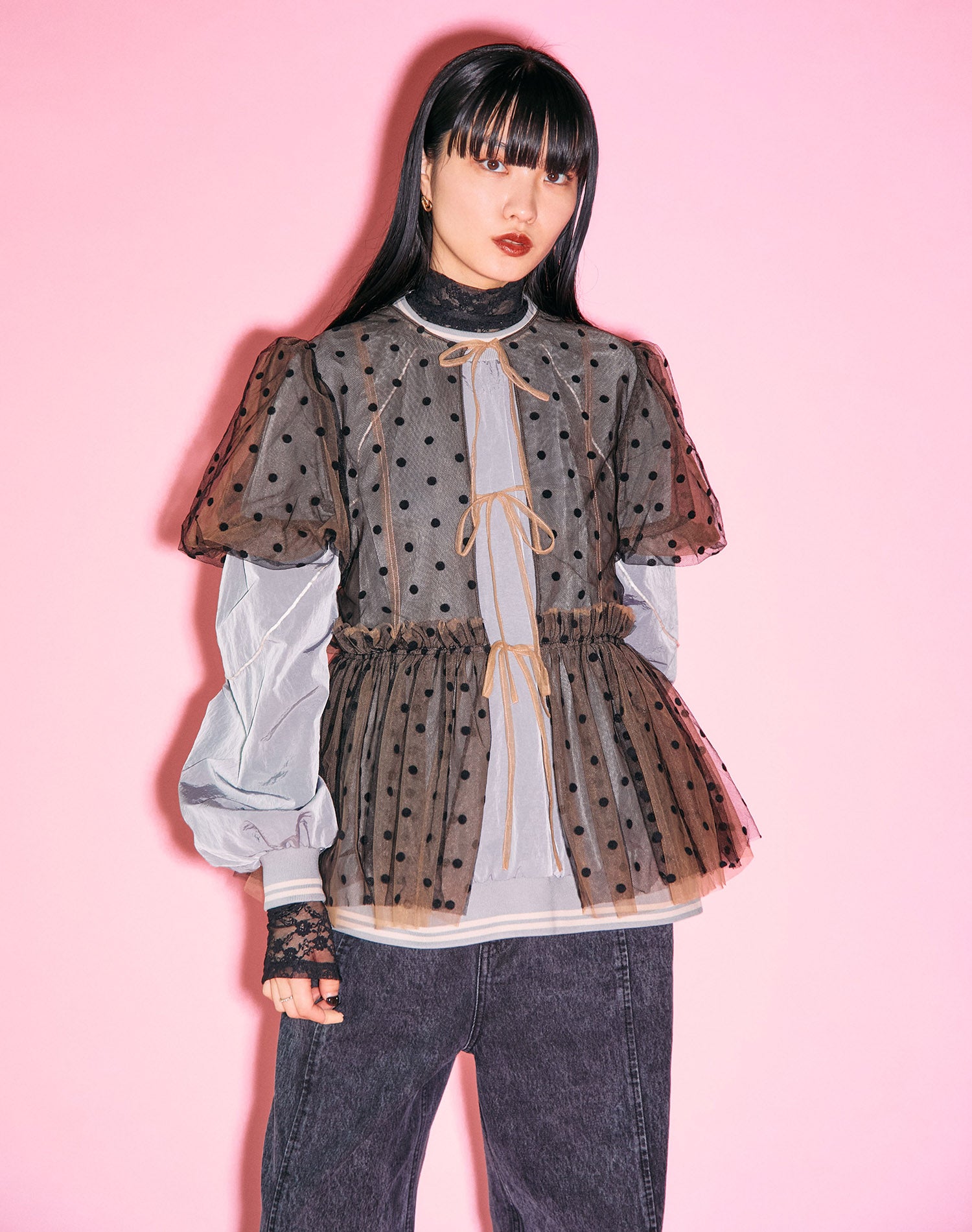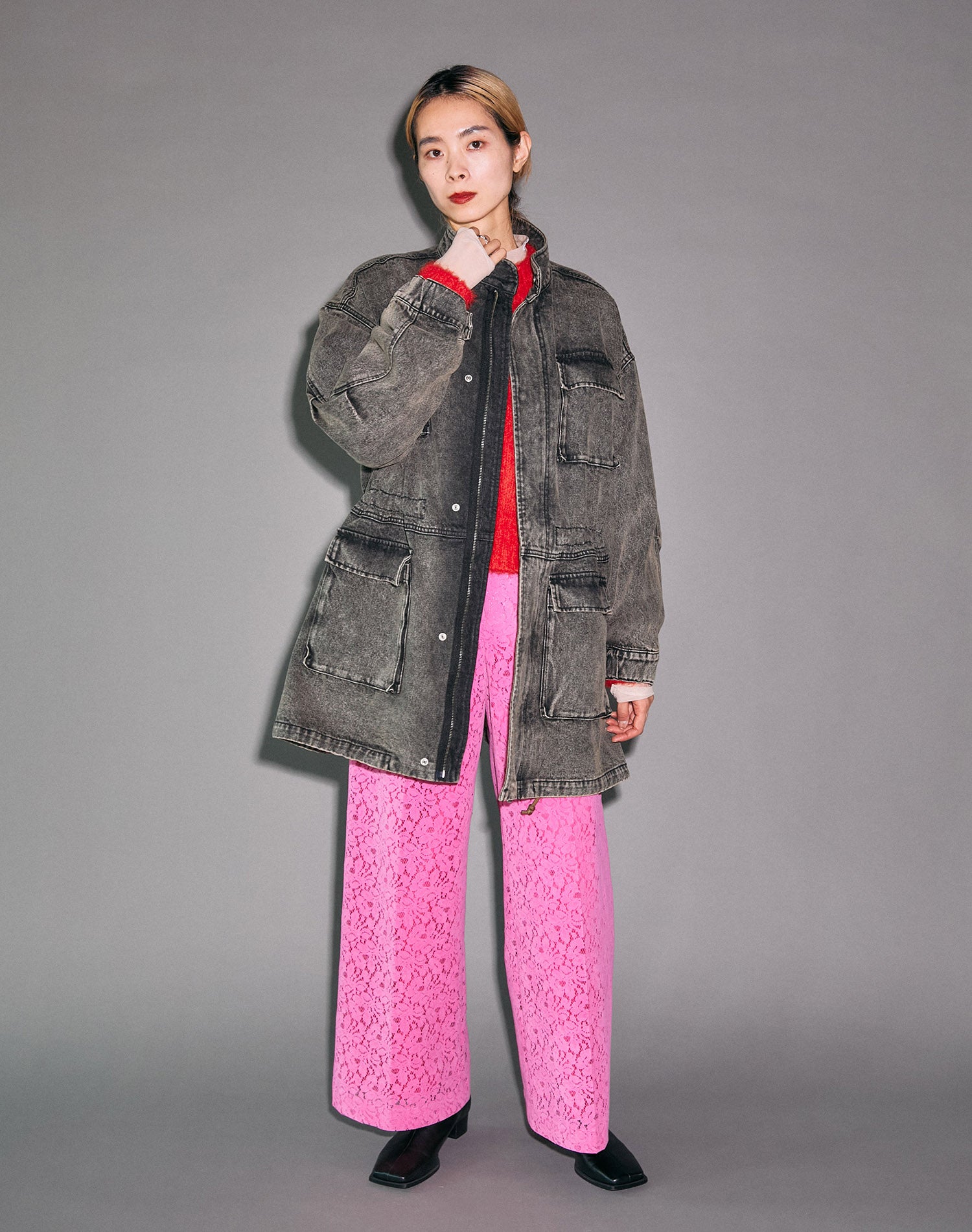 洗淨的牛仔布,蕾絲褲子,男人的剪影是女性的,顏色和材料。
