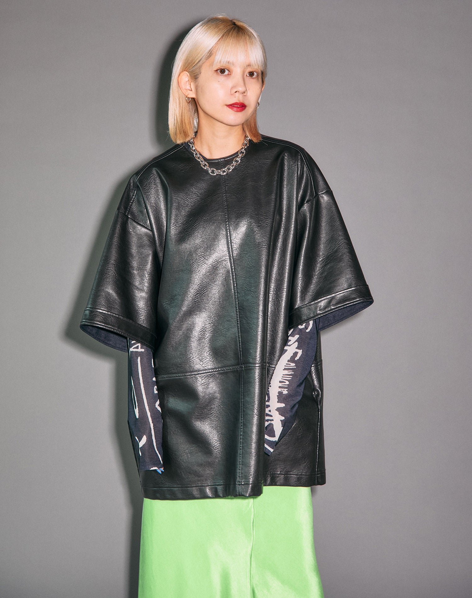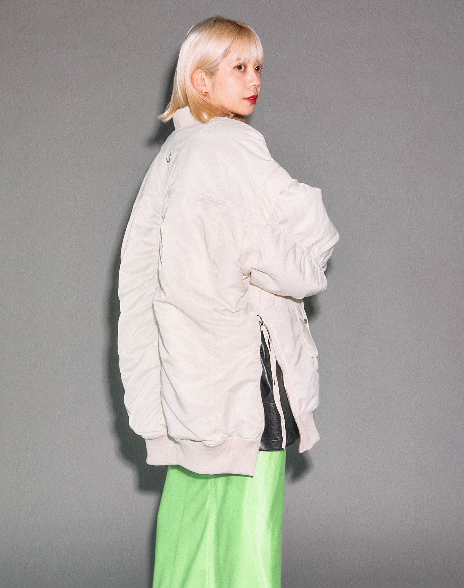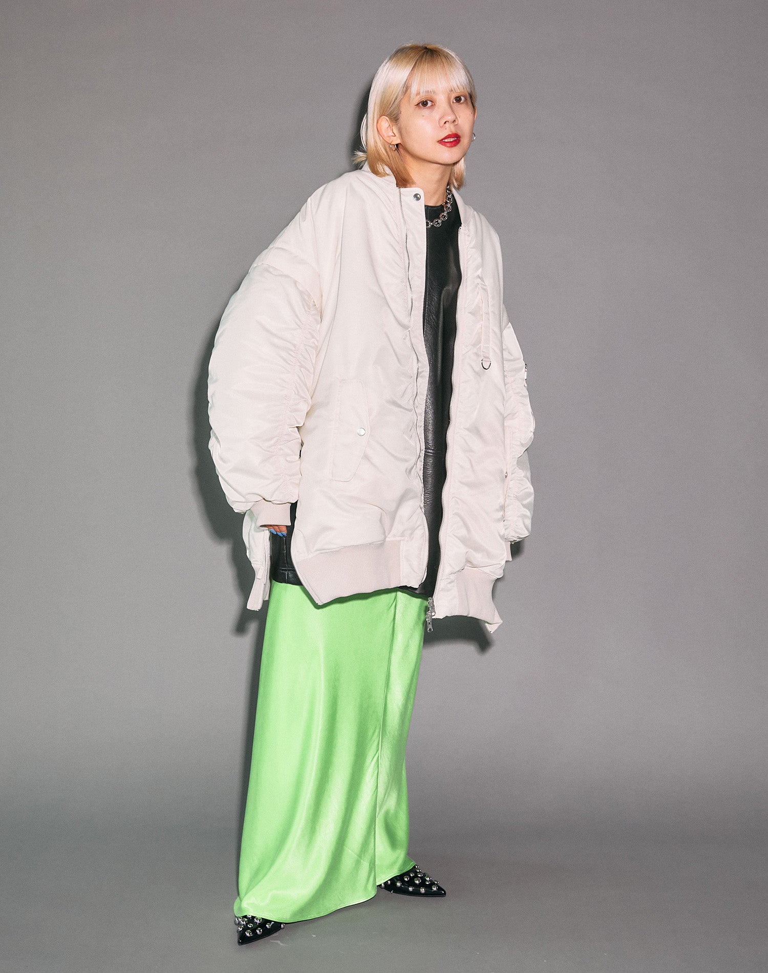 用白色X綠色淺色造型。纖細的材料裙子增加了女性氣質。