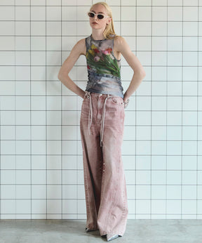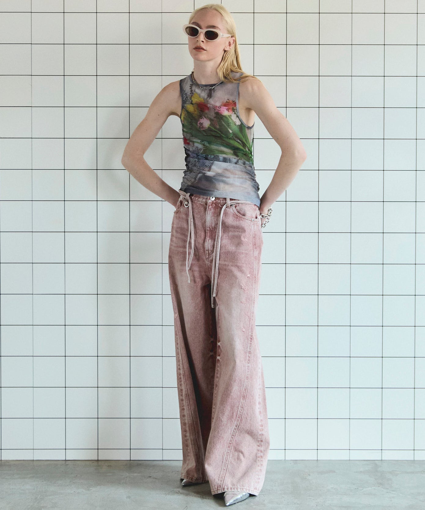 降低靛蓝牛仔裤的颜色,再加上夸张的装饰,打造出具有朦胧感的独特色调。